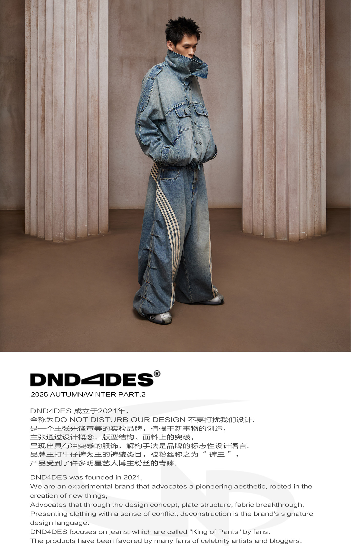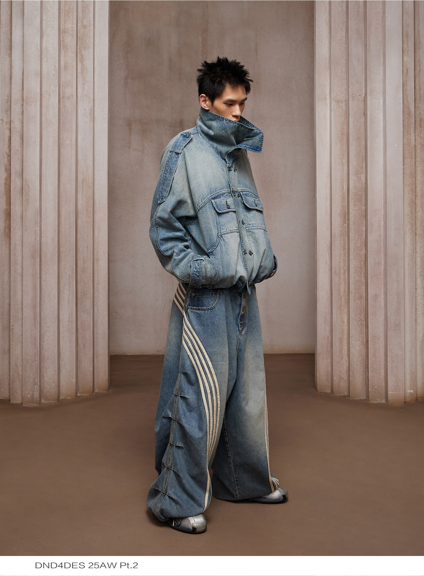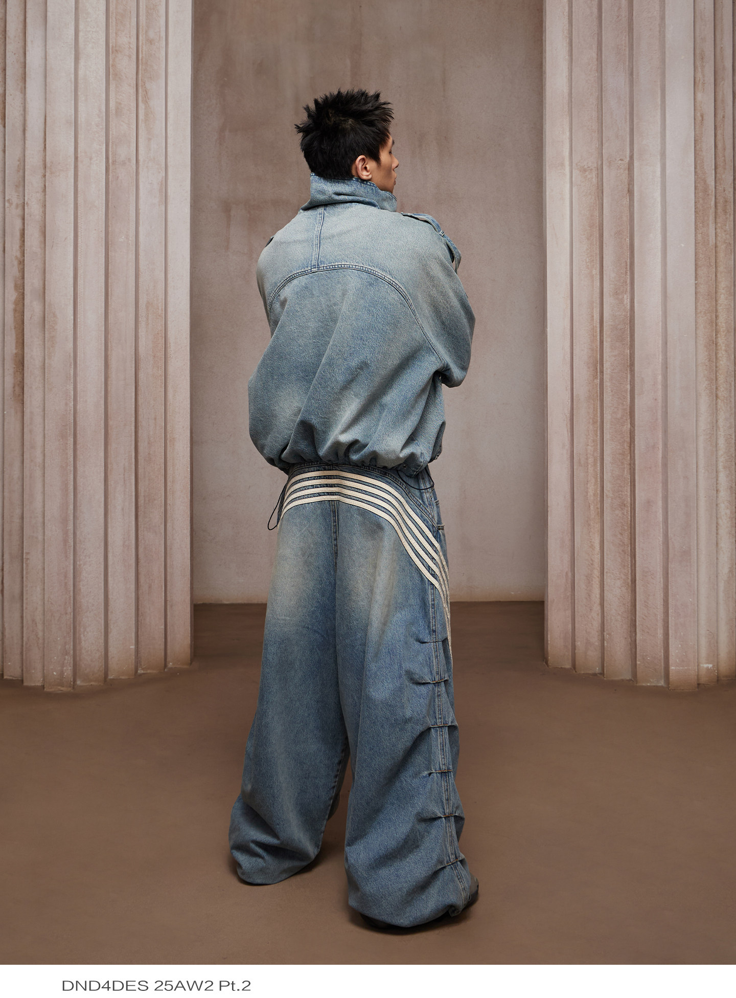 Dnd4Des American-Style Heavy-Duty Washed Vintage Double-Breasted Multi-Pocket Short Wide Denim Jacket with Stand Collar and Trench Coat Style