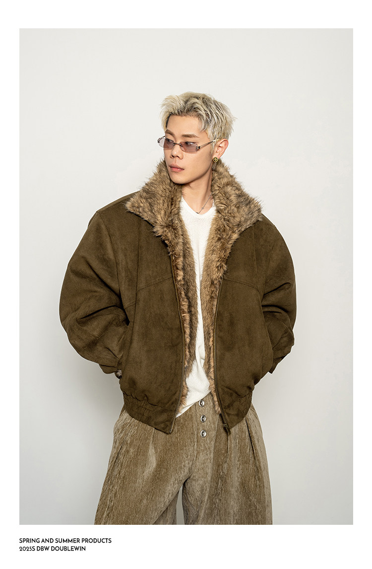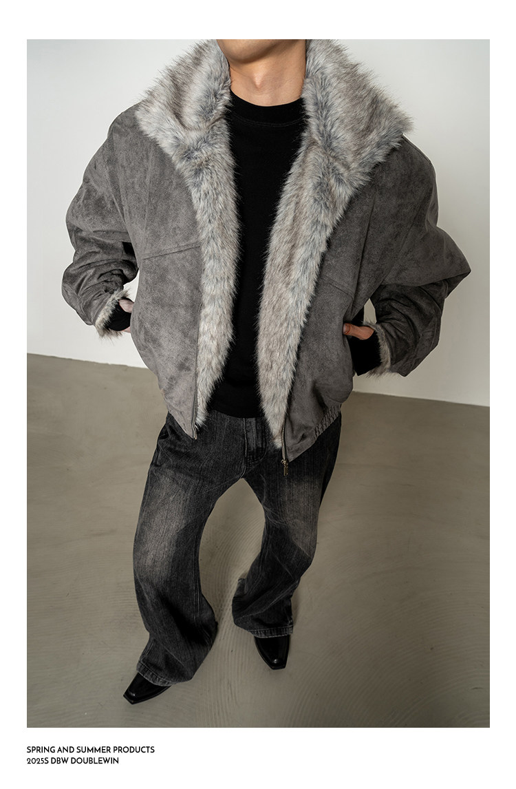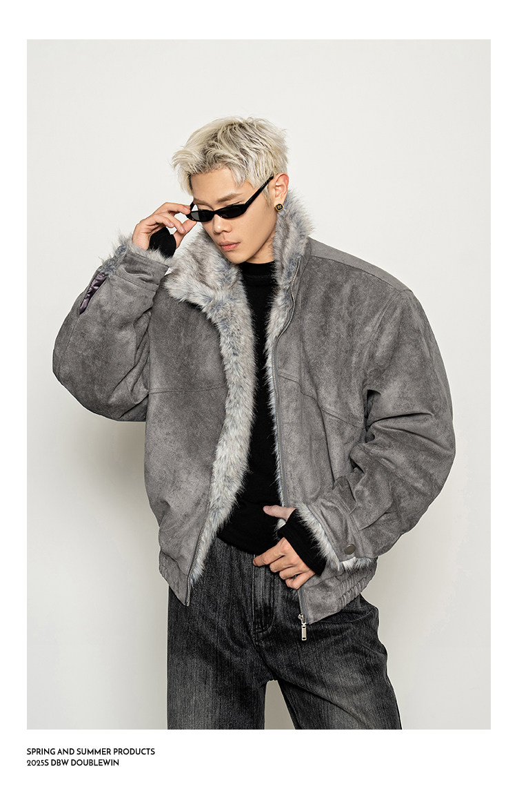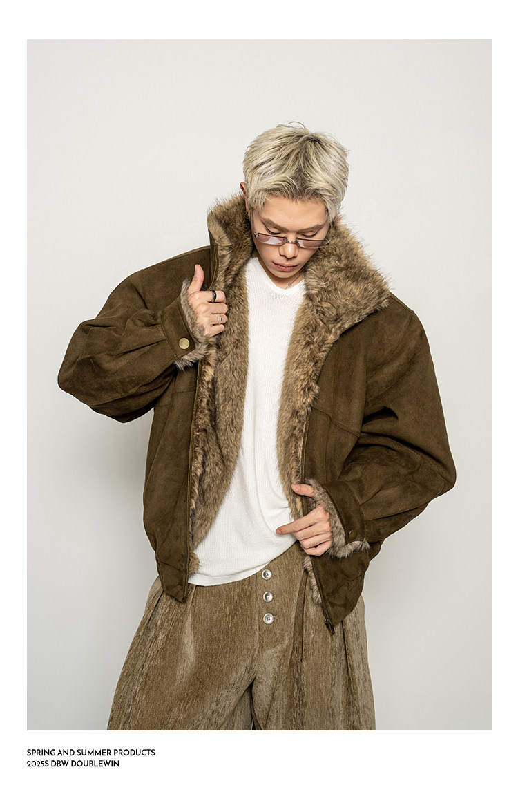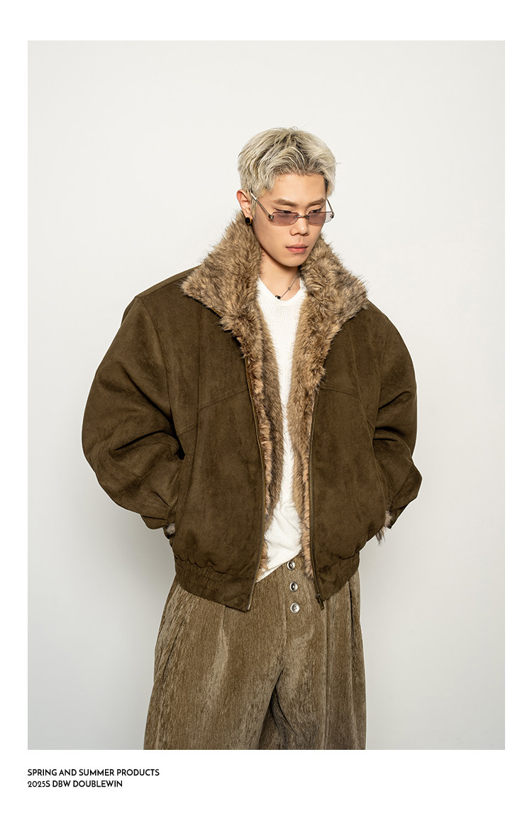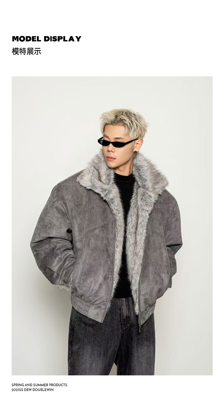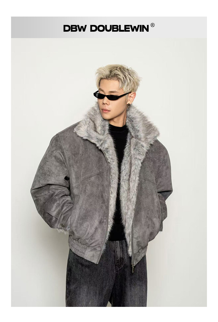 Dbw Doublewin Heavy Suede Faux Fox Fur Cotton Jacket Winter Loose Wide Shoulder Thick Coat