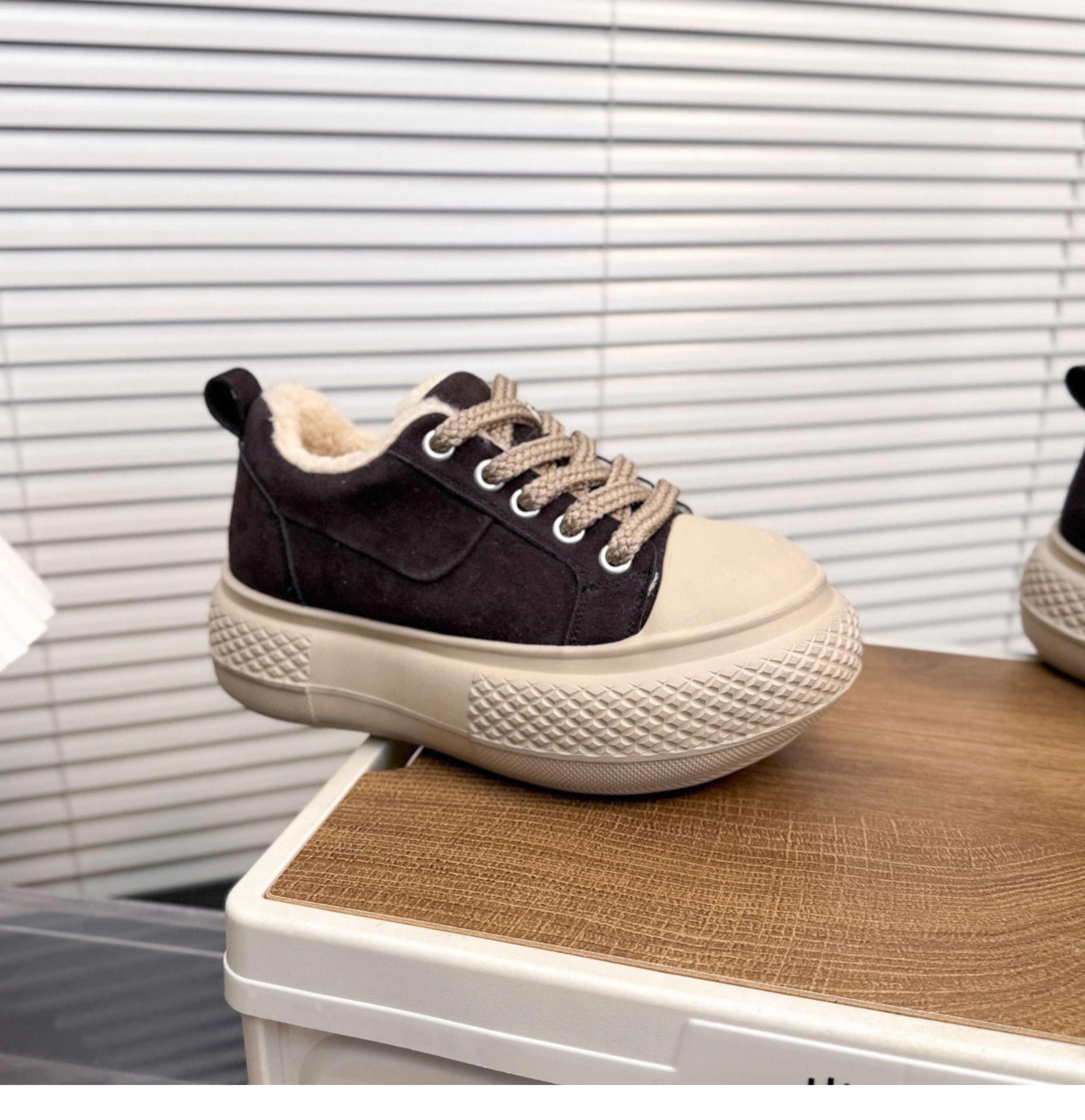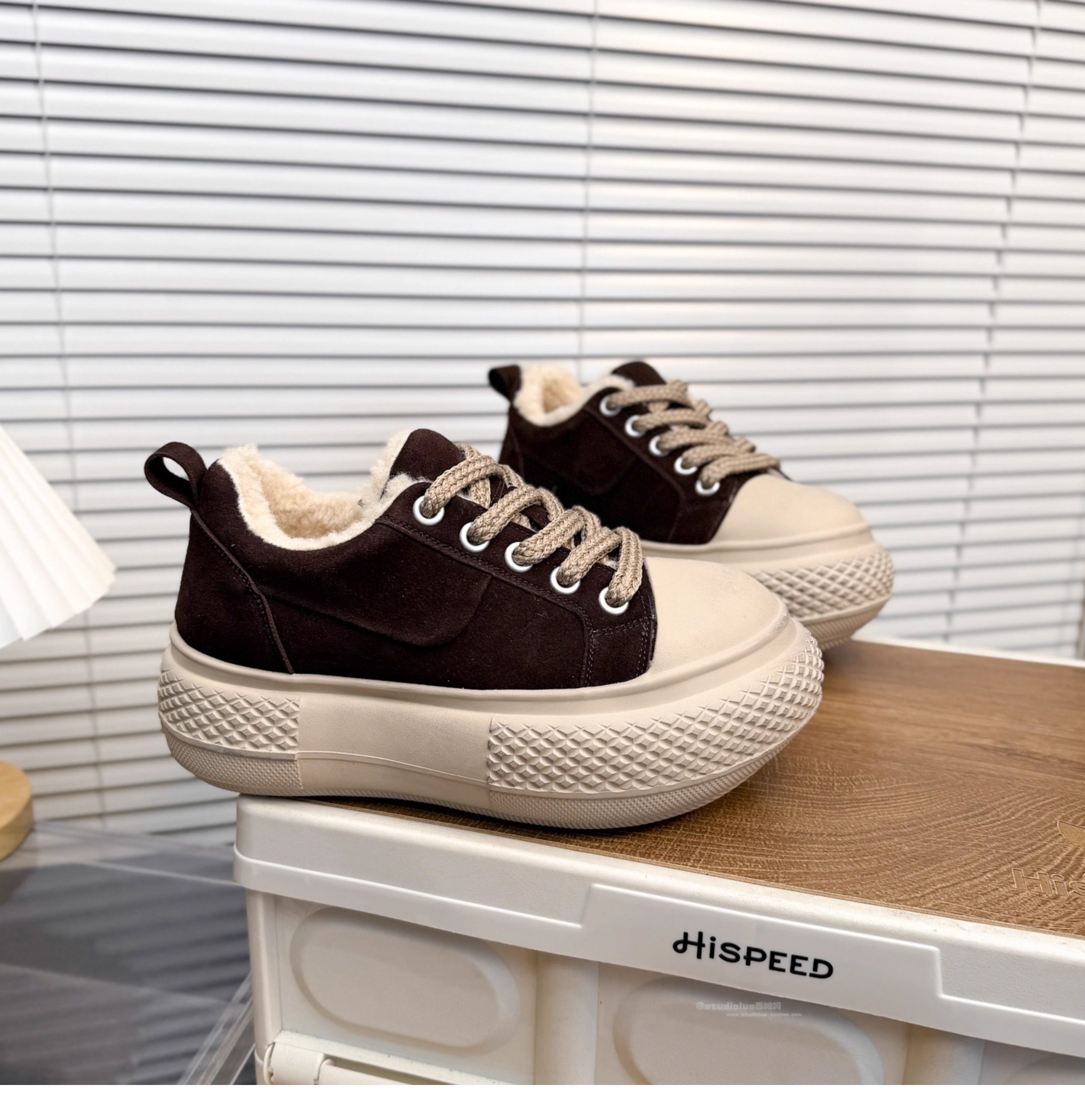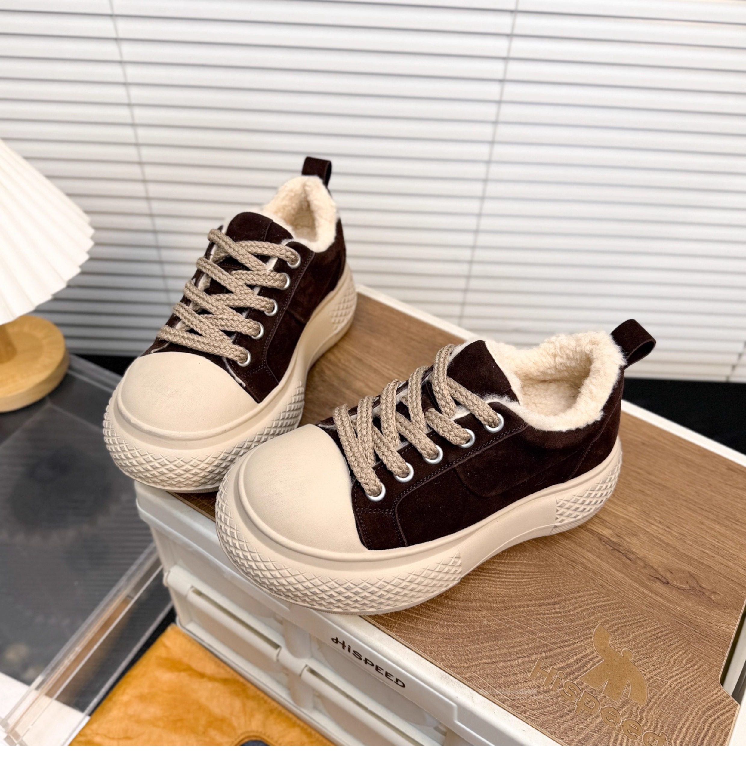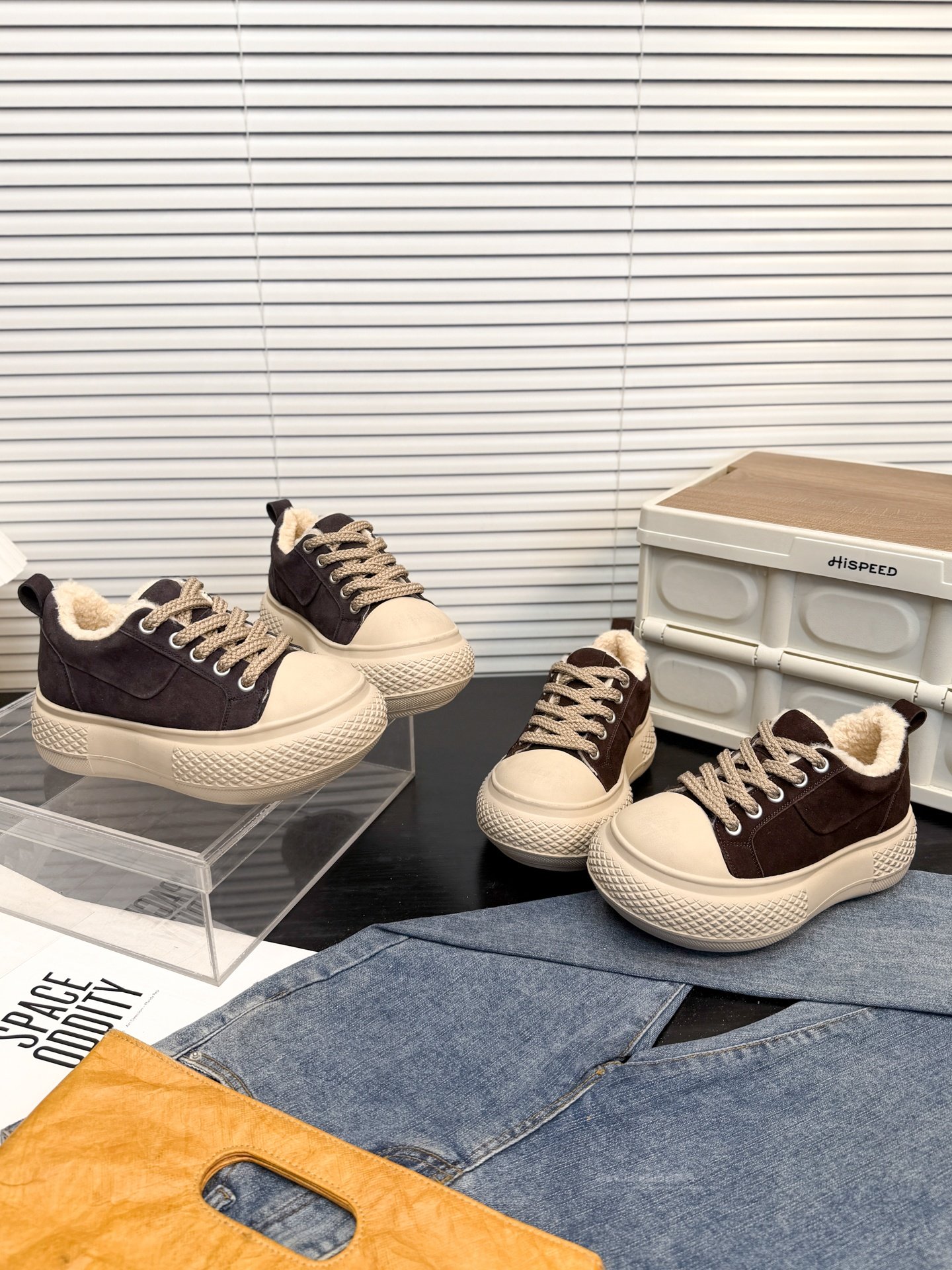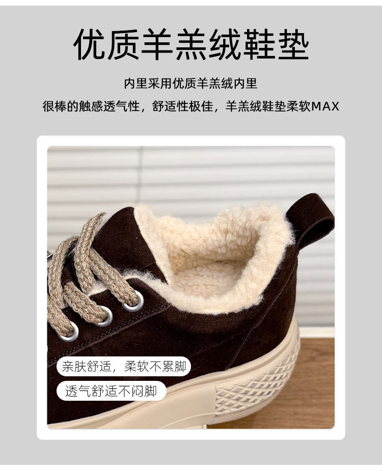 Hong Kong Style Suede Leather Large-Toe Plush-Lined Loafers for Women, 2025 Winter New Fashion Thick-Soled Height-Increasing Casual Sneakers