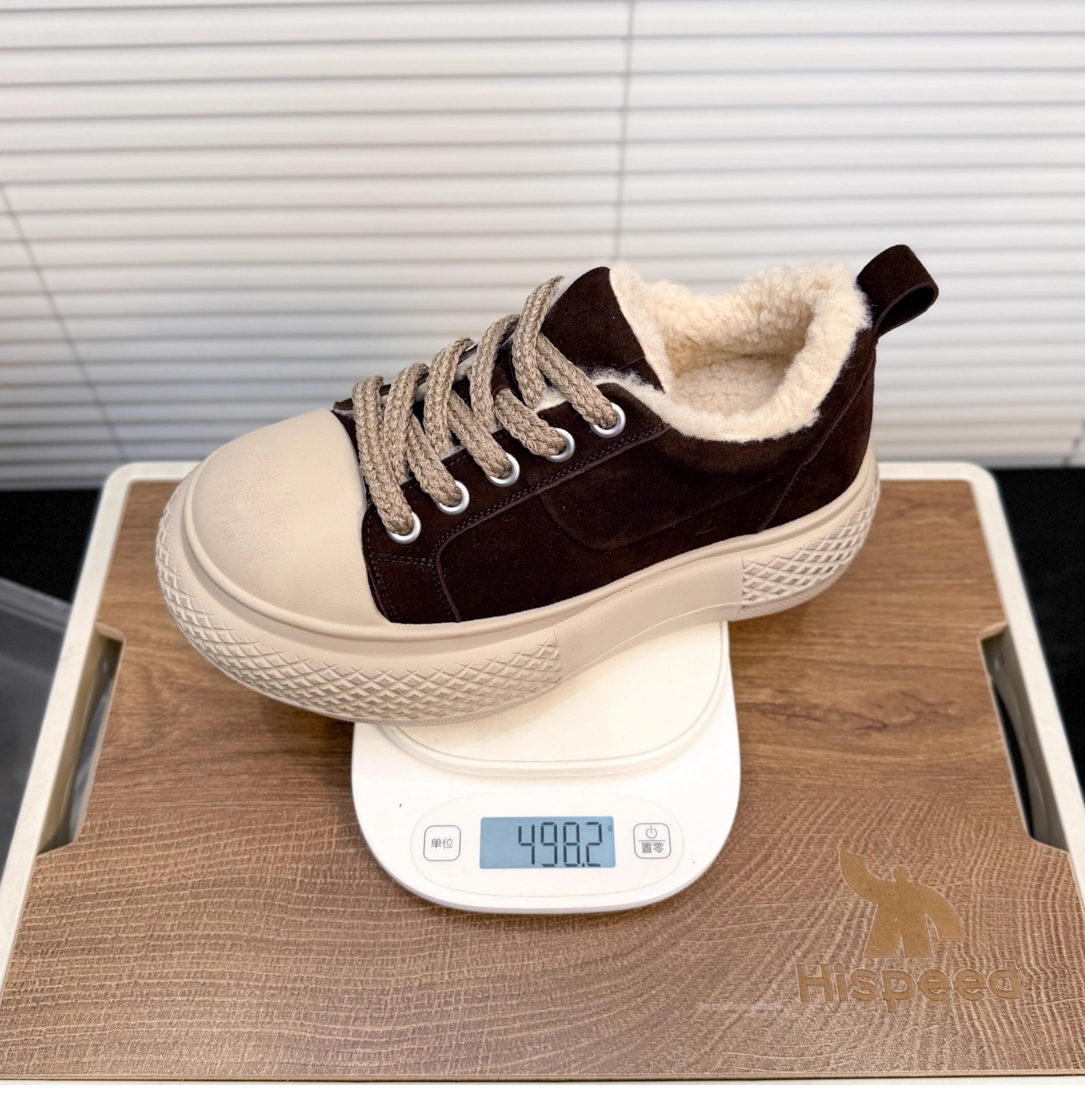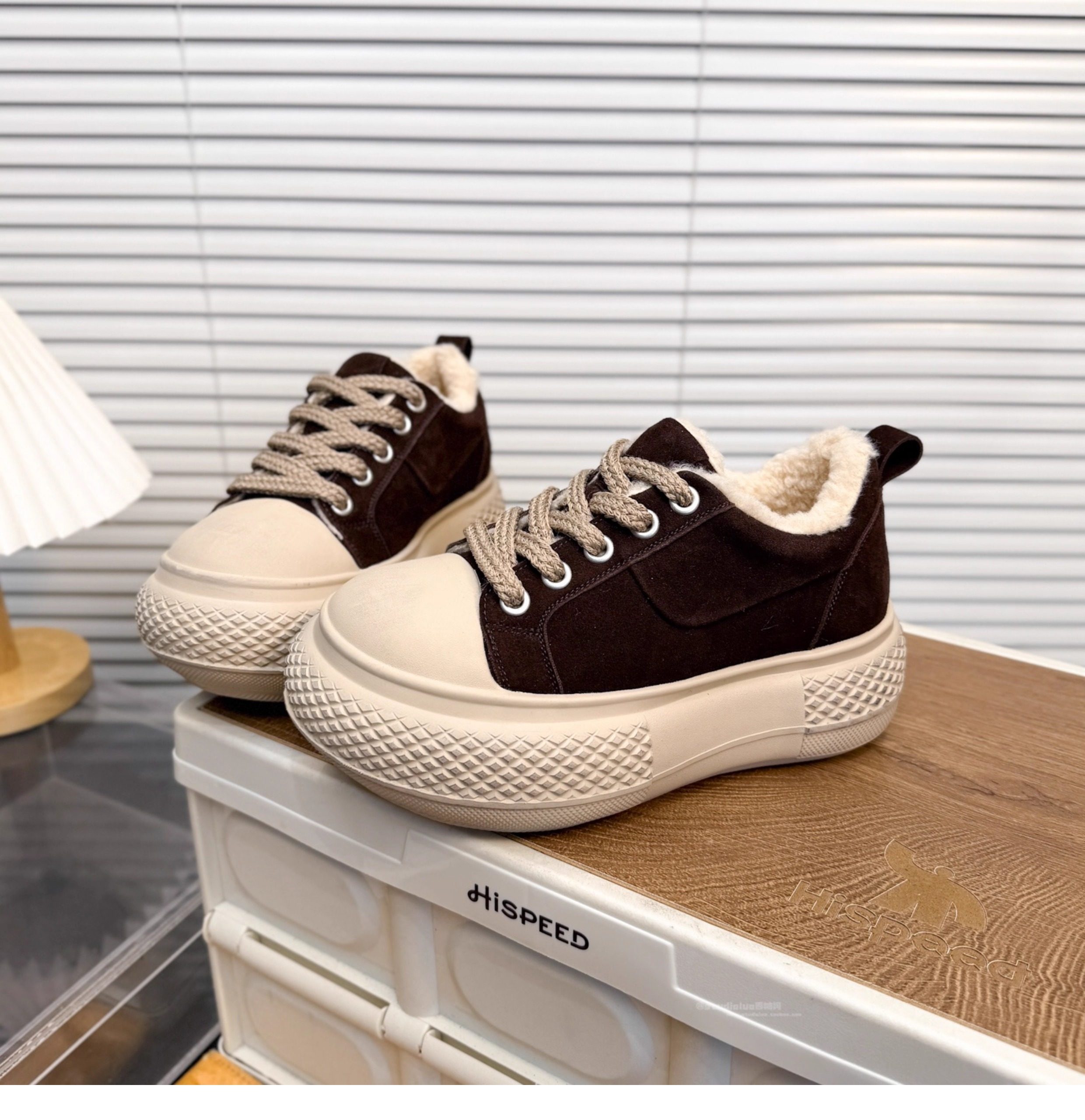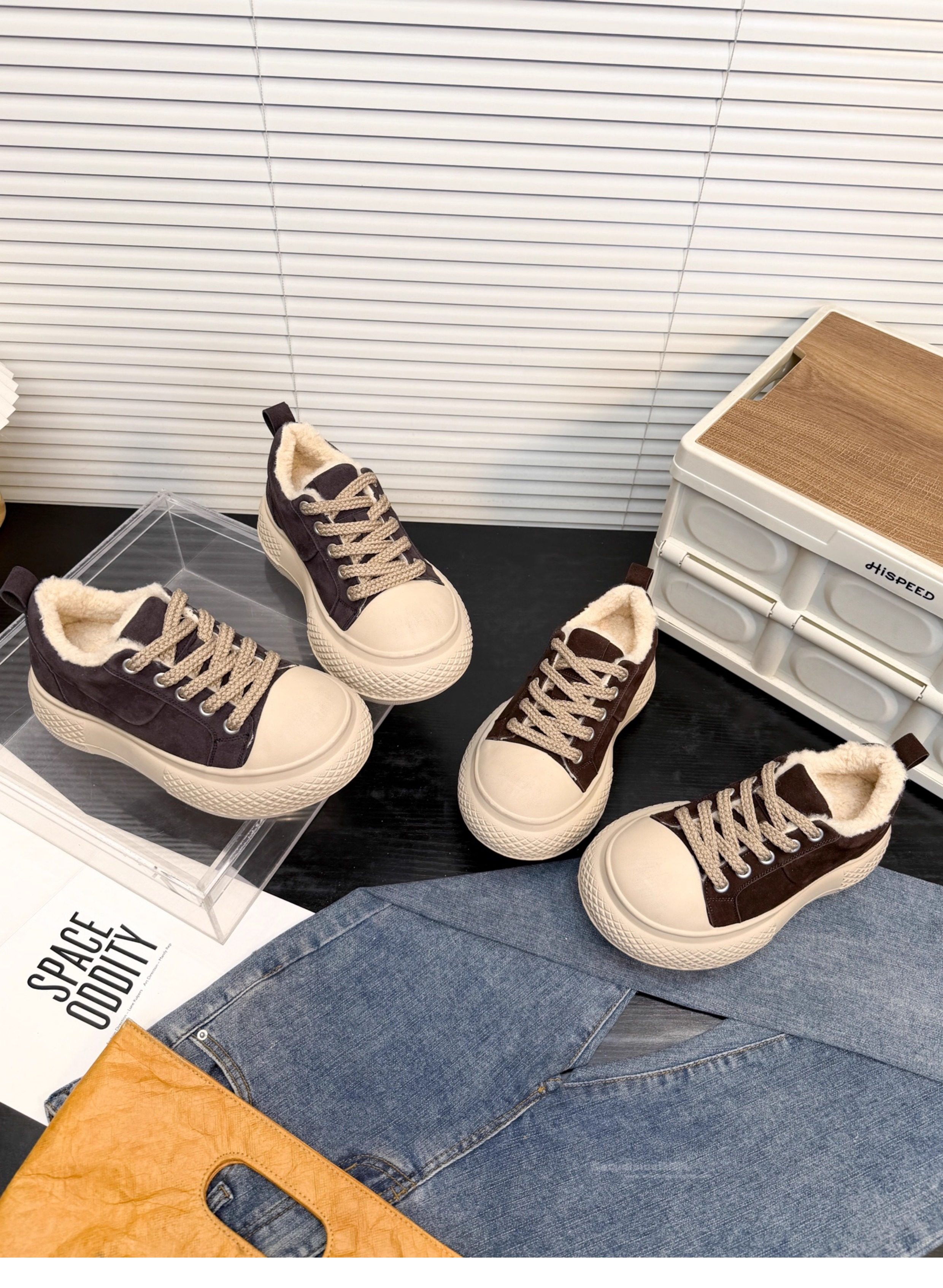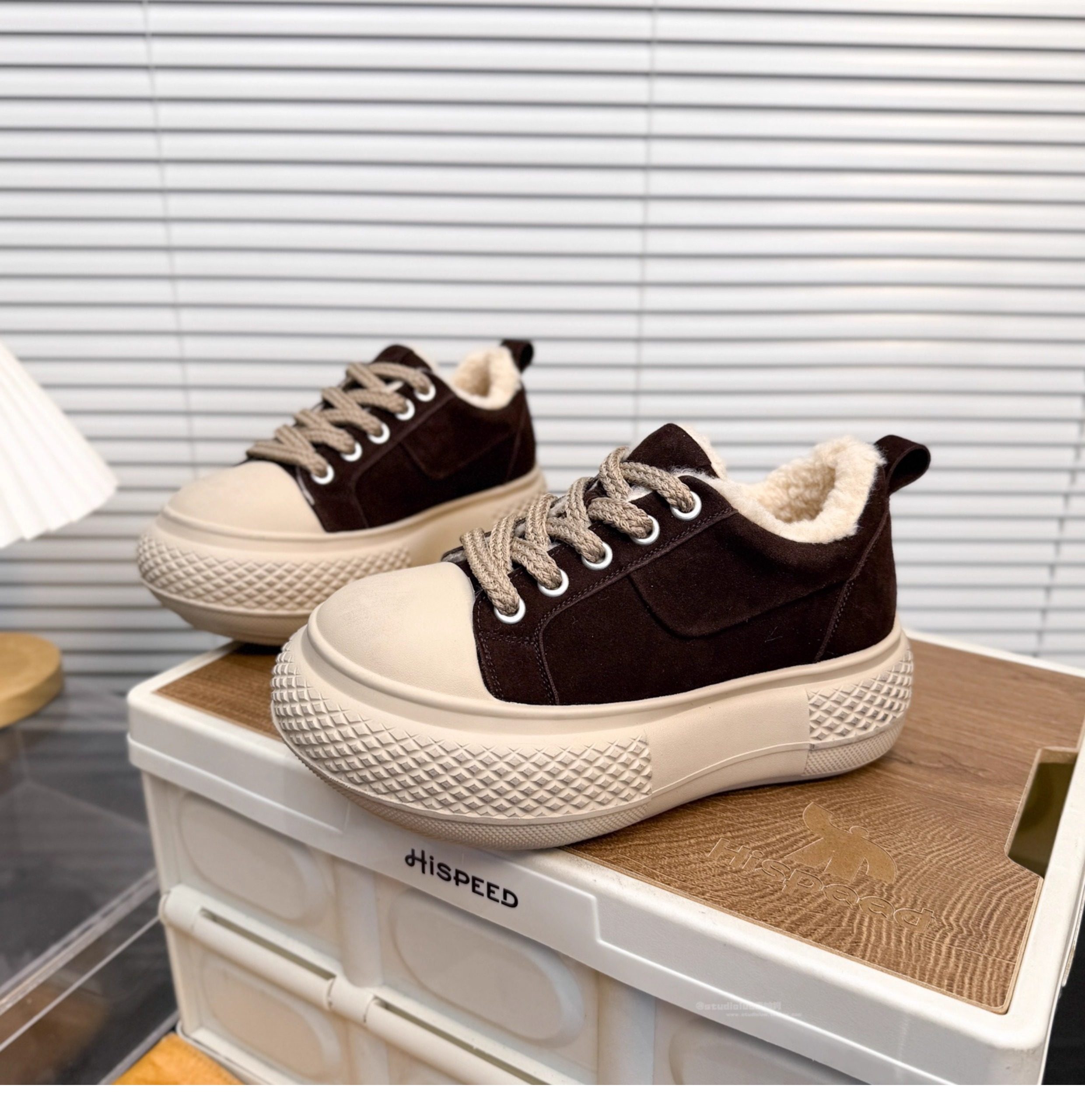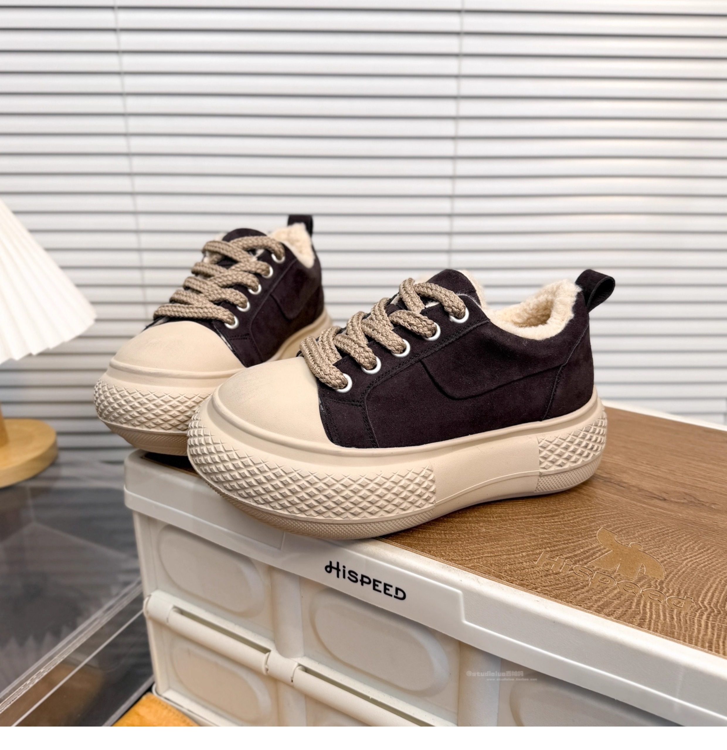 Hong Kong Style Suede Leather Large-Toe Plush-Lined Loafers for Women, 2025 Winter New Fashion Thick-Soled Height-Increasing Casual Sneakers