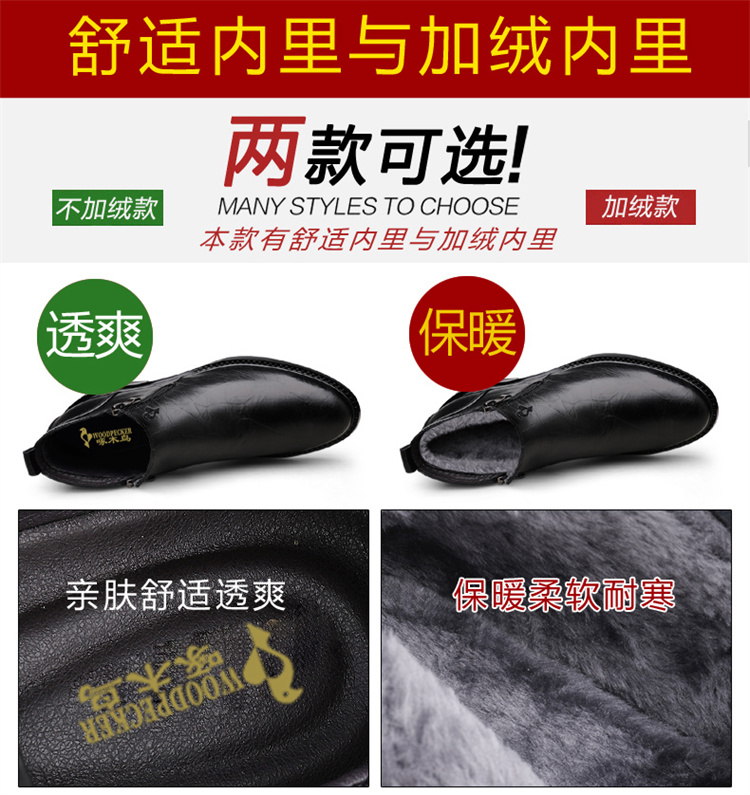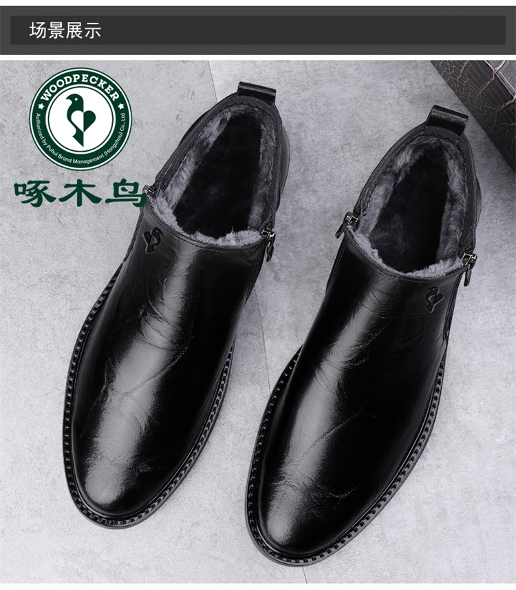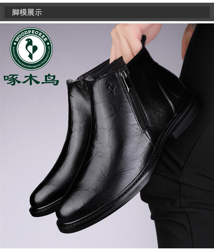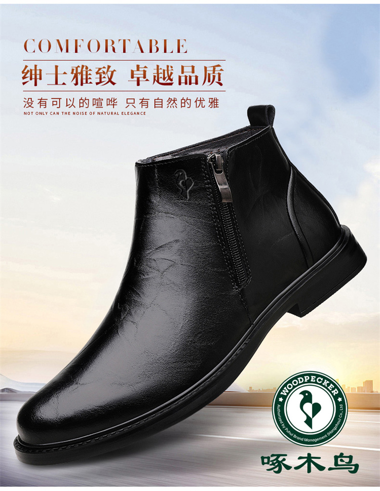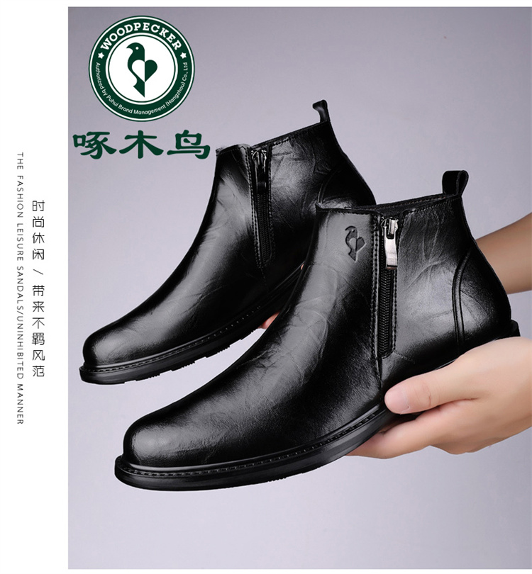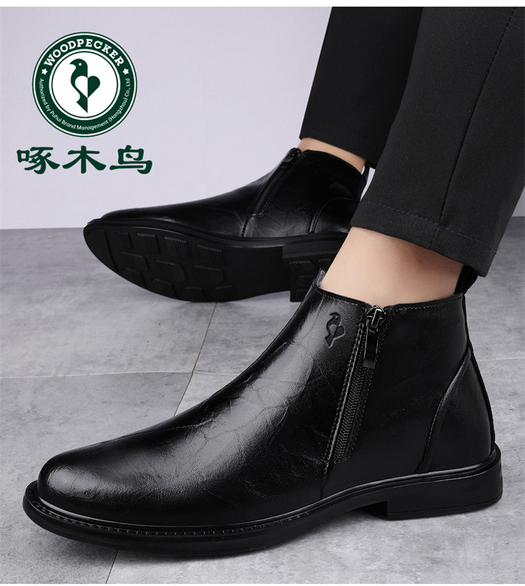 Woodpecker Men's Shoes Genuine Leather Soft Surface Soft Sole Winter Fleece-Lined Warm Cotton Boots Side Zipper Chelsea Boots High-Top Leather Shoes