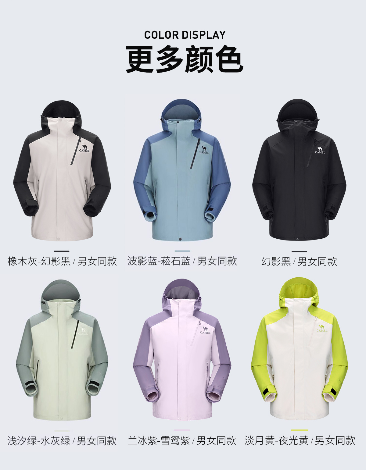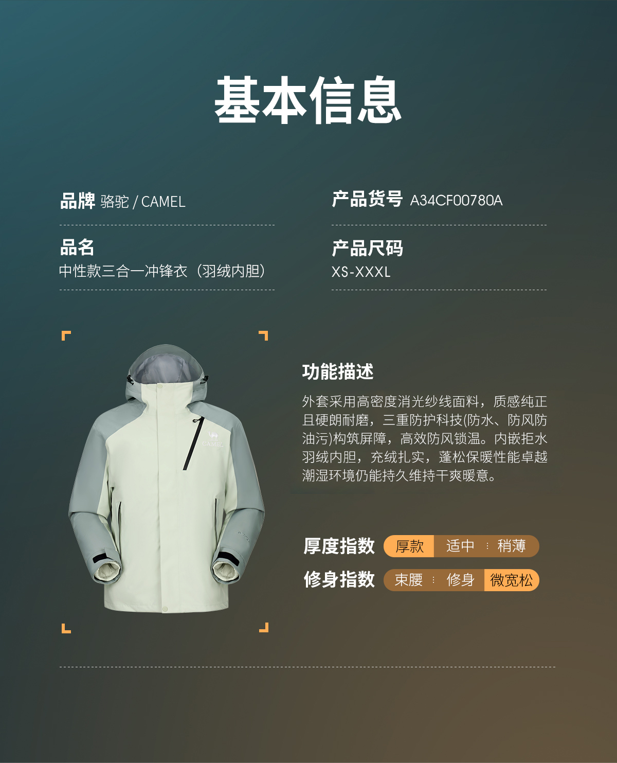 温馨提示: 本次直播款号是A34CF00780 中性款三合一冲锋衣(抓绒内胆),其颜色皆为同款同品质,因批次不同,可能出现轻微色差,仓库随机发货,骆驼粉丝们介意慎拍!祝粉丝们购物愉快~ ~ 暖【芯】指索罗娜热感抓绒内胆蓄热升温,请知悉! 页面上所有款式防水,耐磨,透湿数据经由第三方检测机构测试所得,仅代表面料单次测试结果。