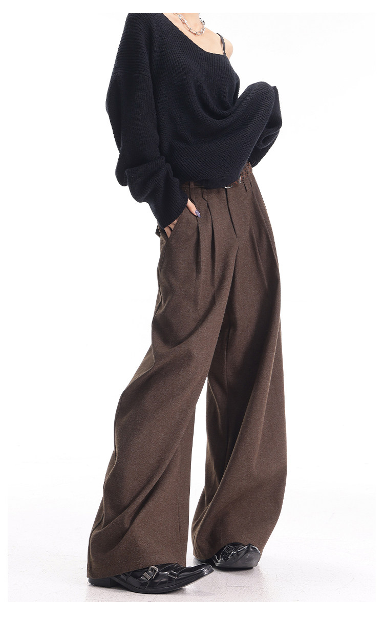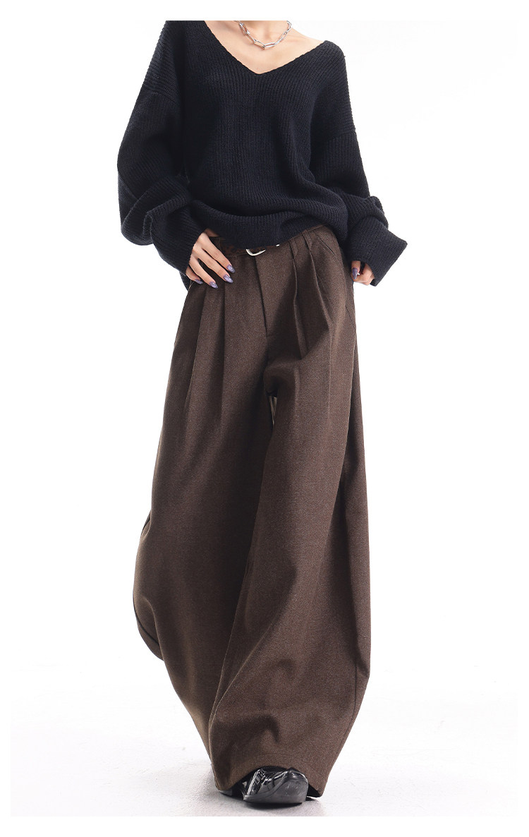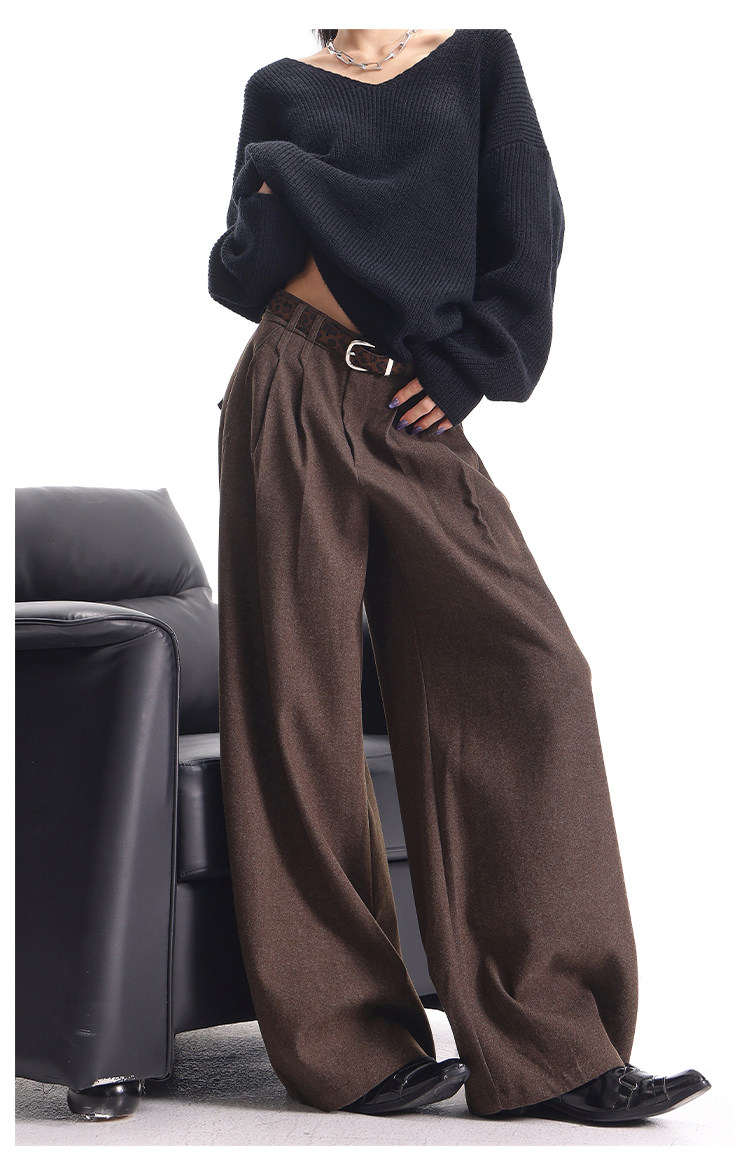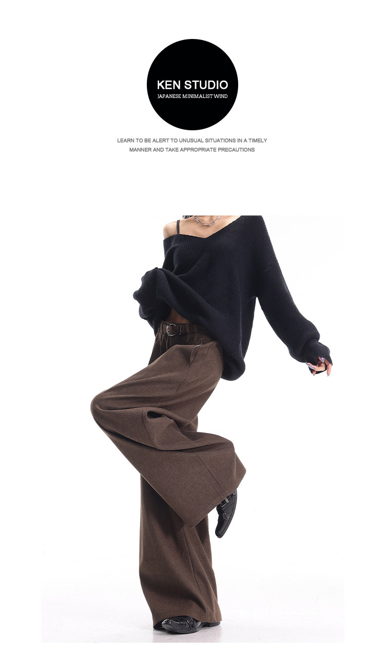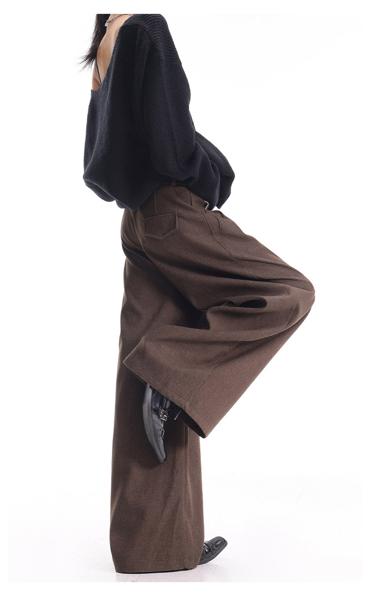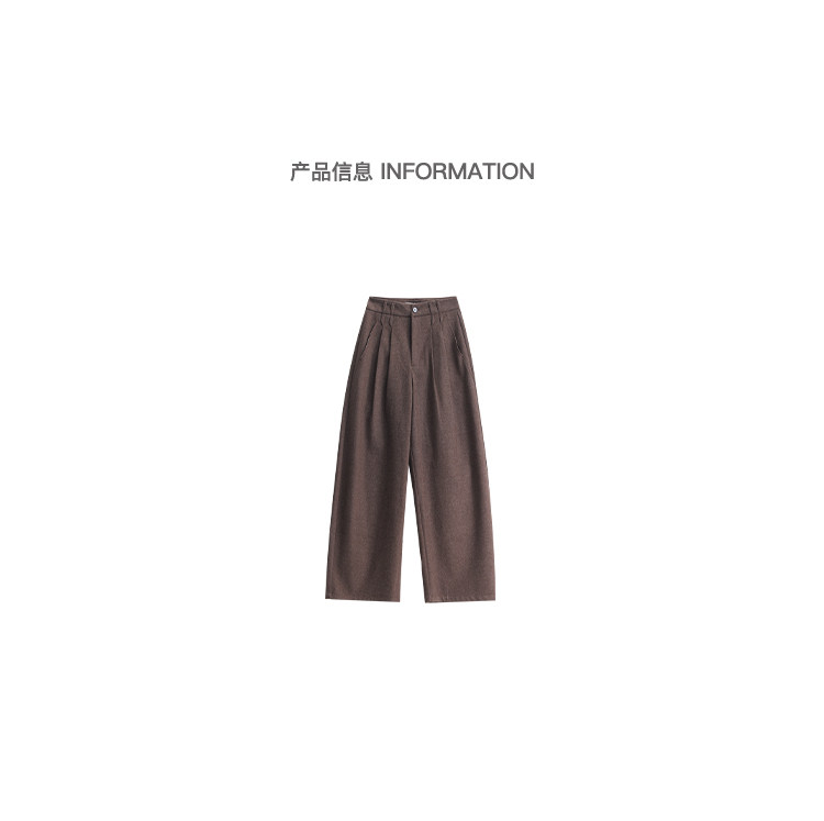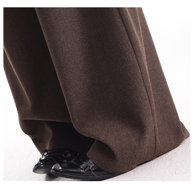 Ken Studio Autumn and Winter New Vintage Money Style Coffee-Colored Brushed Suit Pants for Women, Retro Versatile Wide-Leg Casual Pants