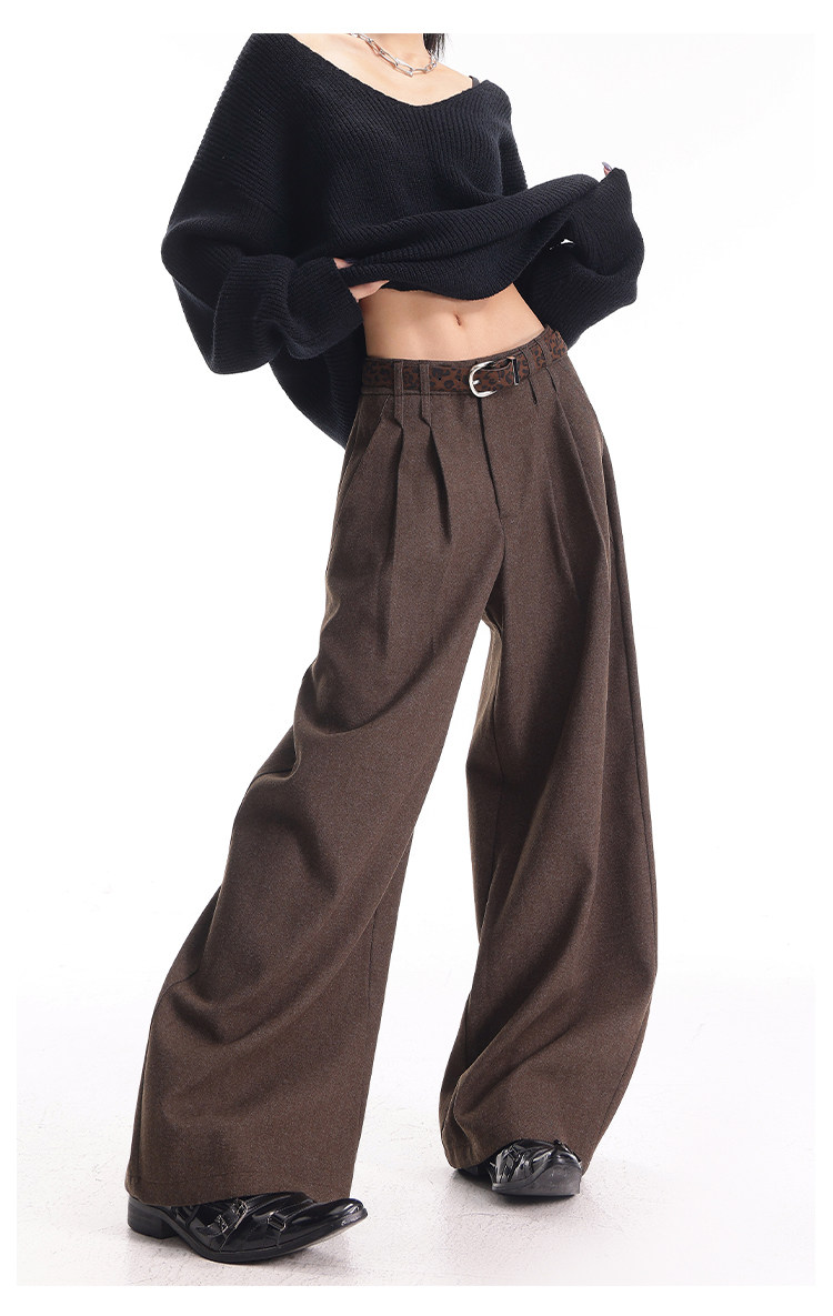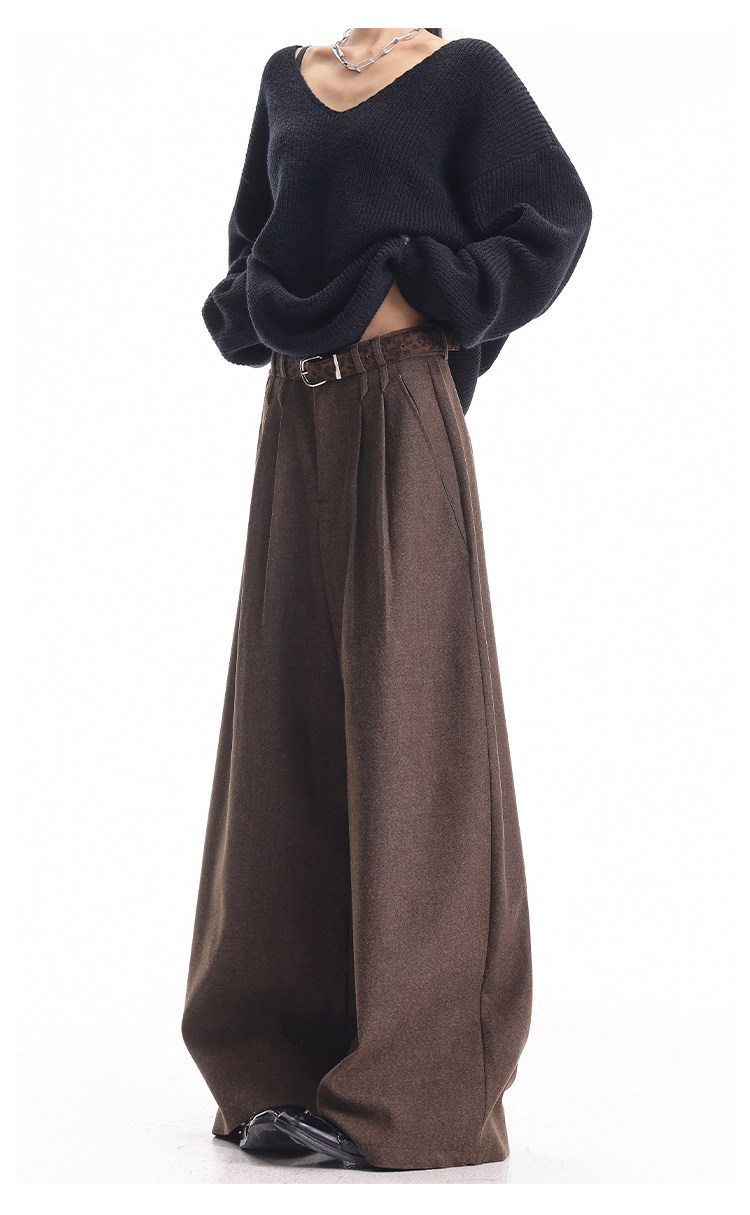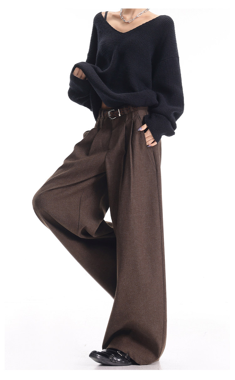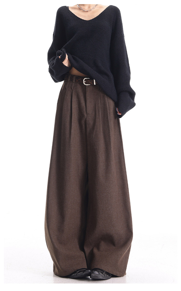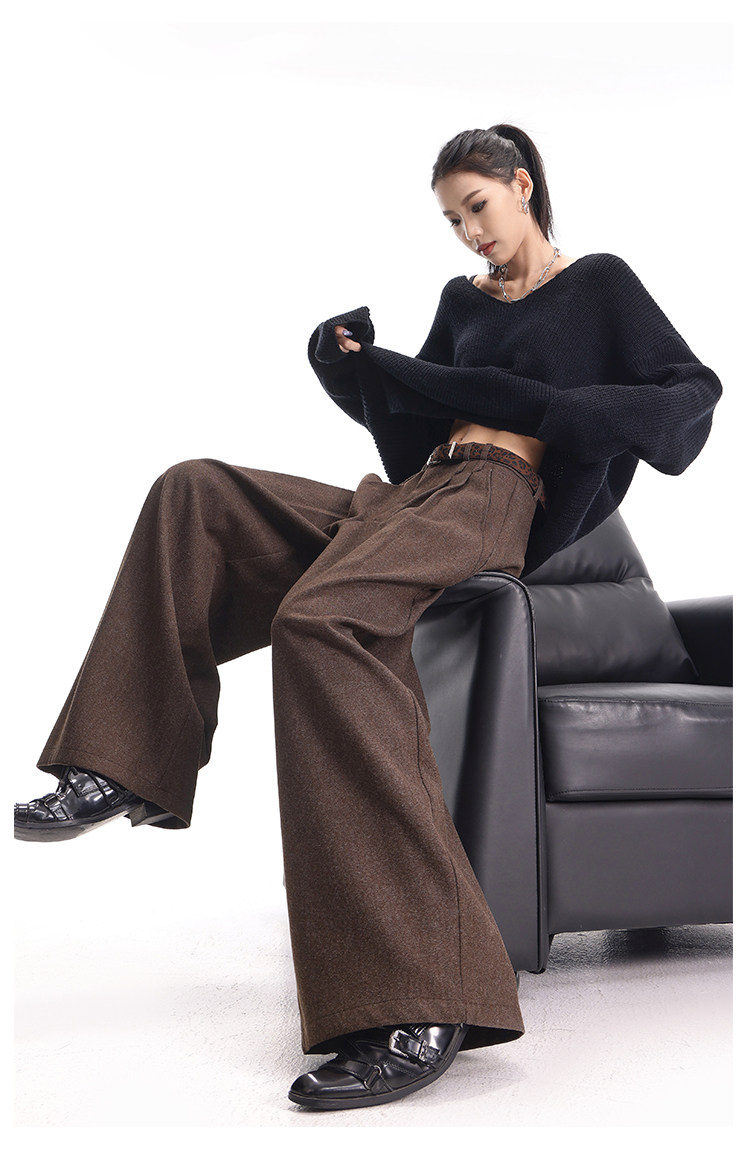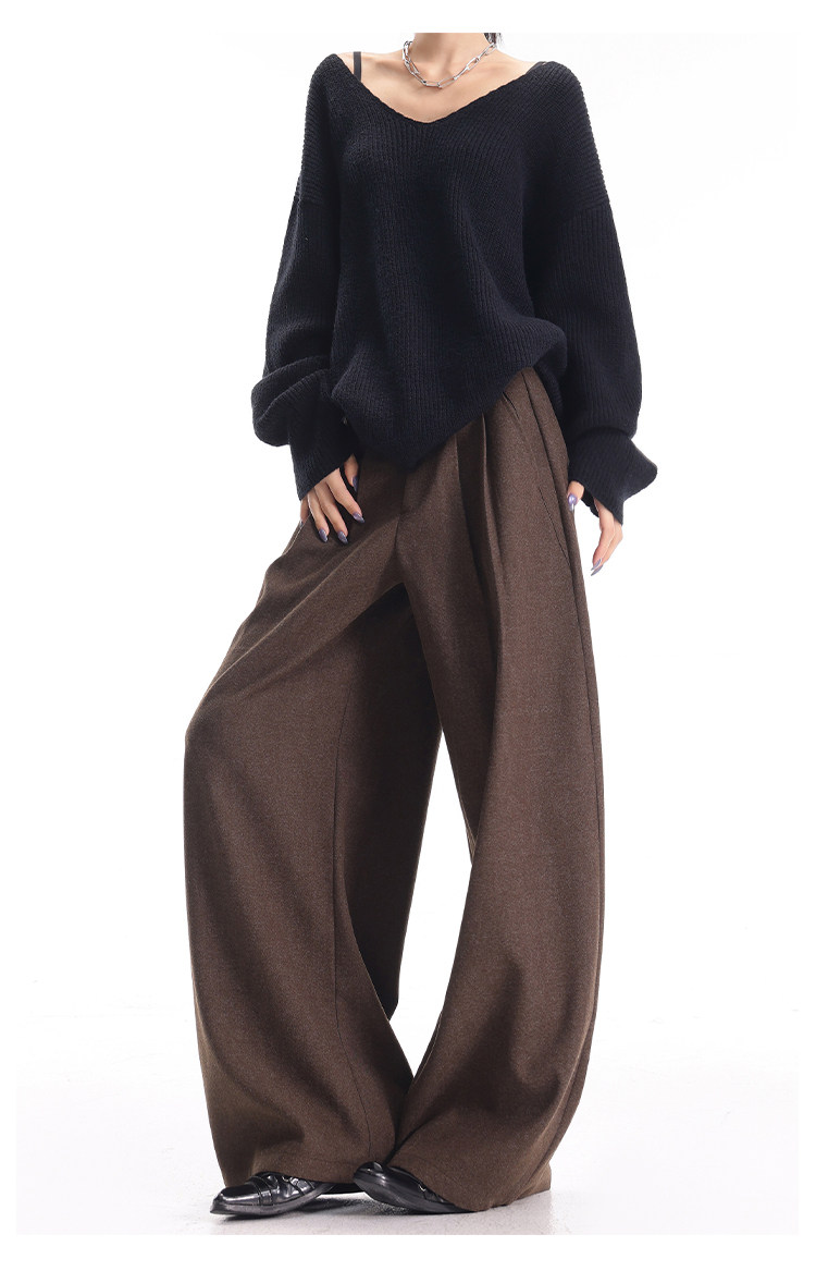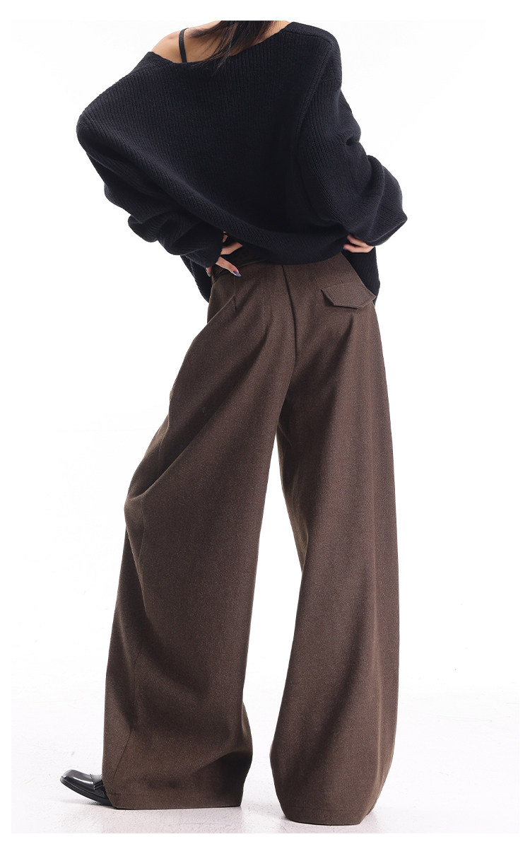 Ken Studio Autumn and Winter New Vintage Money Style Coffee-Colored Brushed Suit Pants for Women, Retro Versatile Wide-Leg Casual Pants