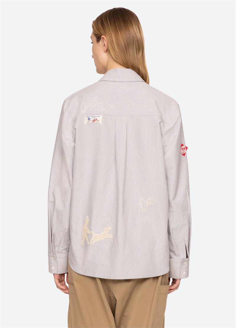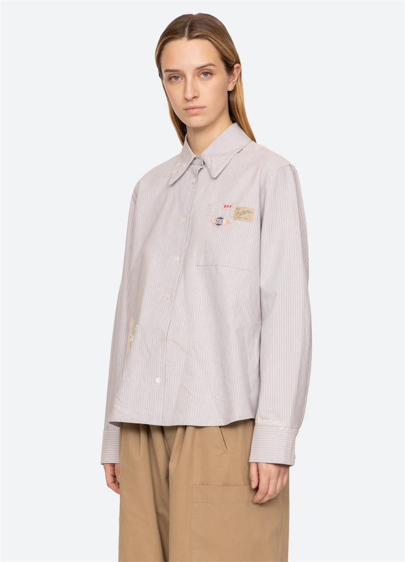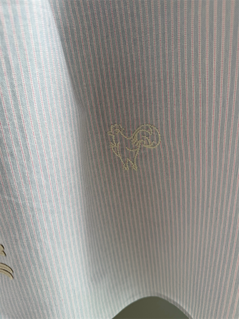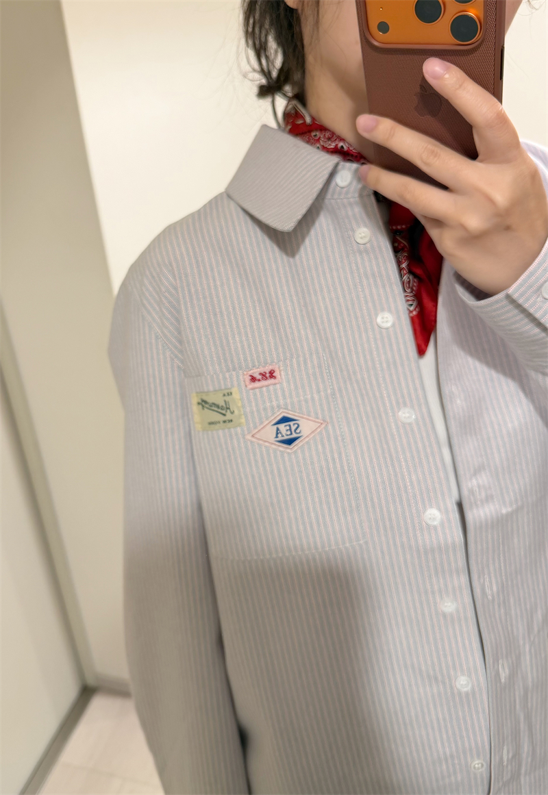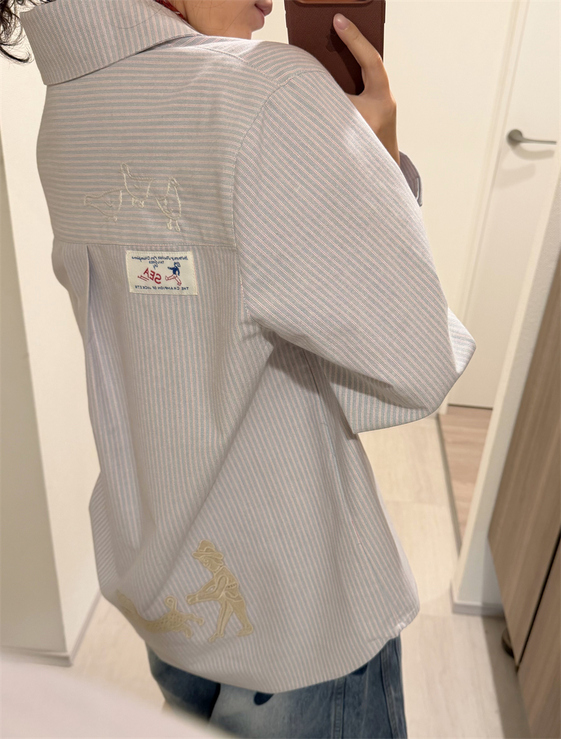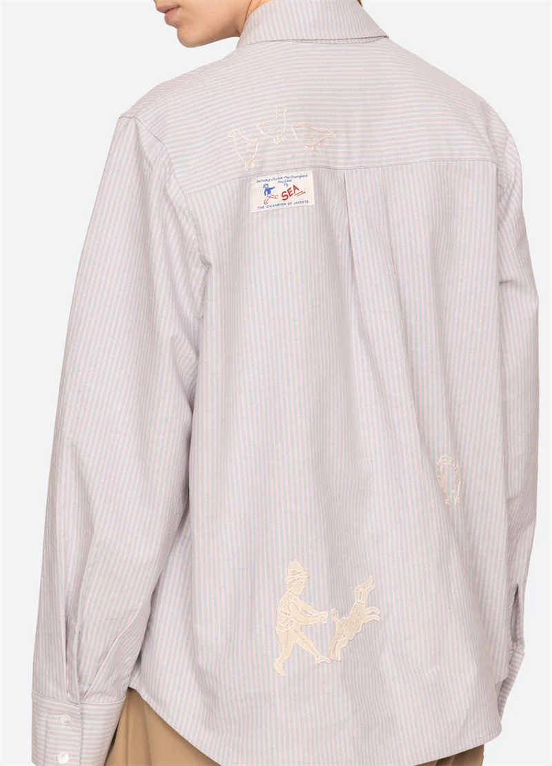 Old-Fashioned Letter-Style Brand Se@ Custom-Woven Blue, White, and Red Striped Oxford Fabric Embroidered Hand-Stitched Label Single-Breasted Long-Sleeve Shirt