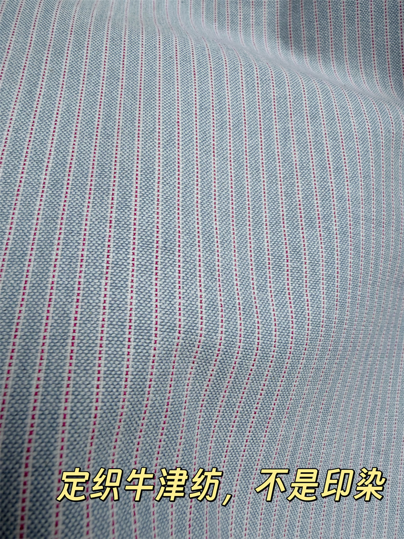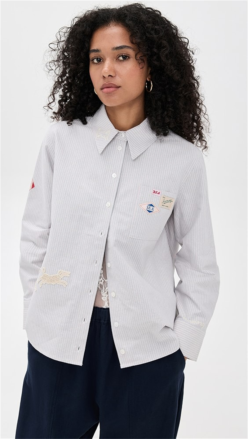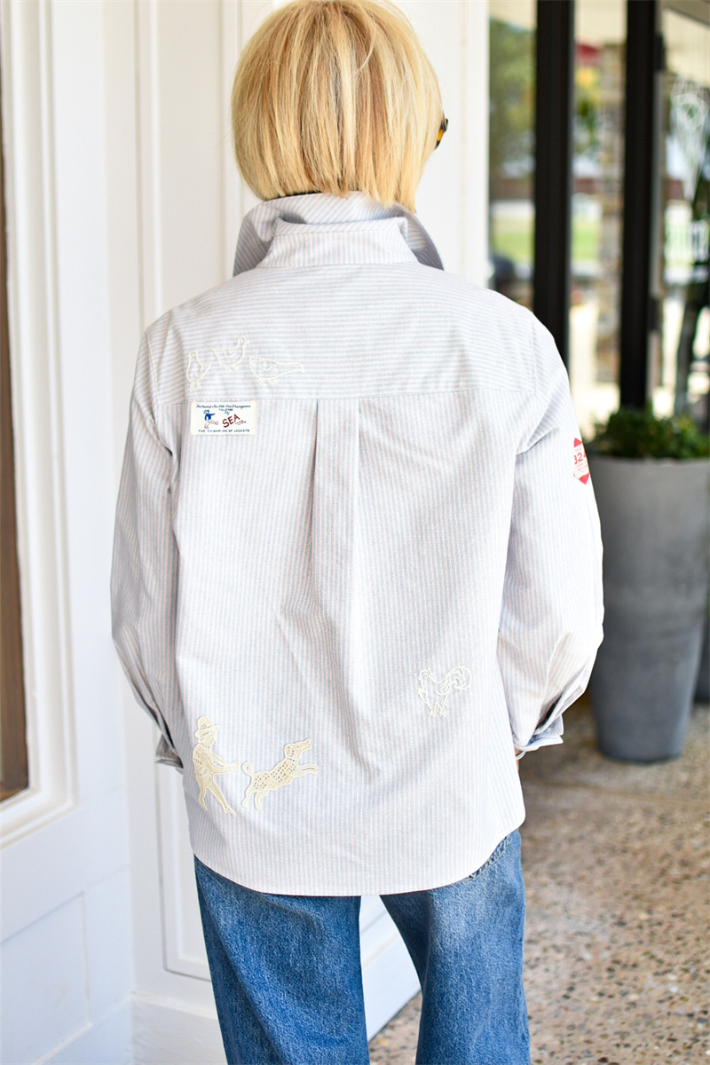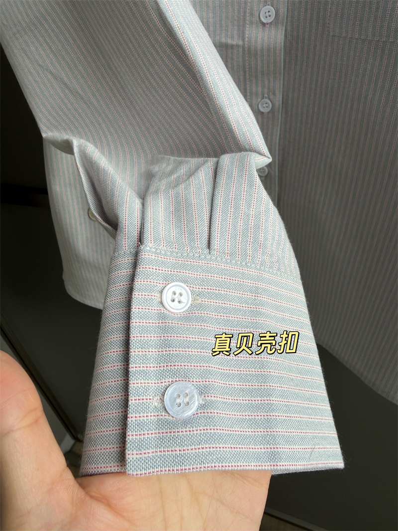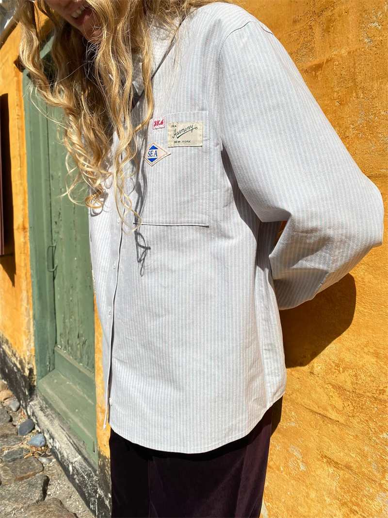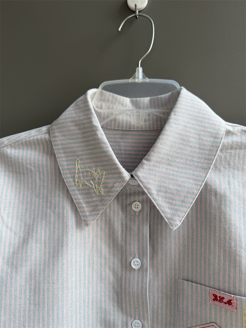 Old-Fashioned Letter-Style Brand Se@ Custom-Woven Blue, White, and Red Striped Oxford Fabric Embroidered Hand-Stitched Label Single-Breasted Long-Sleeve Shirt
