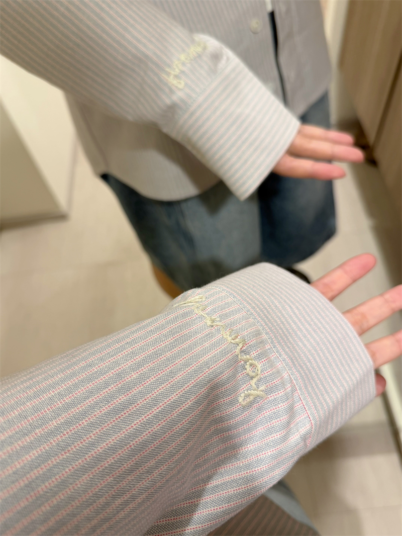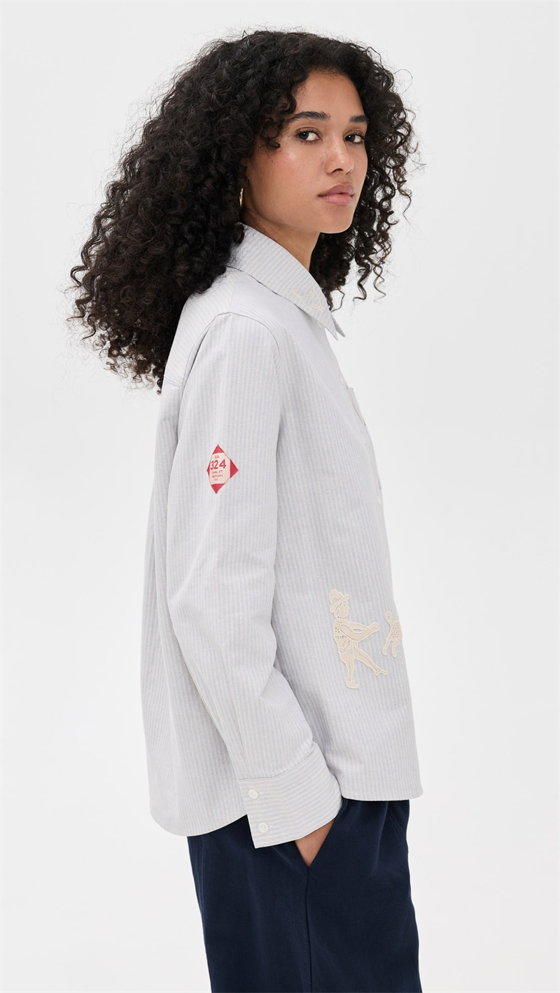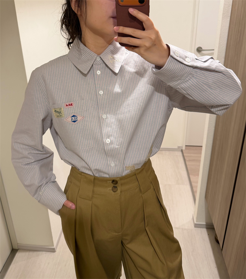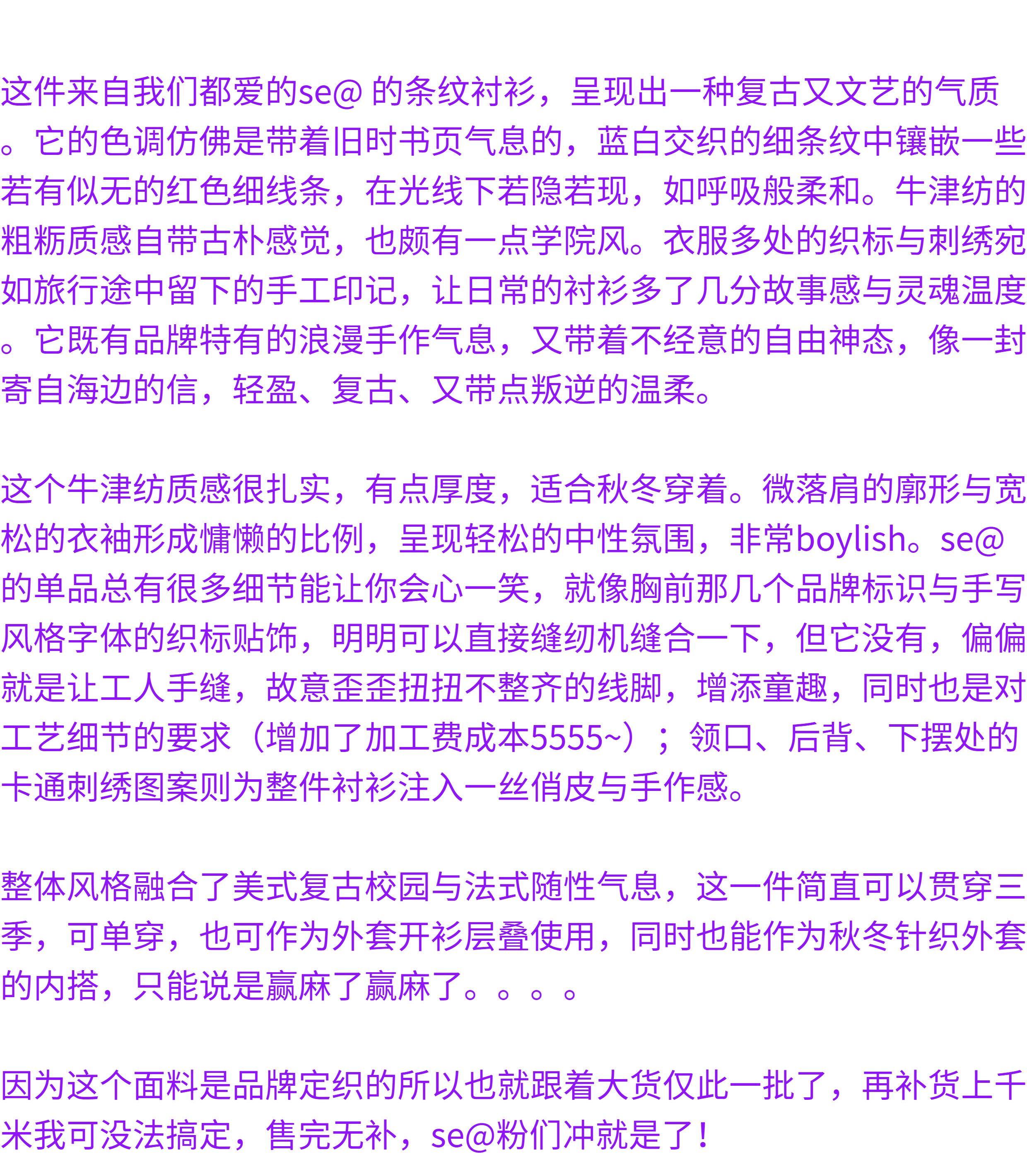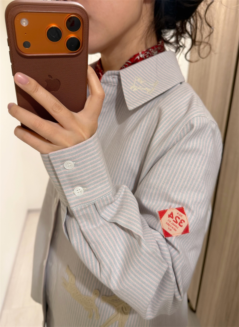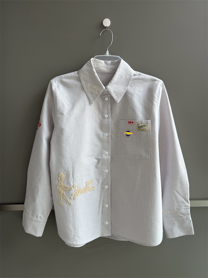 Old-Fashioned Letter-Style Brand Se@ Custom-Woven Blue, White, and Red Striped Oxford Fabric Embroidered Hand-Stitched Label Single-Breasted Long-Sleeve Shirt