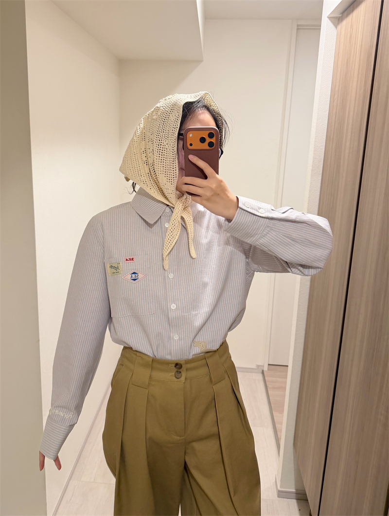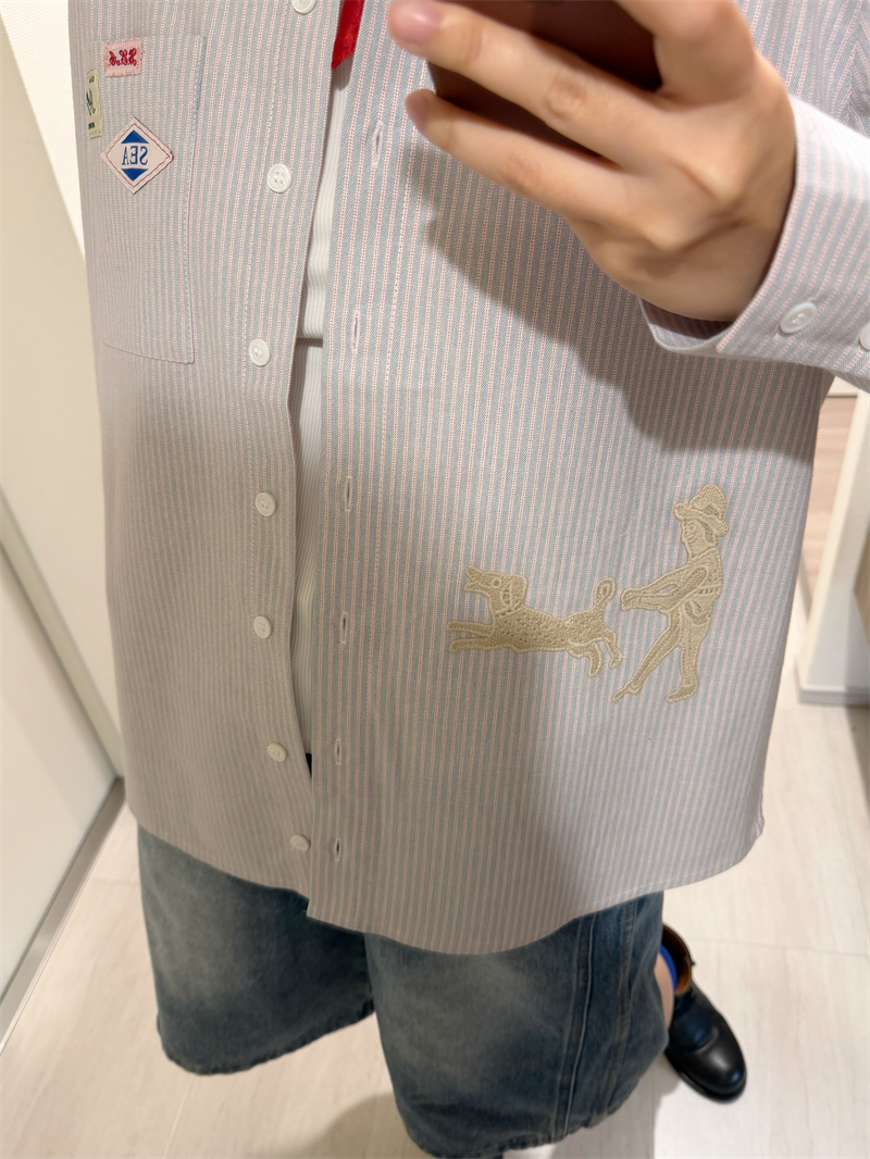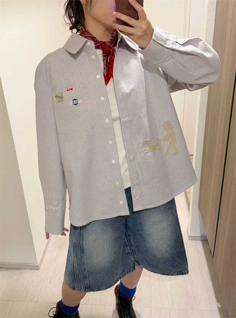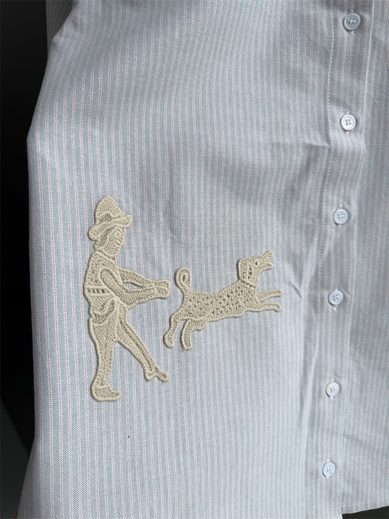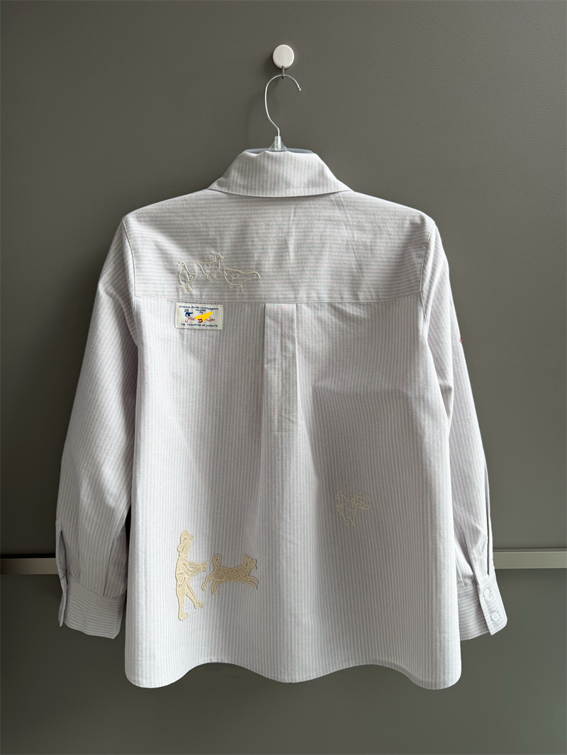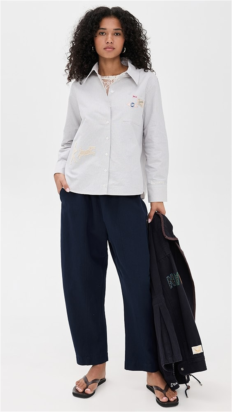 Old-Fashioned Letter-Style Brand Se@ Custom-Woven Blue, White, and Red Striped Oxford Fabric Embroidered Hand-Stitched Label Single-Breasted Long-Sleeve Shirt