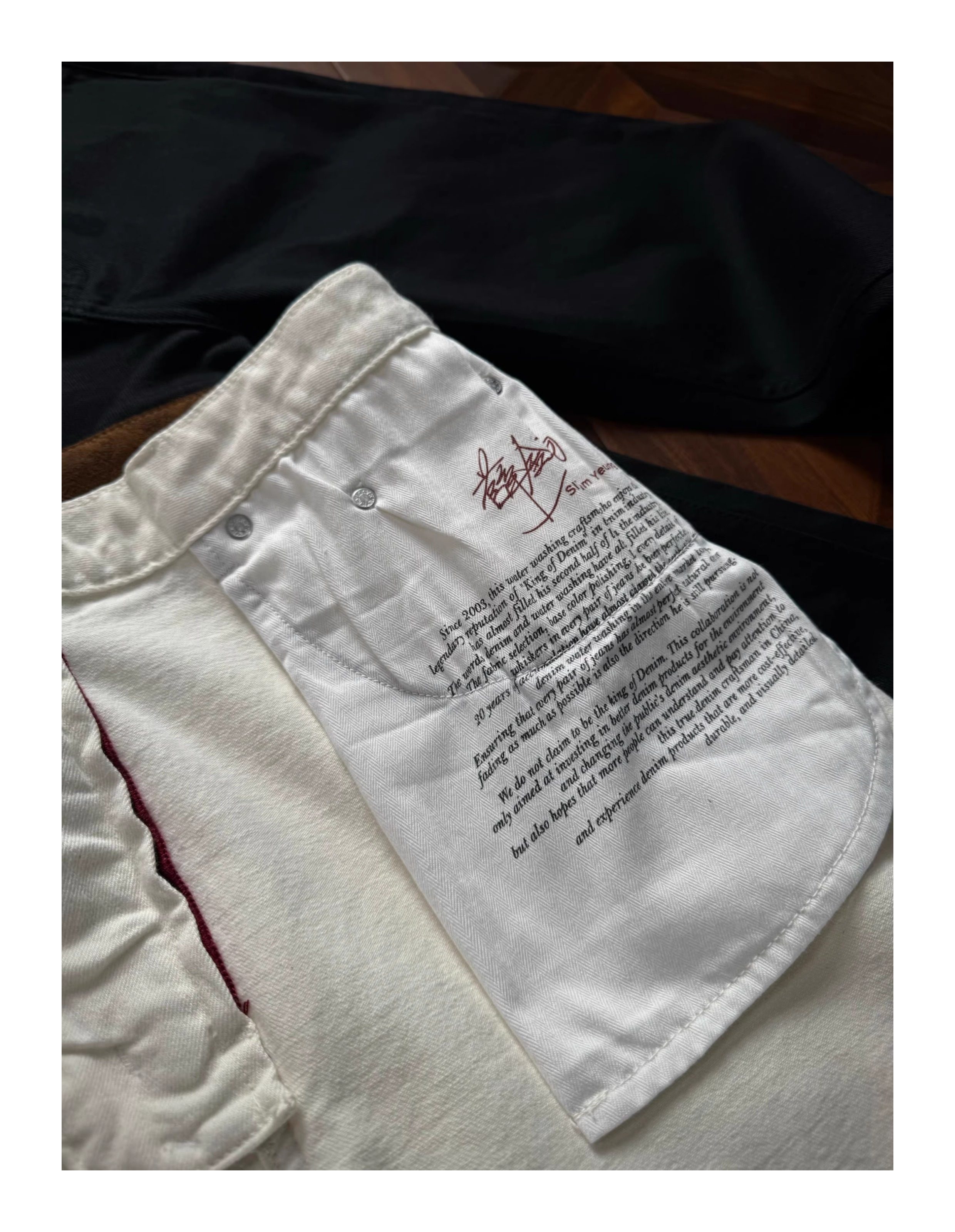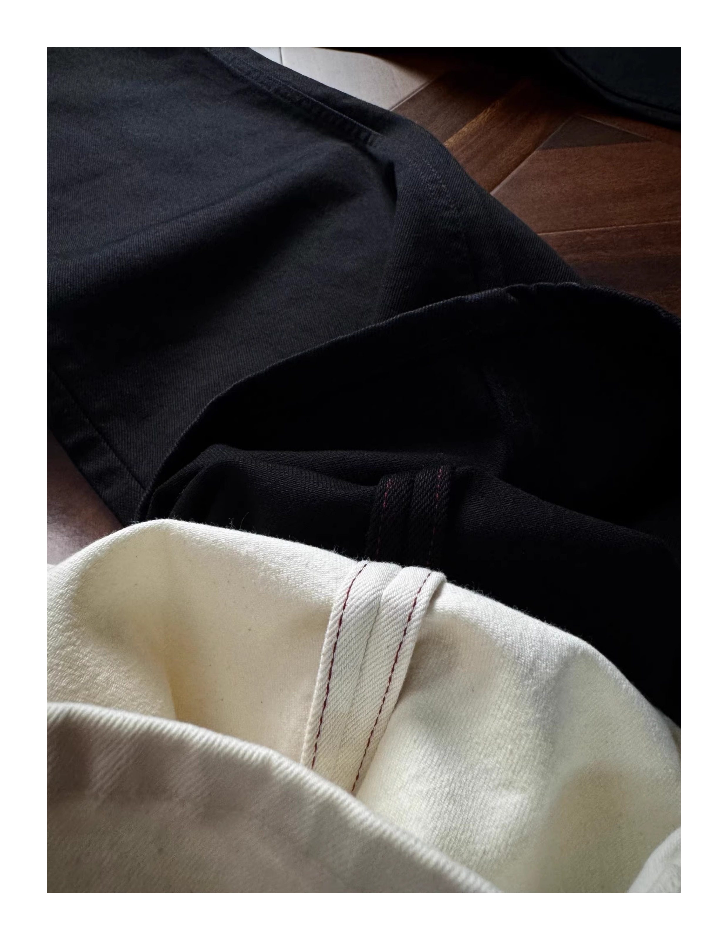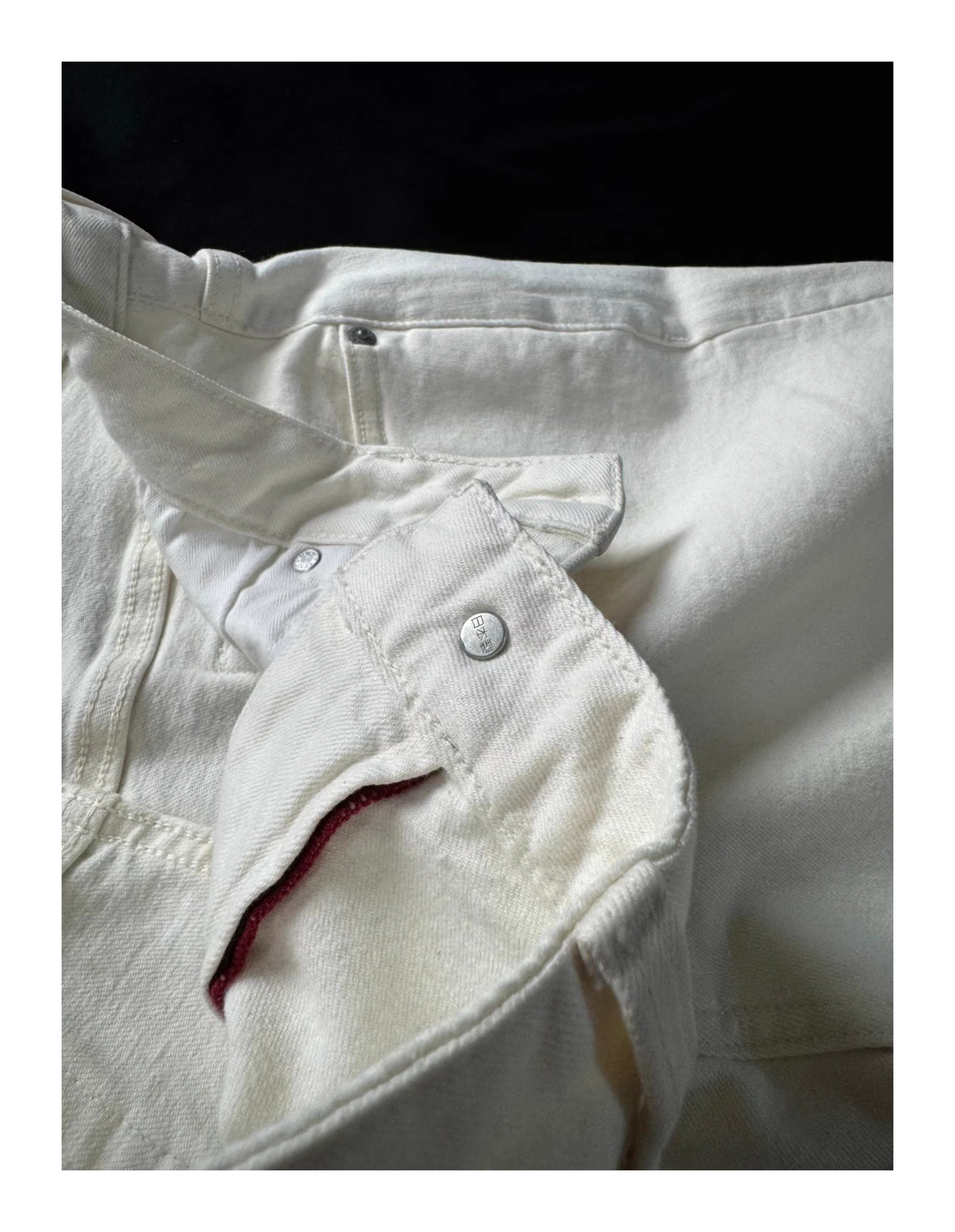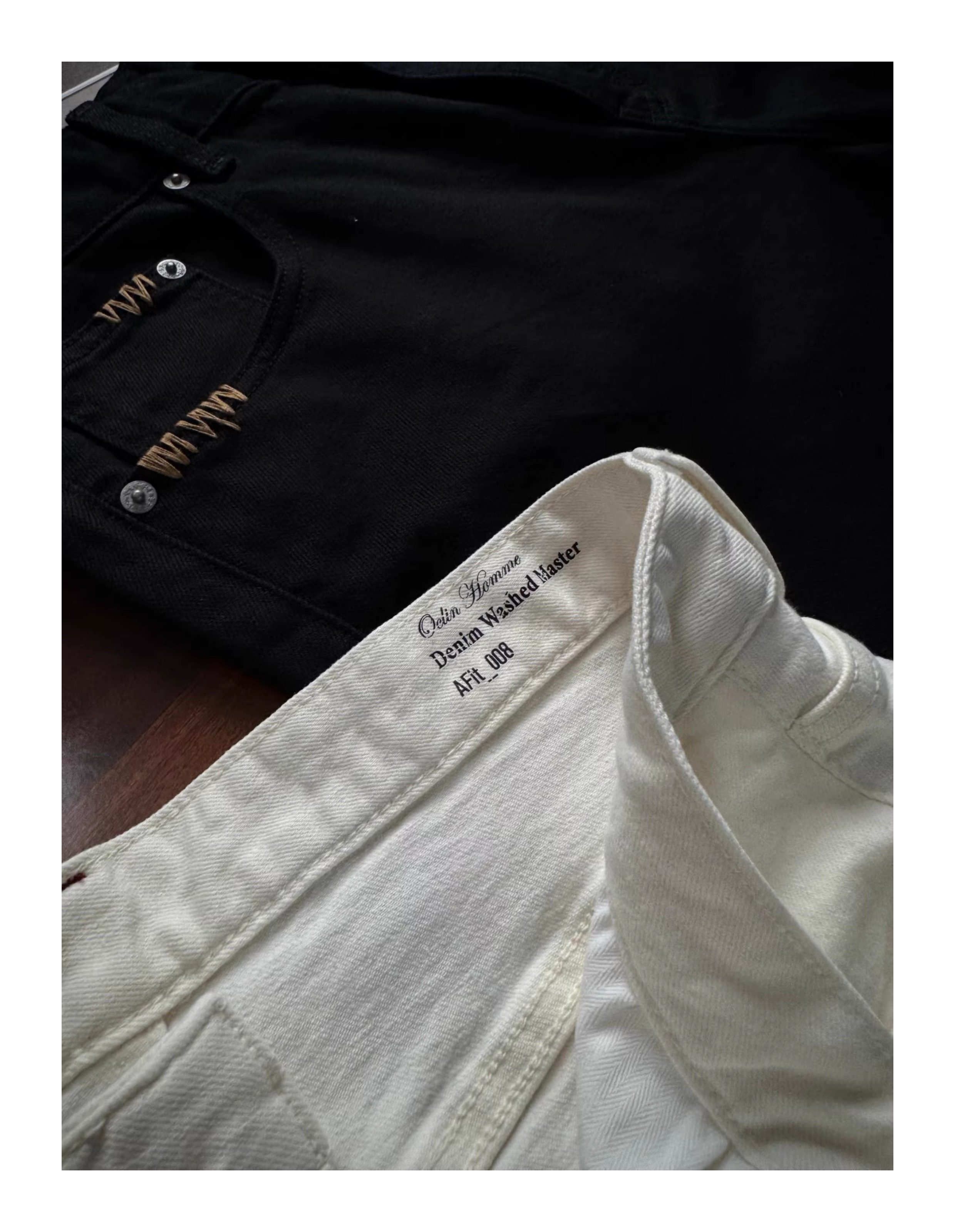 Oclin Master Collaboration 008 Hand-Stitched Black and White Kanglong Cow A-Line Lightly Washed Textured Slightly Stretch Denim Jeans