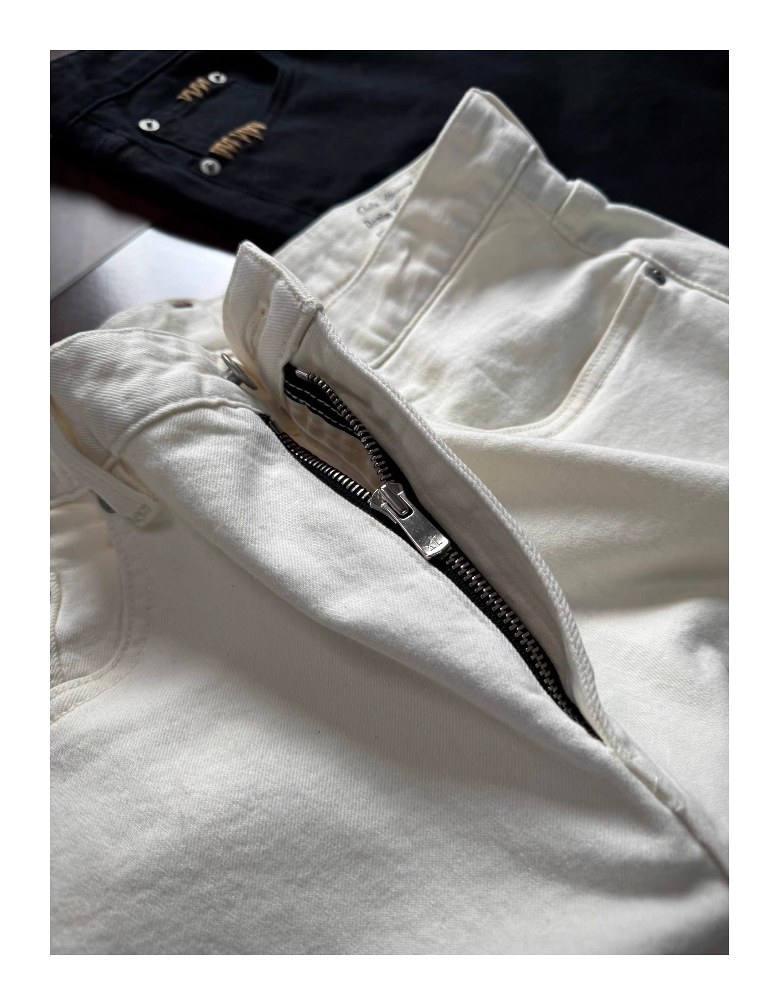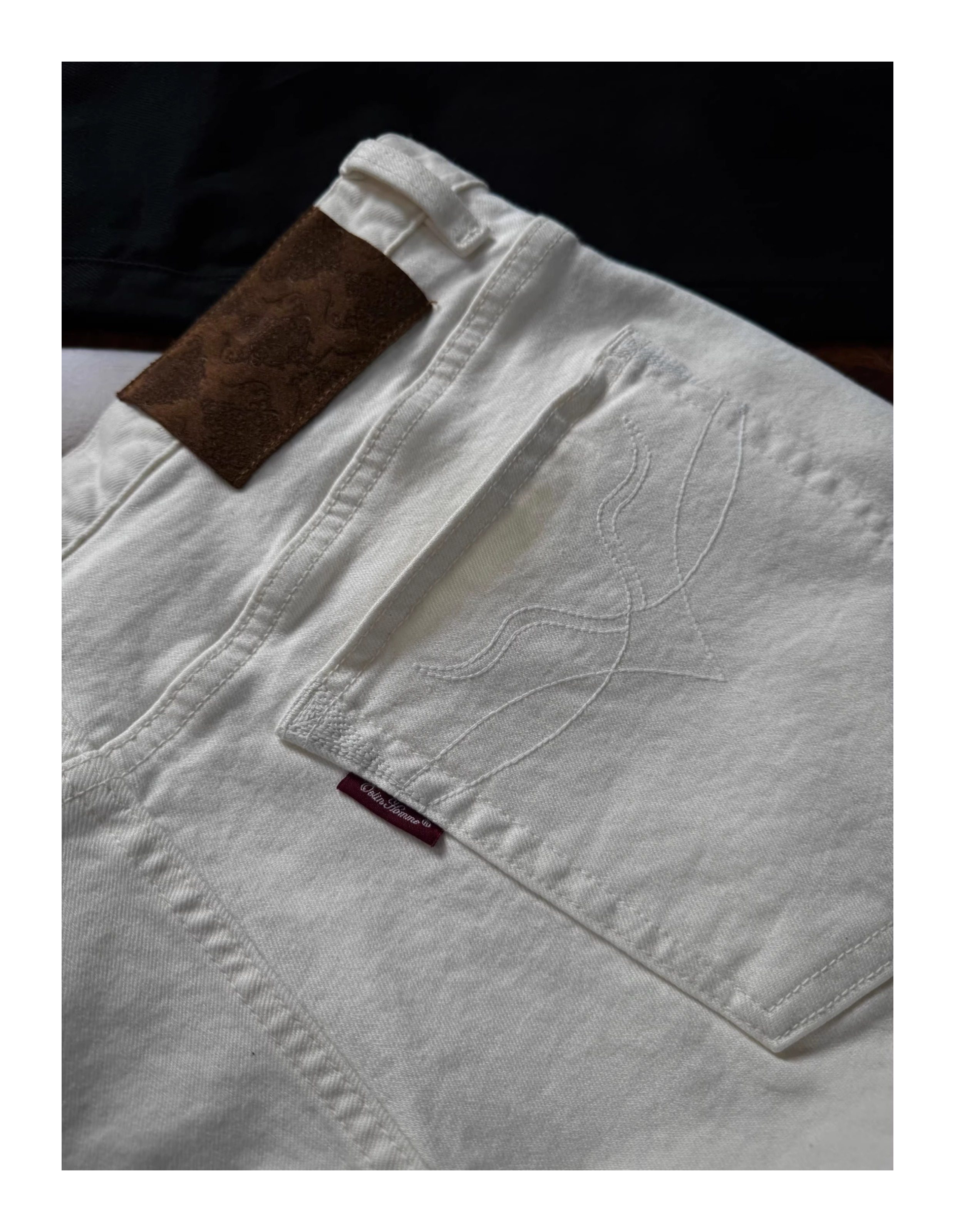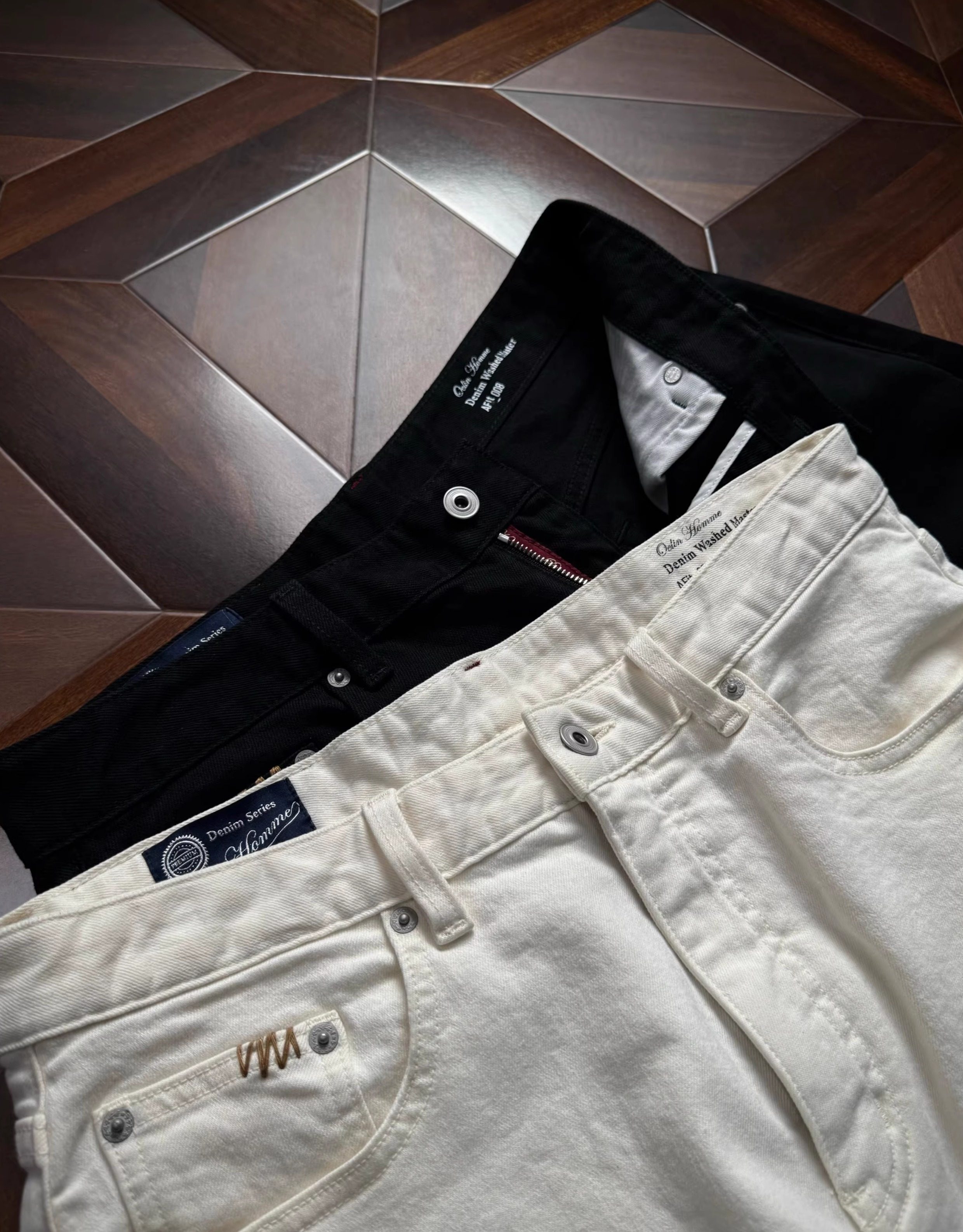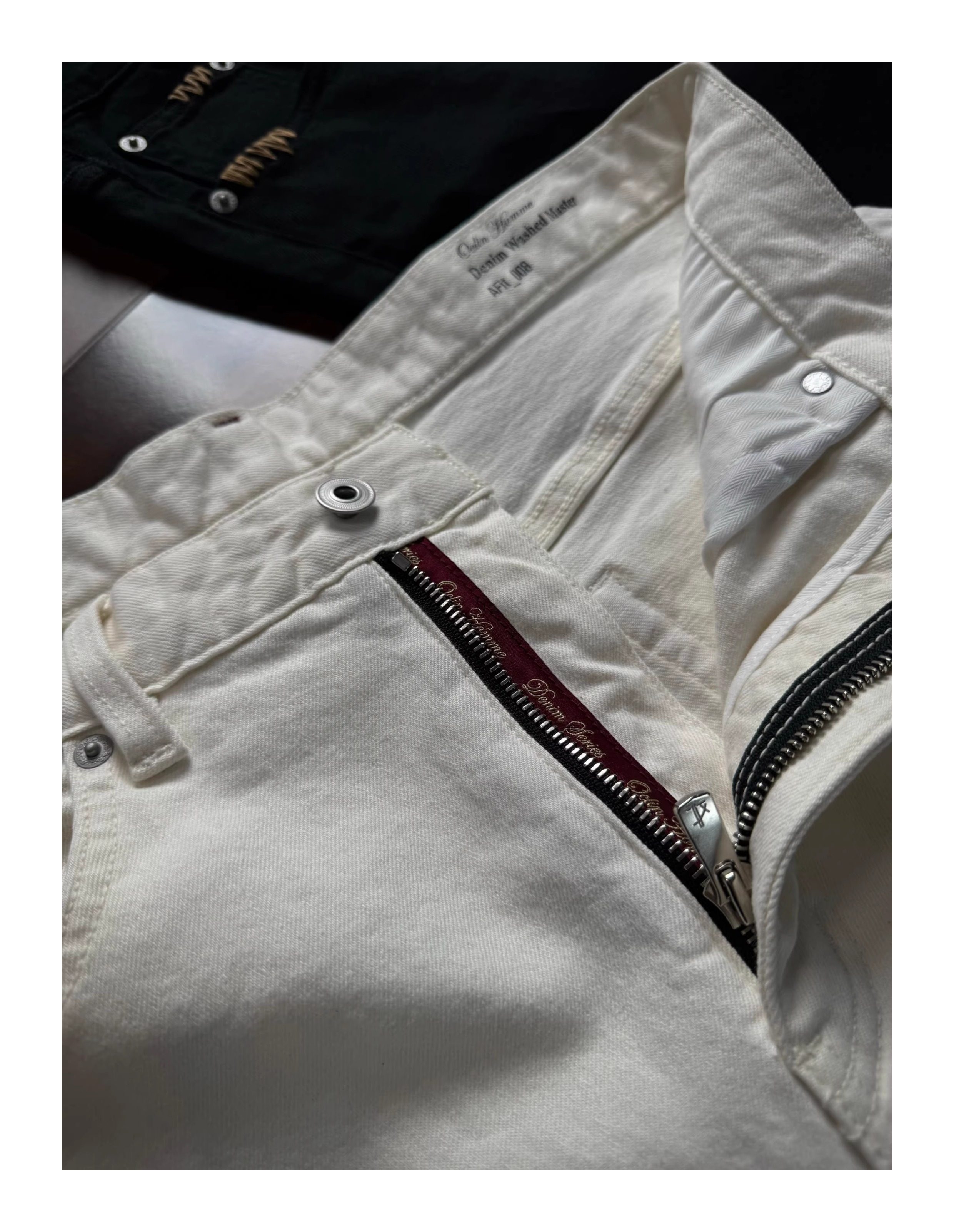 Oclin Master Collaboration 008 Hand-Stitched Black and White Kanglong Cow A-Line Lightly Washed Textured Slightly Stretch Denim Jeans