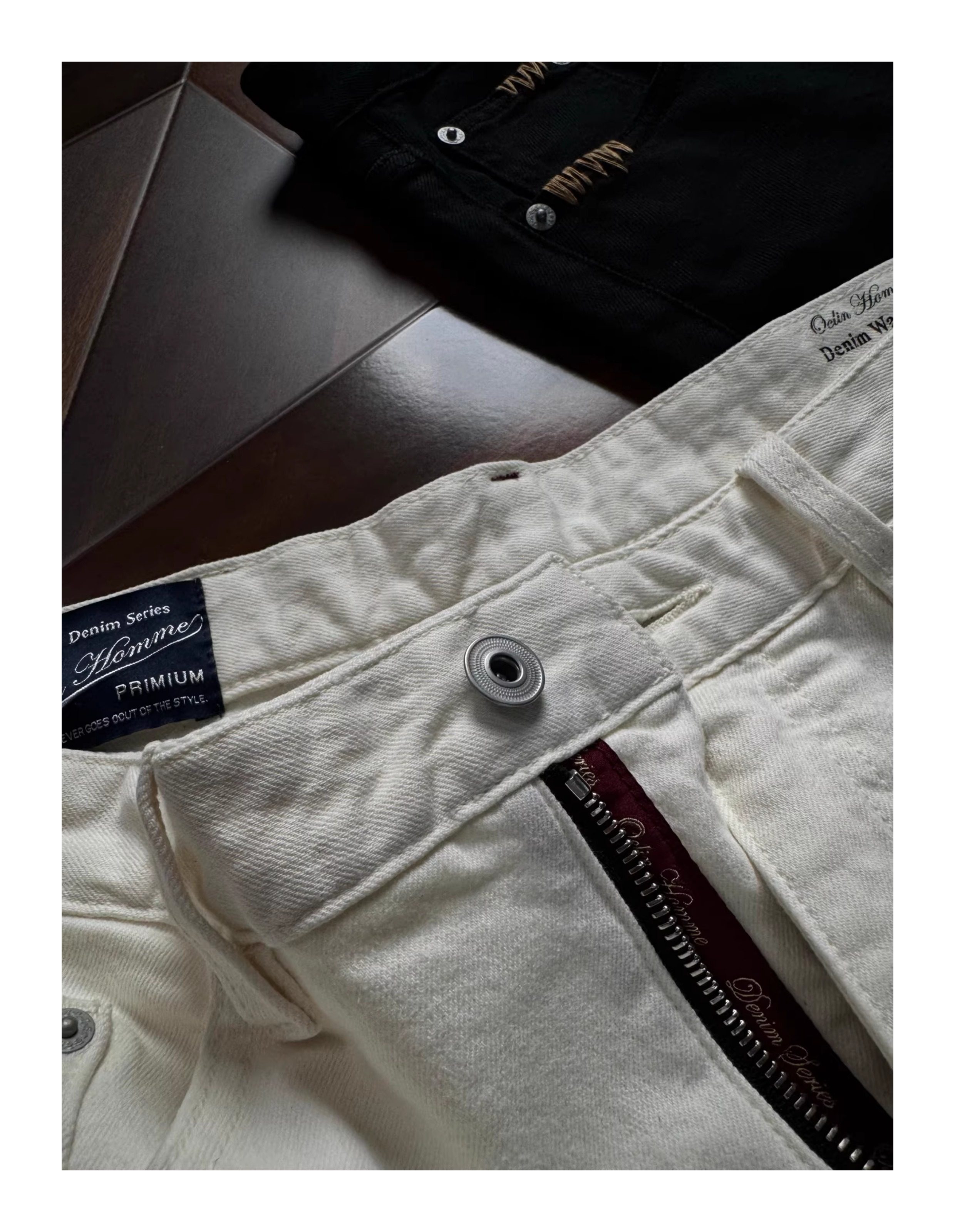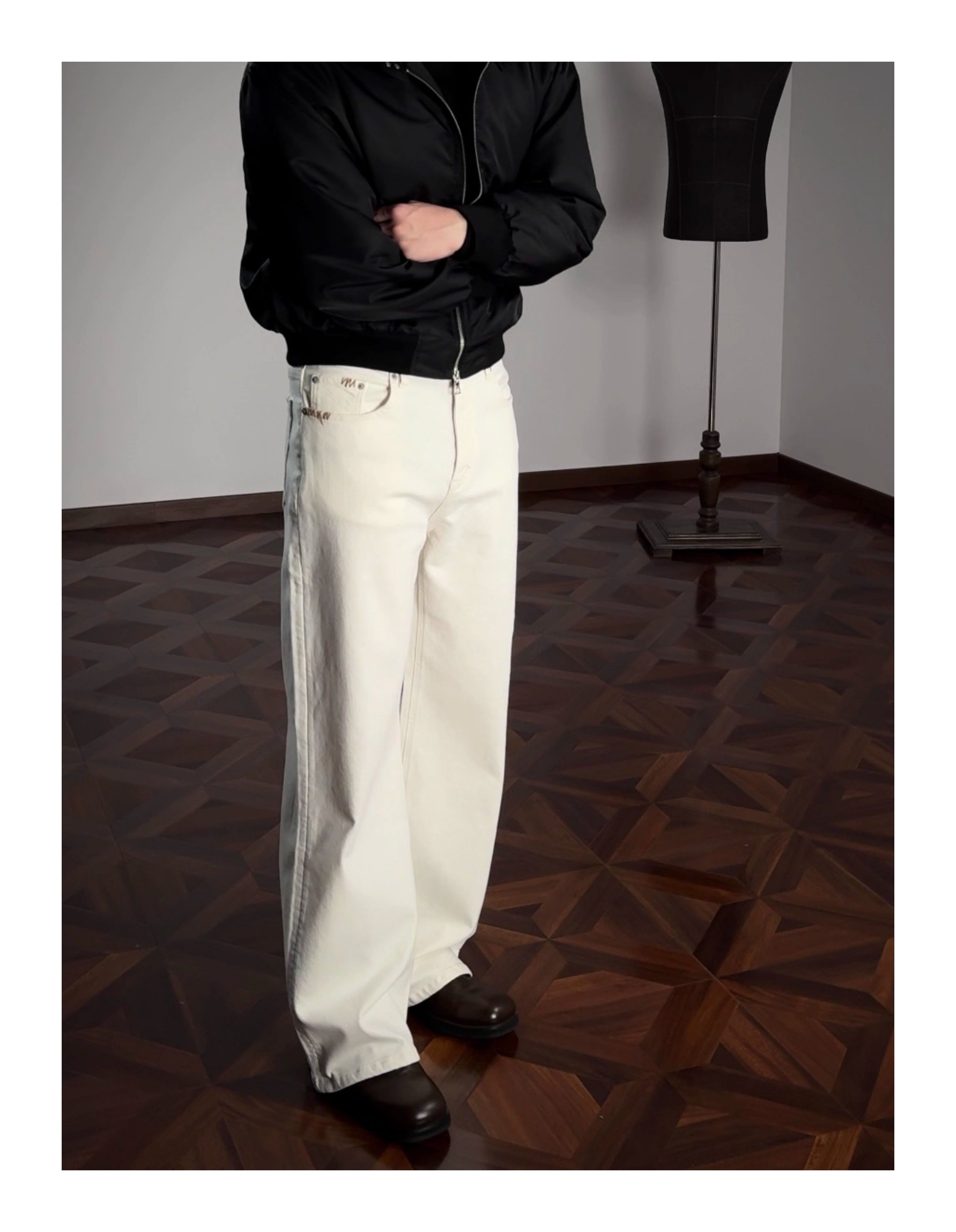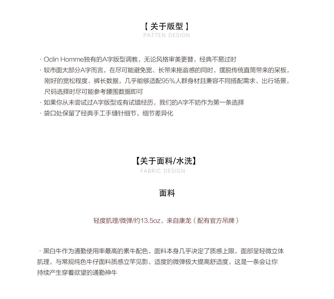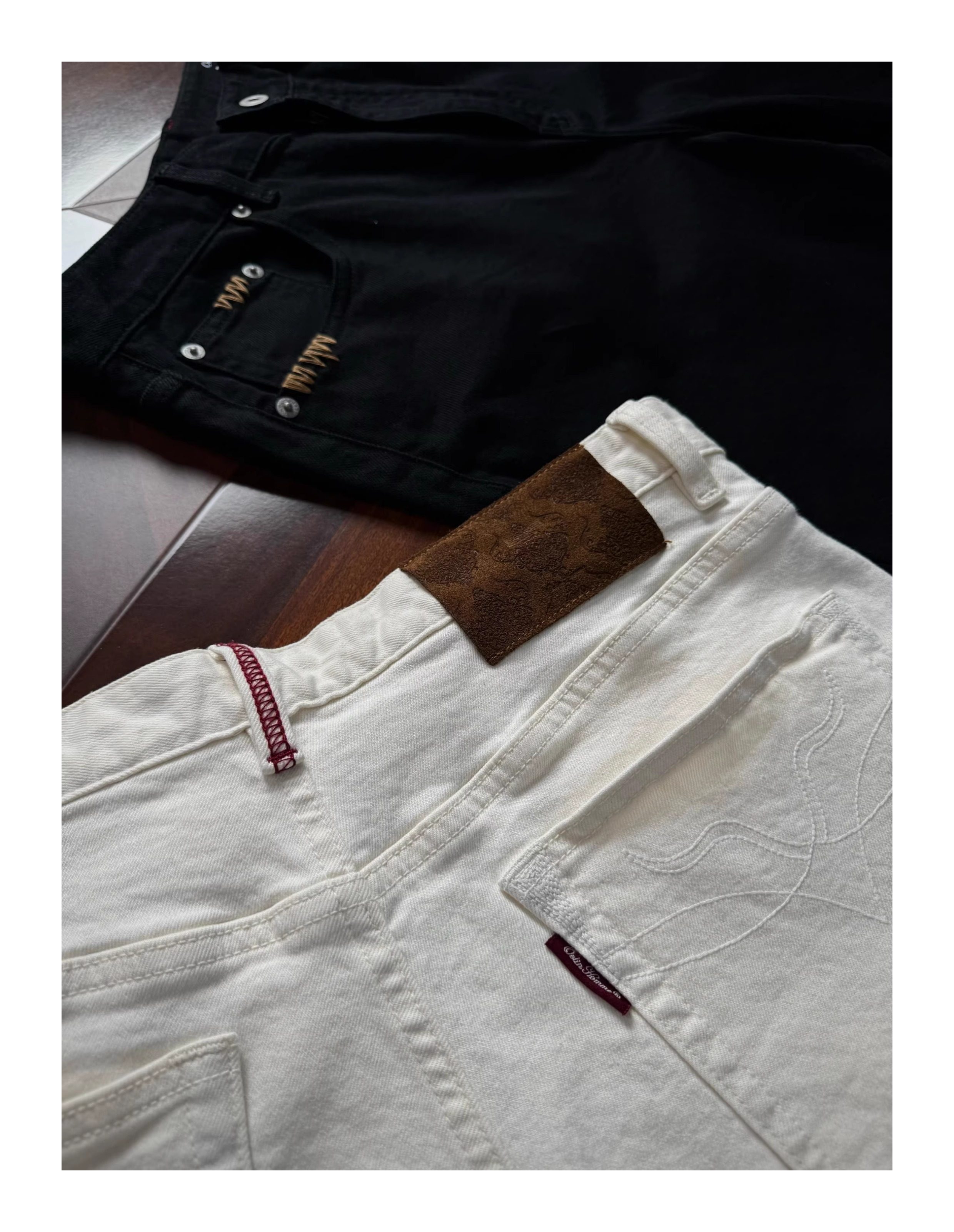 Oclin Master Collaboration 008 Hand-Stitched Black and White Kanglong Cow A-Line Lightly Washed Textured Slightly Stretch Denim Jeans