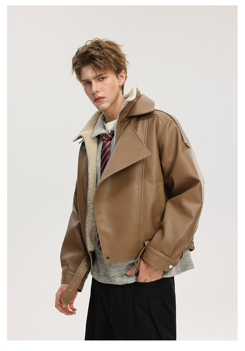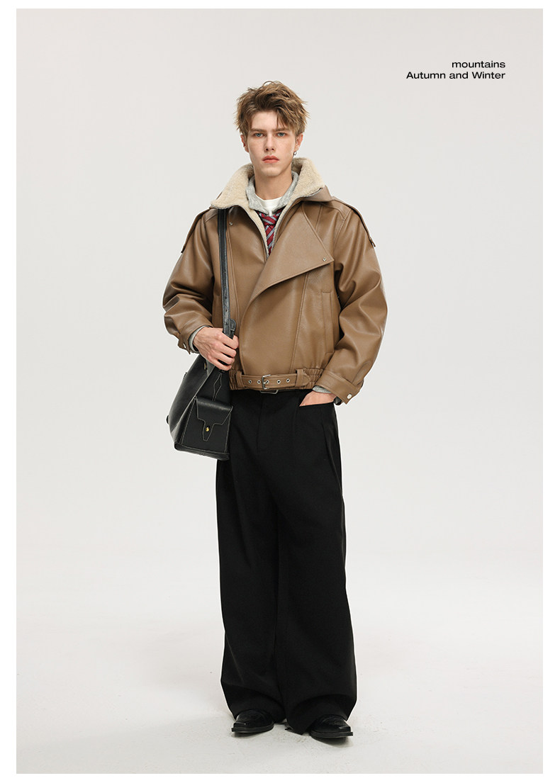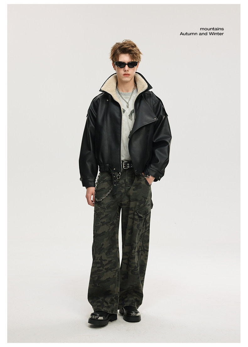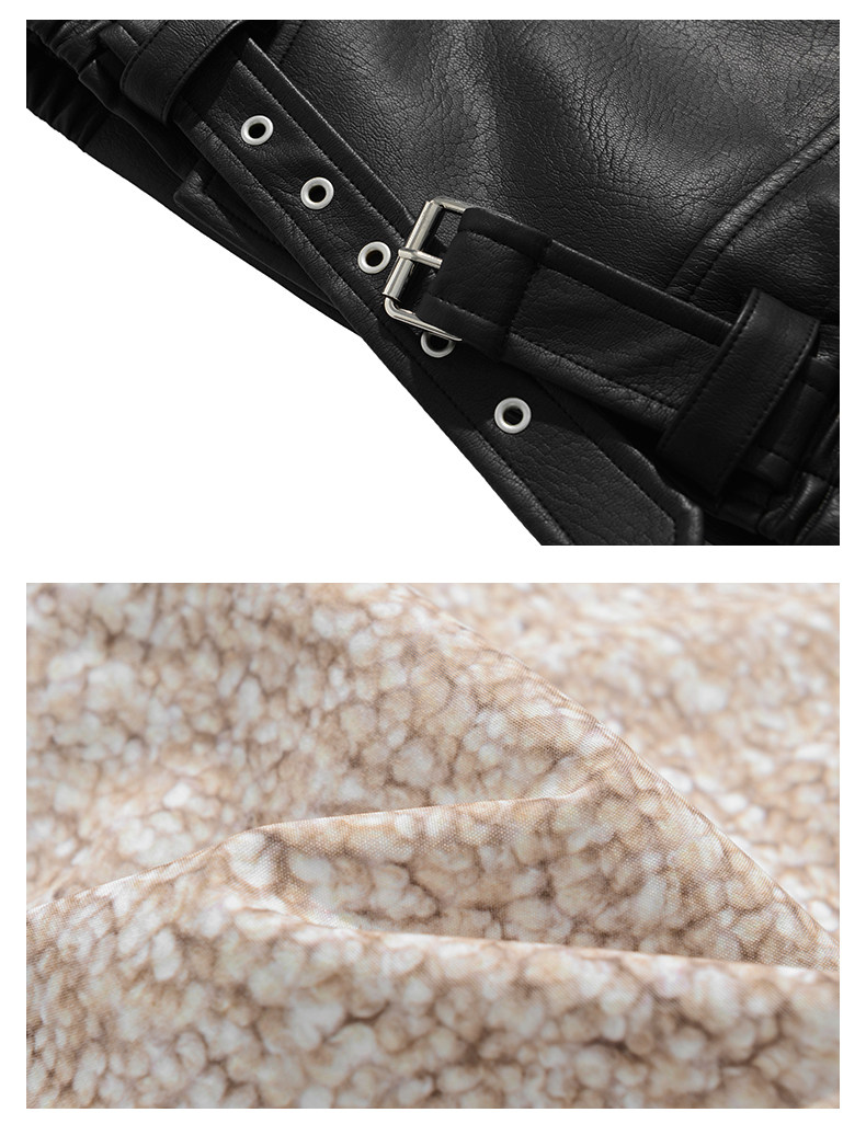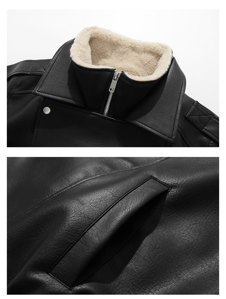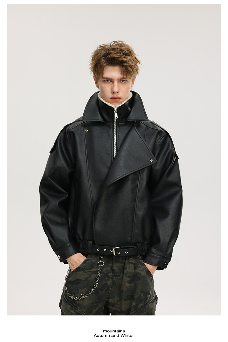 Wassup Krish American-Style Mountain Carving Fleece-Lined Leather Jacket for Men, New Winter Thickened Motorcycle Leather and Fur Integrated Coat