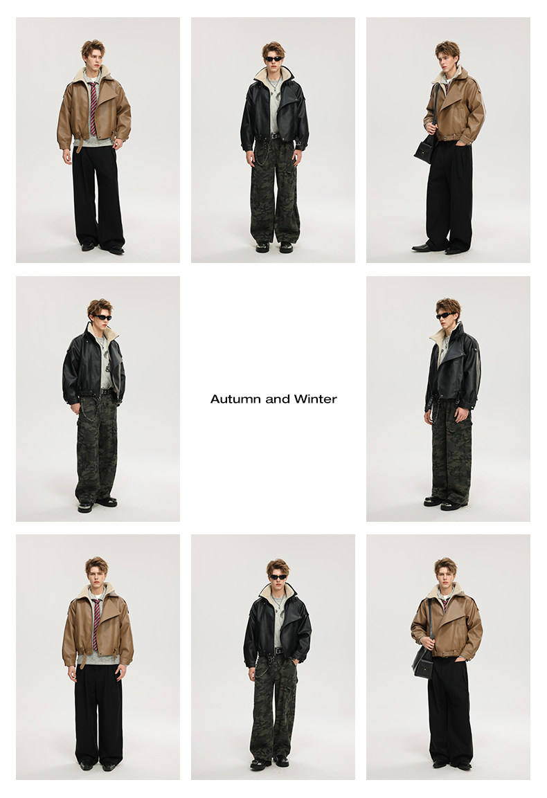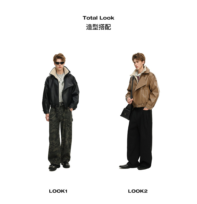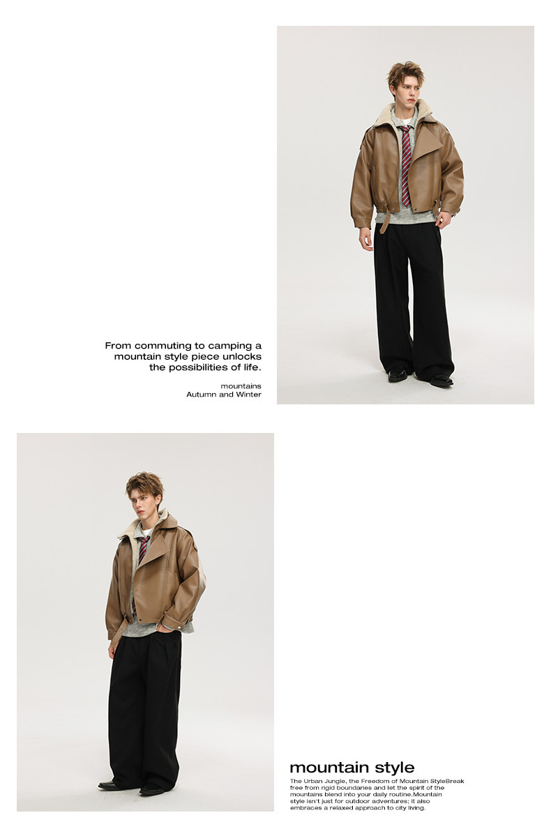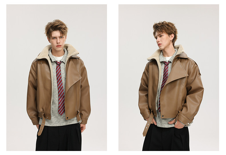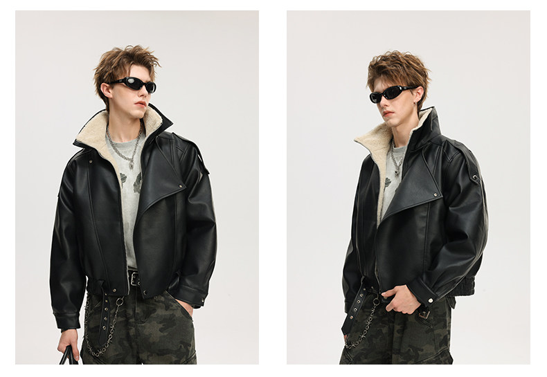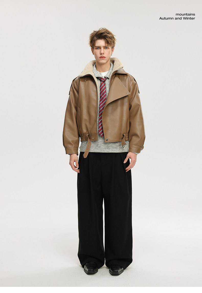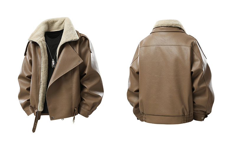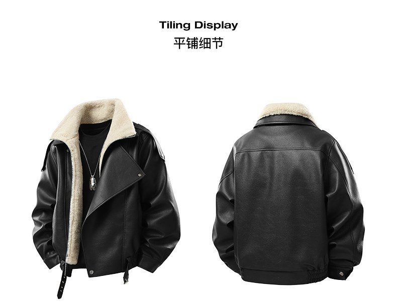 Wassup Krish American-Style Mountain Carving Fleece-Lined Leather Jacket for Men, New Winter Thickened Motorcycle Leather and Fur Integrated Coat