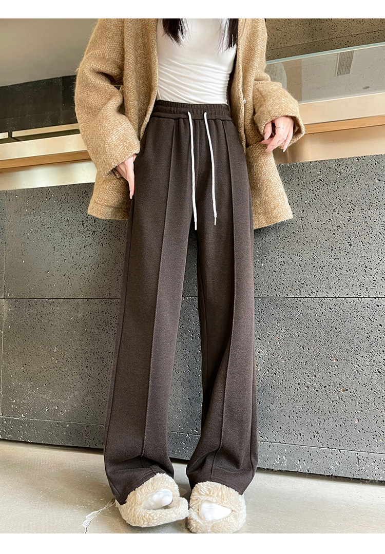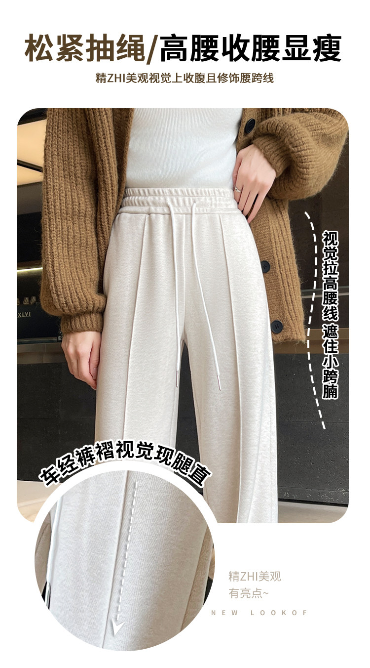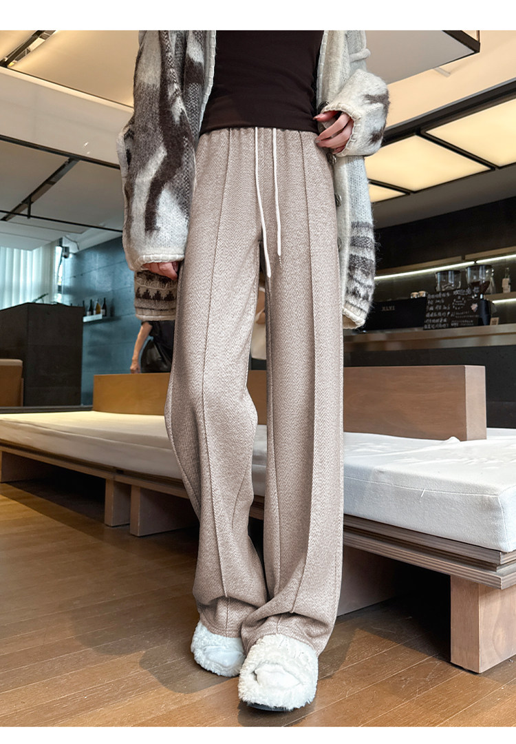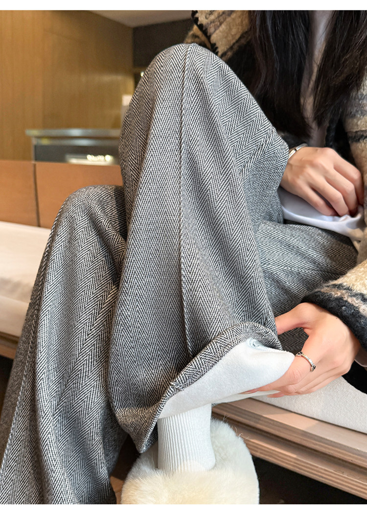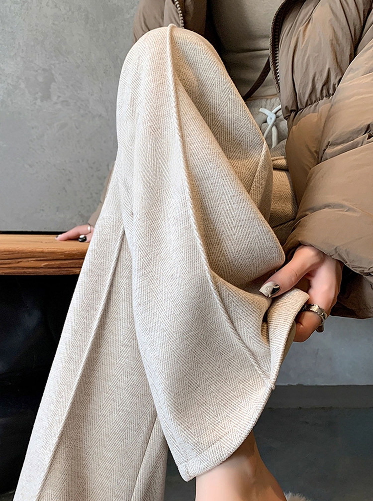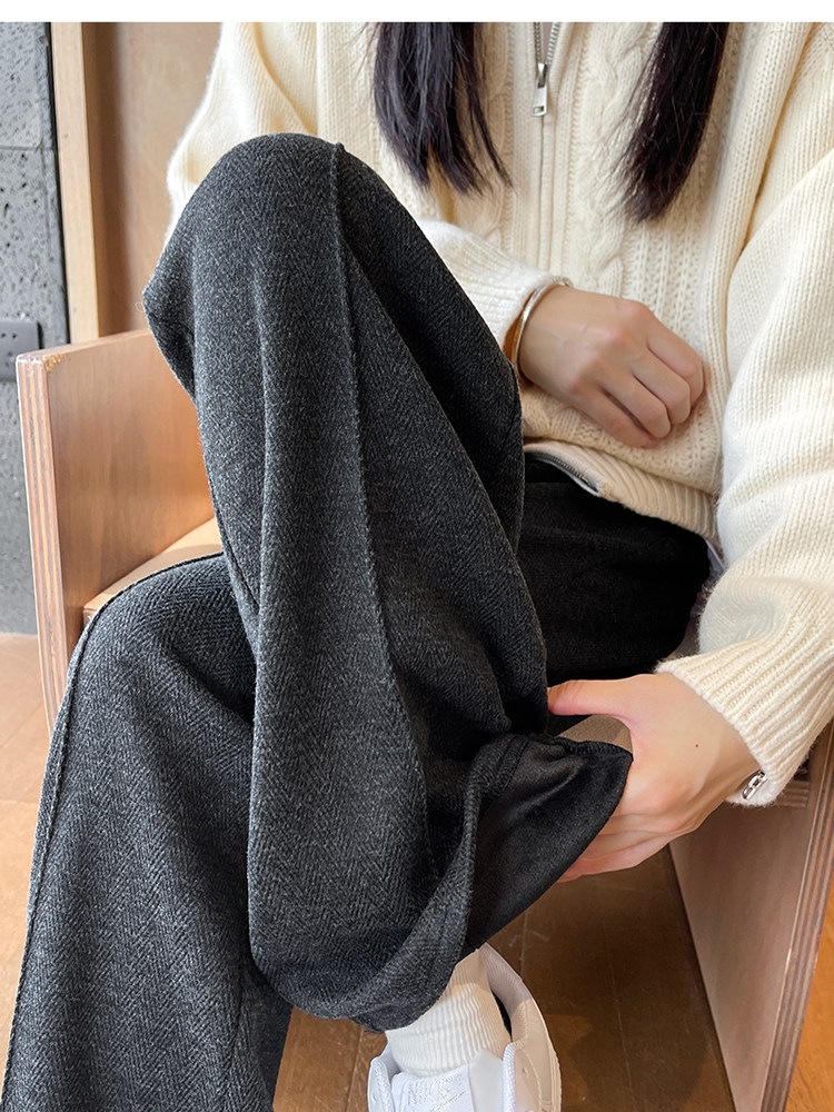 Narrow Wide-Leg Pants for Women, Winter, Petite, Casual, Fleece-Lined, Thickened Sweatpants, Herringbone Woolen, Glutinous Rice Straight-Leg Pants