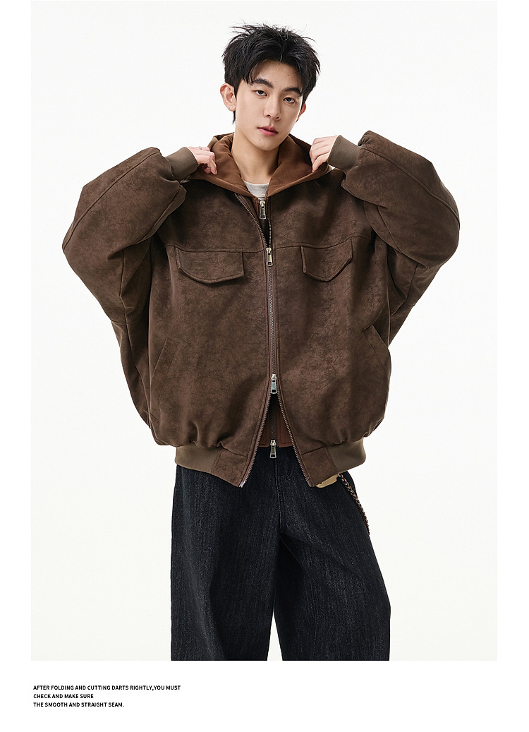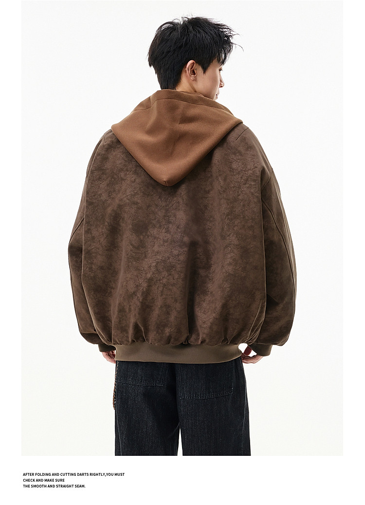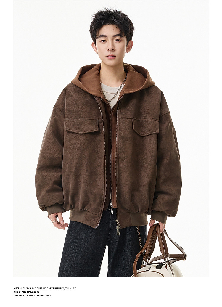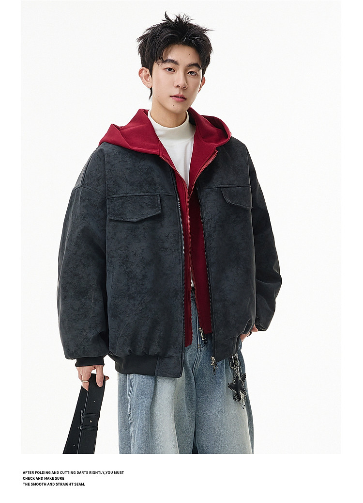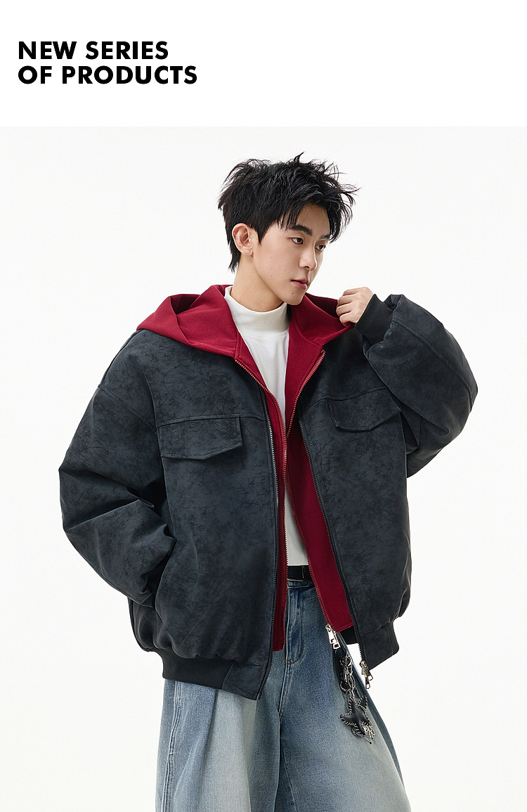 Wukong Has in Stock American Retro Style Faux Two-Piece Patchwork Hooded Cotton Coat for Men, Winter Pu Leather Windproof and Warm Cotton Jacket