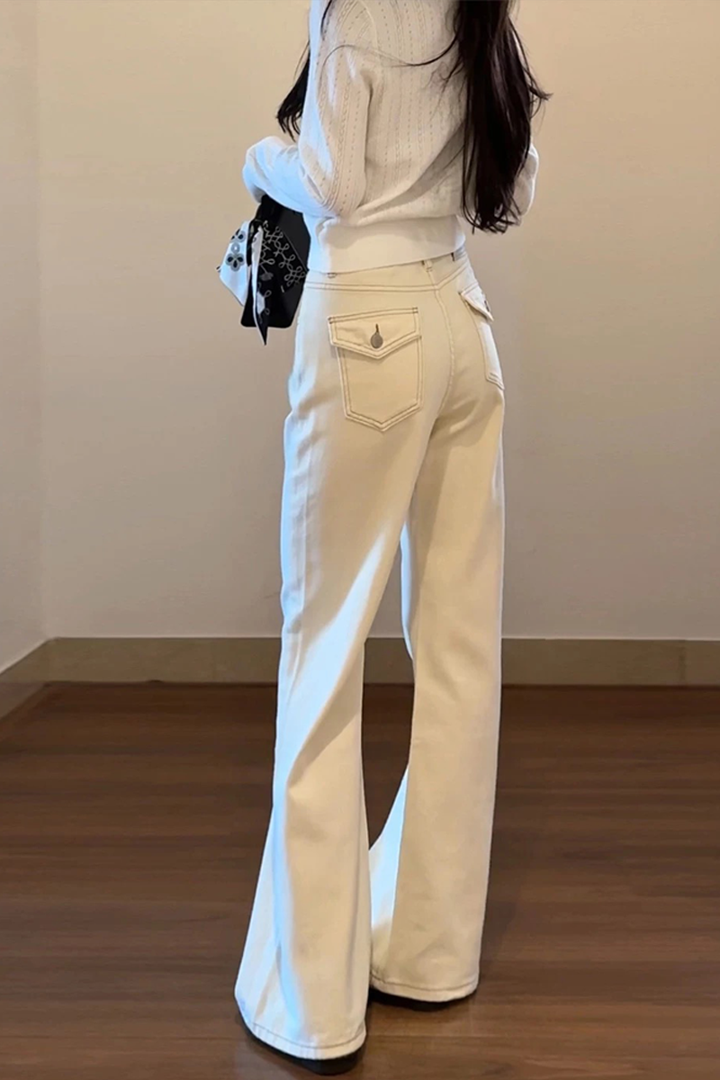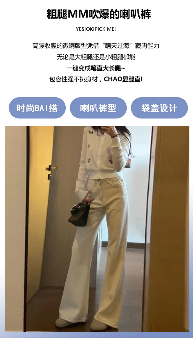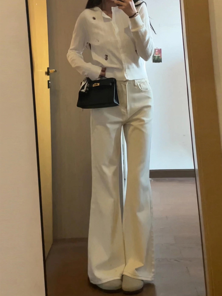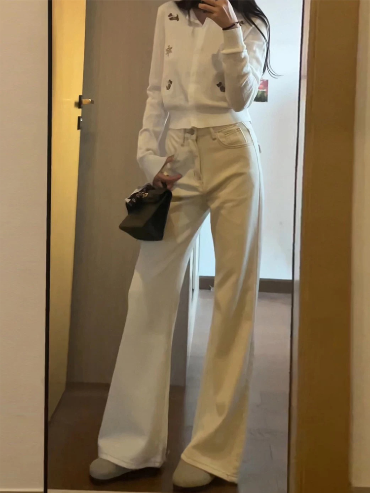 Off-White Fleece-Lined Flared Jeans for Women, 2025 Autumn and Winter New Style, Slimming, Drapey, Non-Tight Straight-Leg Bell-Bottom Pants