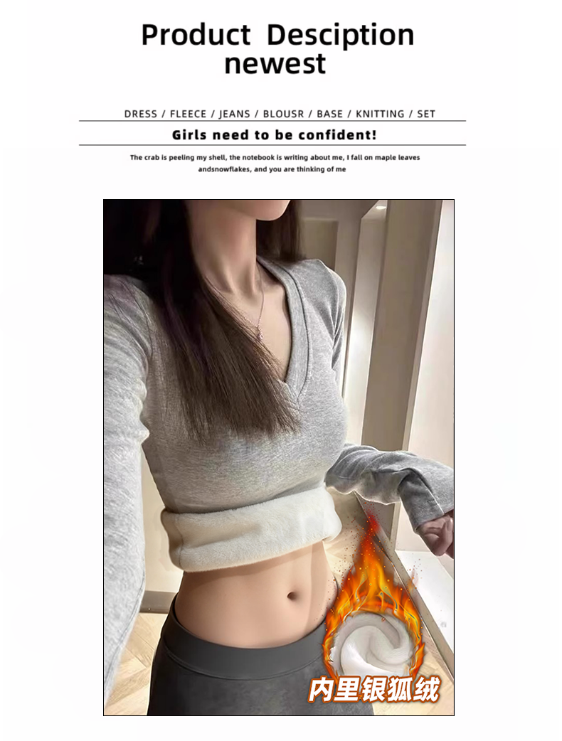 Winter Thickened Silver Fox Fur Gray Regular Shoulder V-Neck Long-Sleeve T-Shirt for Women, Warm Inner Layer Base Shirt, Trendy Waist-Cinching Top