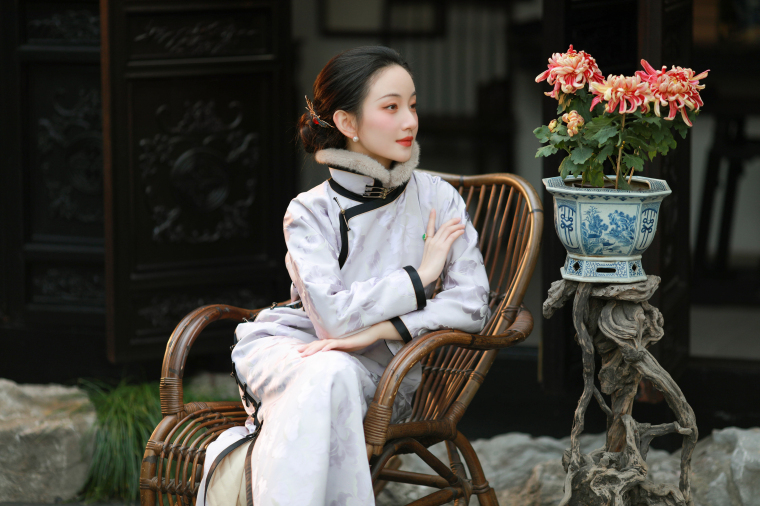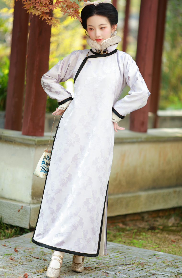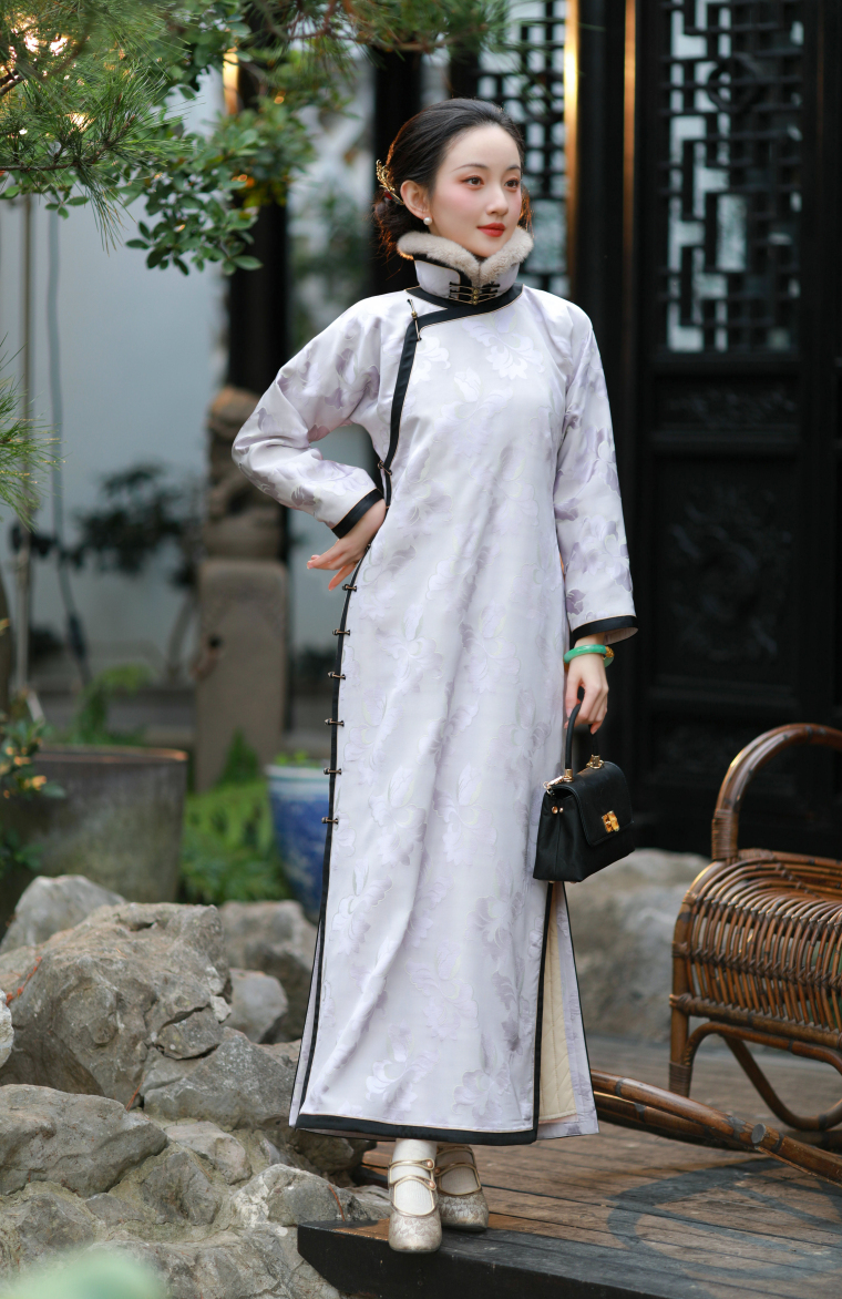 Purple Mist Flower Shadow丨2025 Winter New Collection丨Vintage Republic of China Style Jacquard Satin with Trim, Yuanbao Collar, Padded Thick Cheongsam