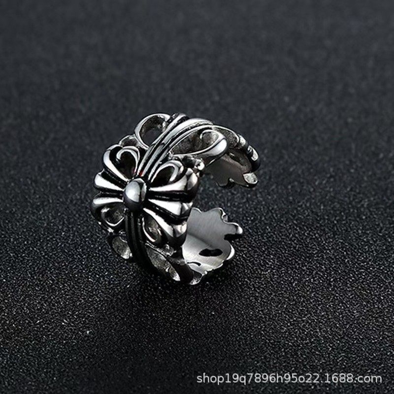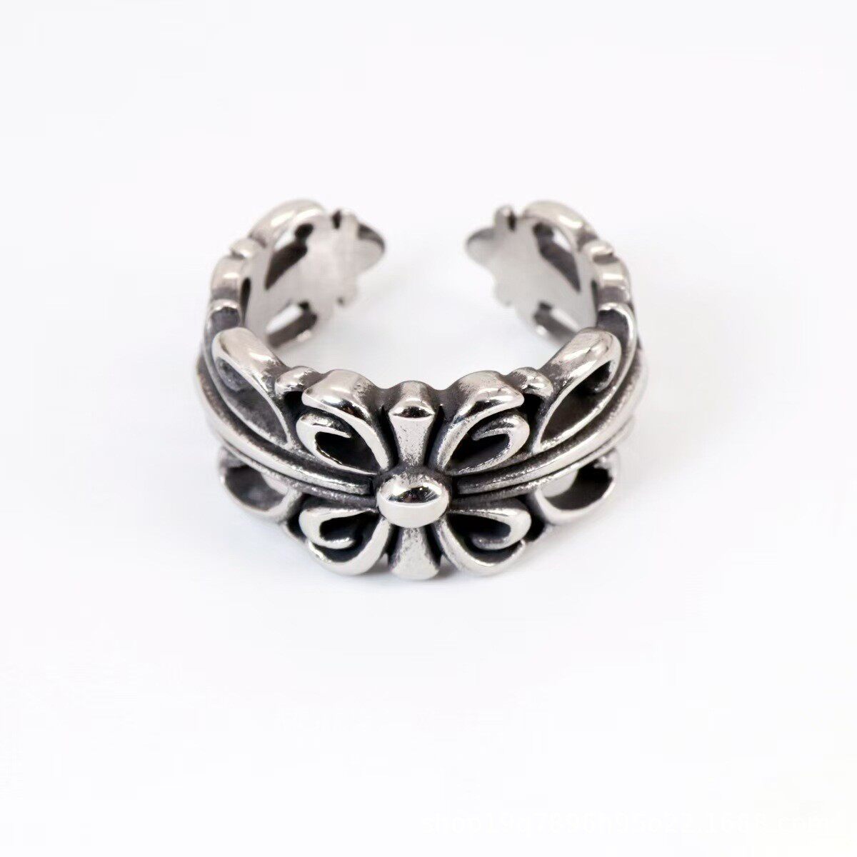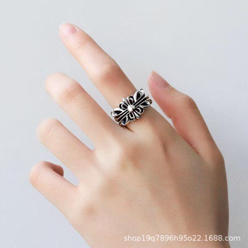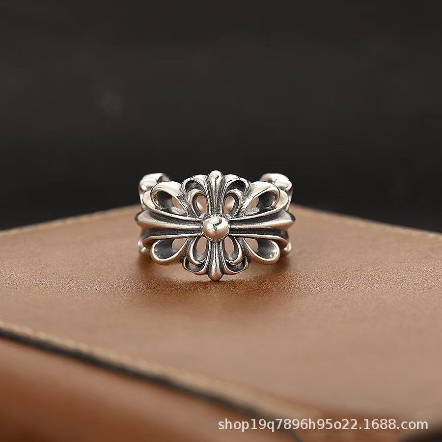All-Over S925 Sterling Silver Cross Open Ring for Men and Women, Retro Trendy Hip-Hop Silver Jewelry Ring
