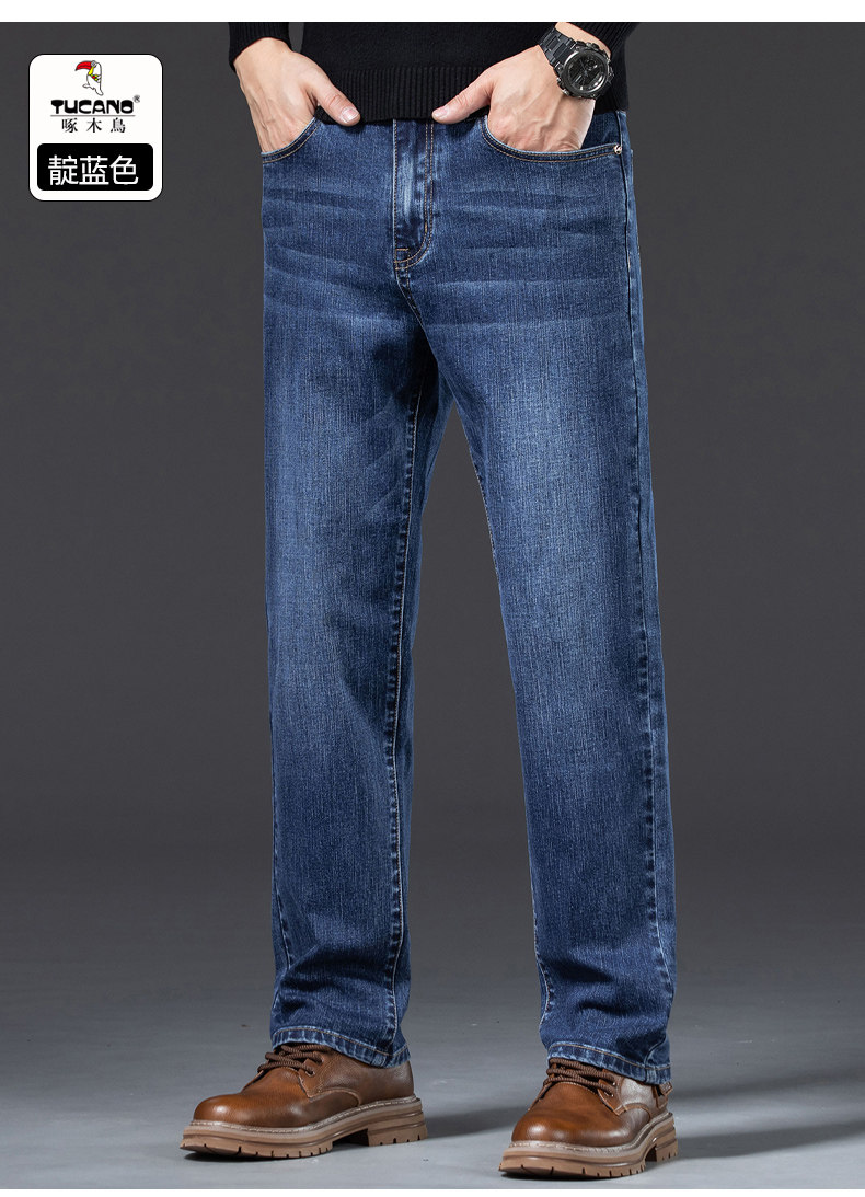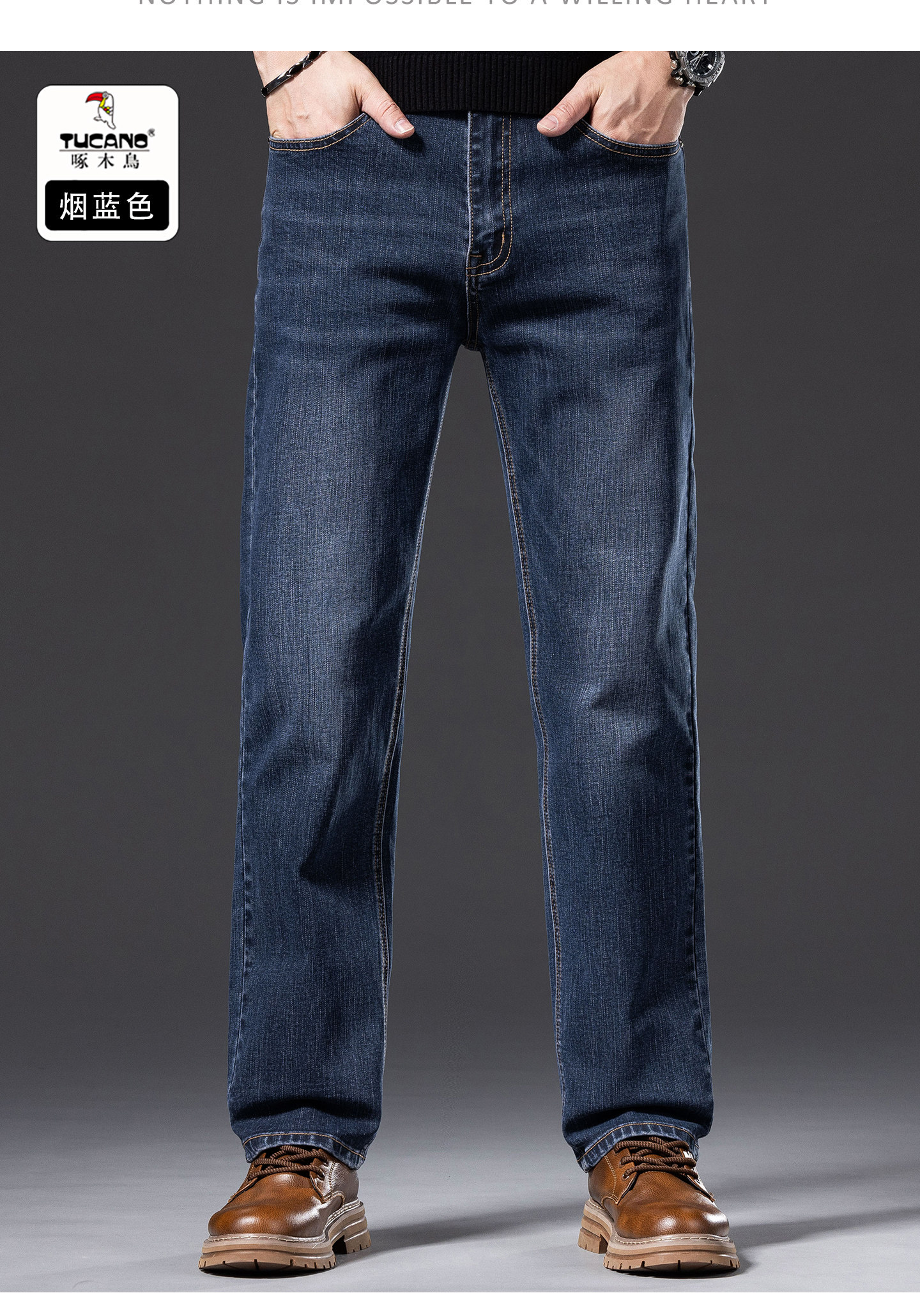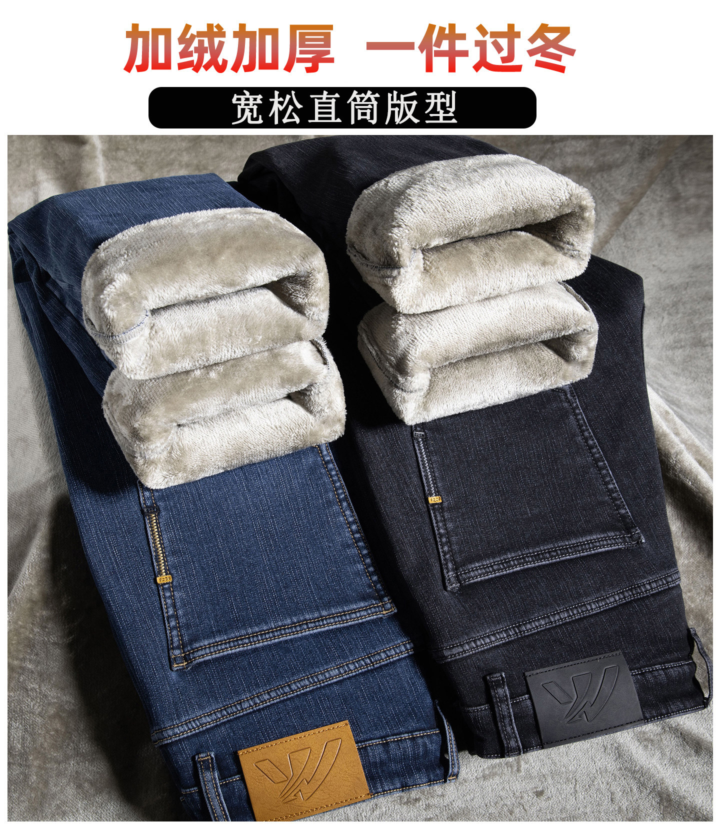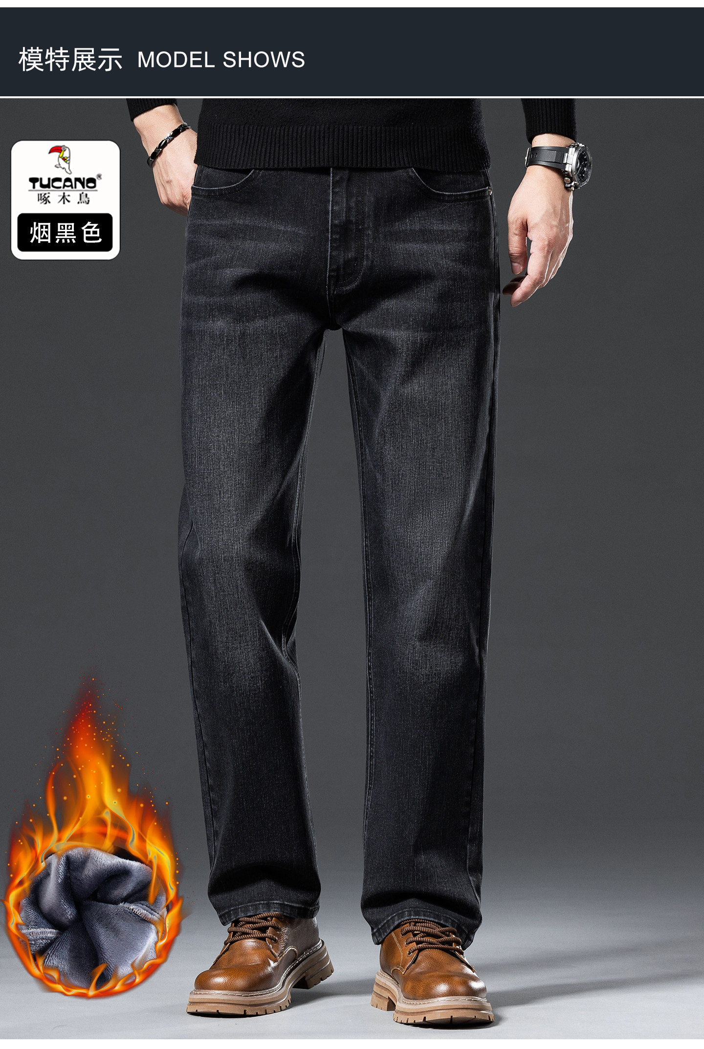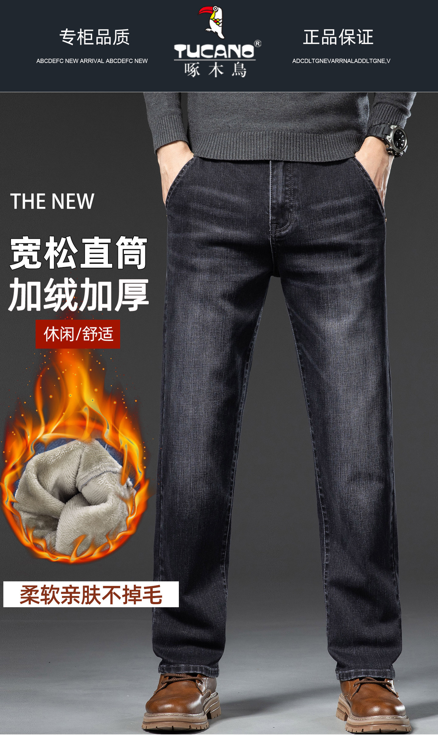 Woodpecker Men's Fleece-Lined Thickened Jeans Winter Ultra-Thick Warm Loose Straight-Leg Trousers Cold-Resistant Casual Pants