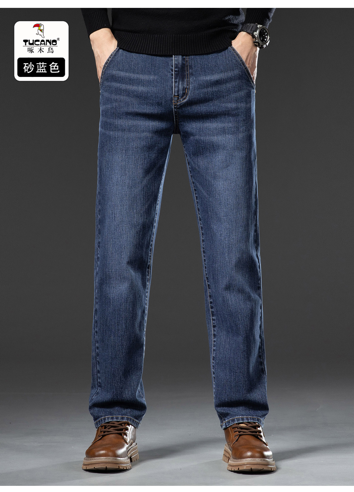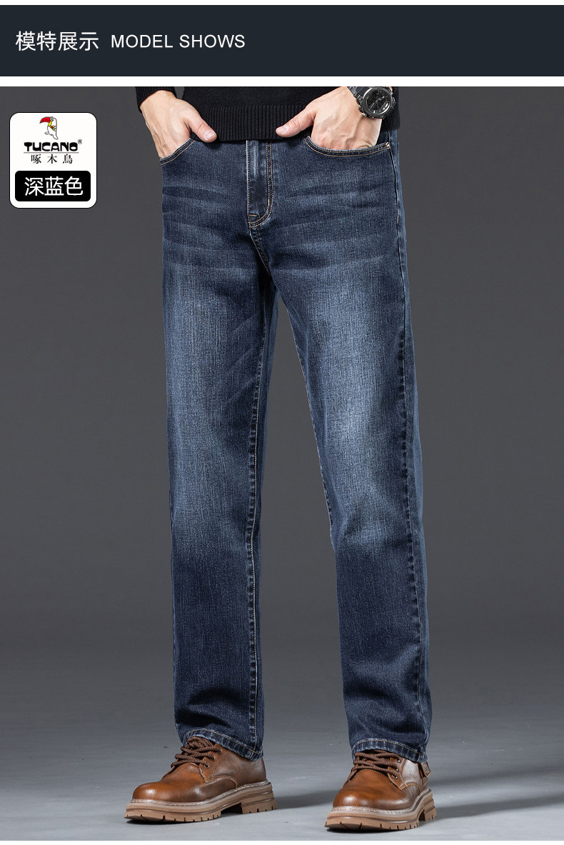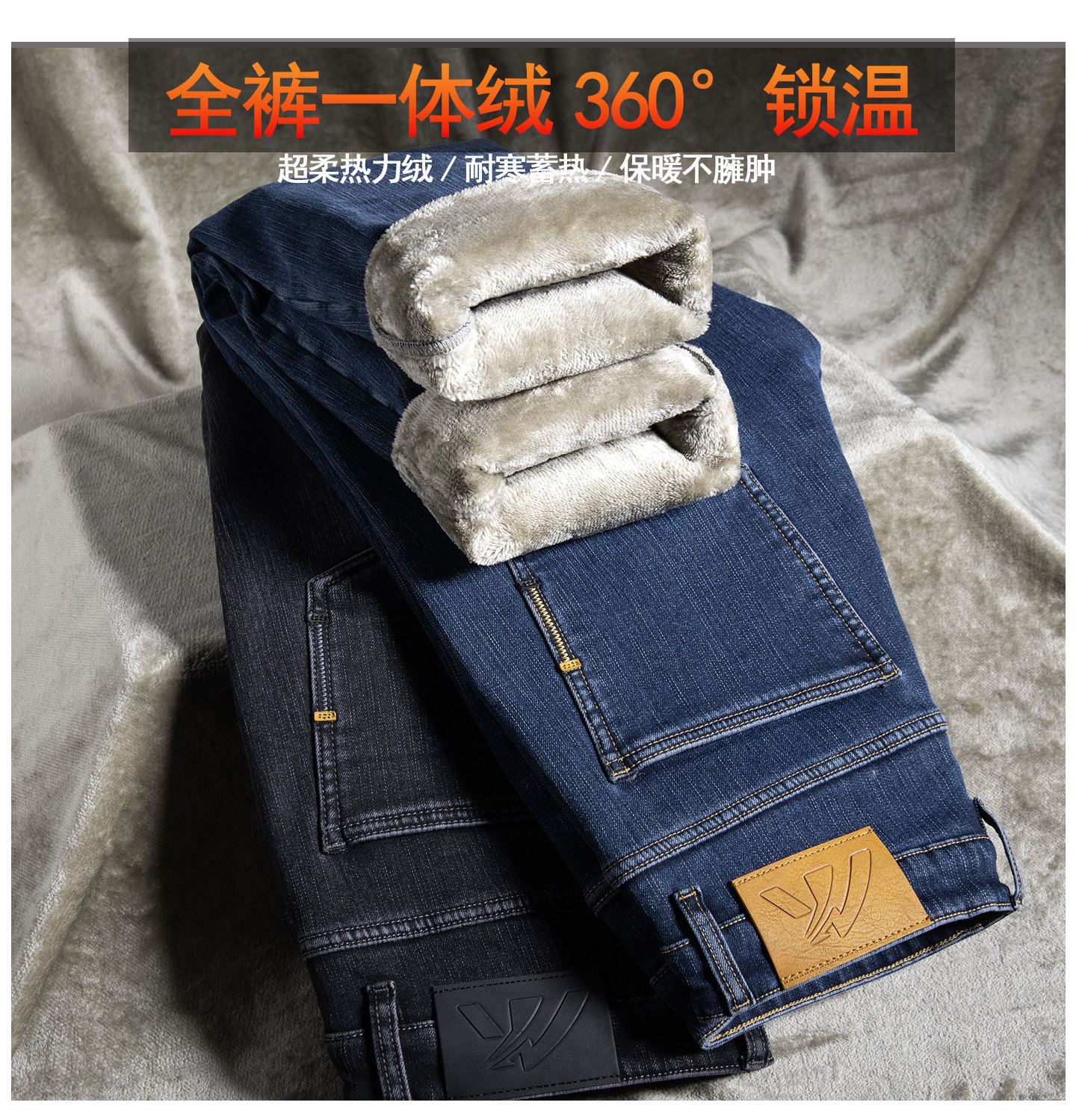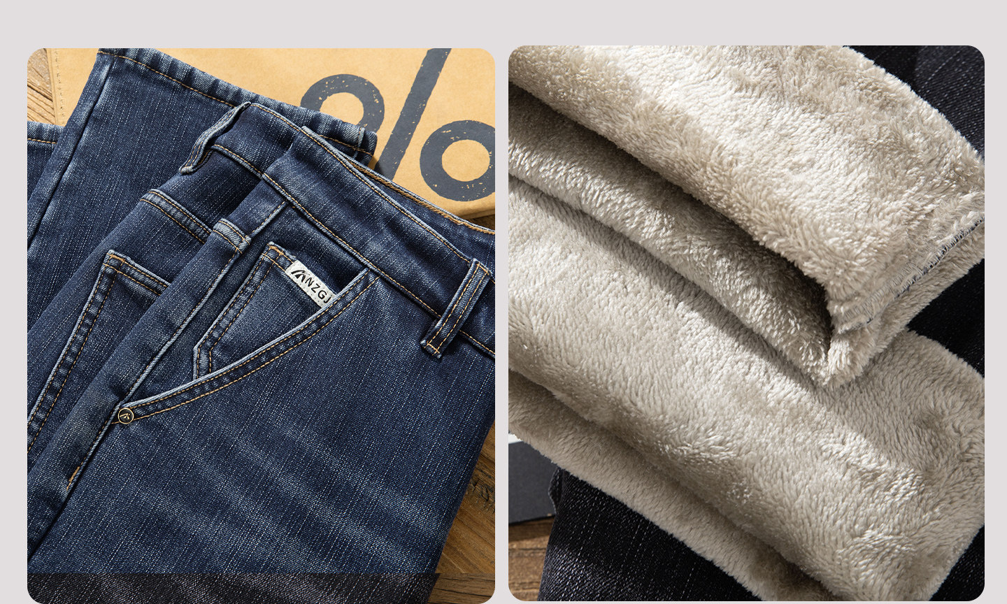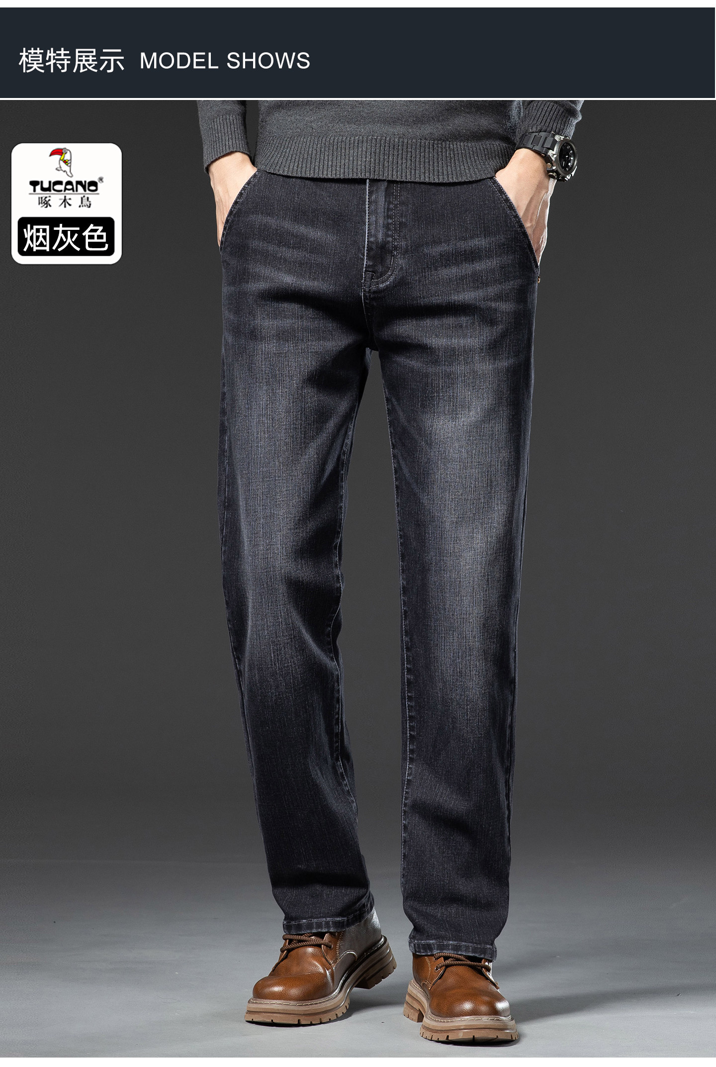 Woodpecker Men's Fleece-Lined Thickened Jeans Winter Ultra-Thick Warm Loose Straight-Leg Trousers Cold-Resistant Casual Pants
