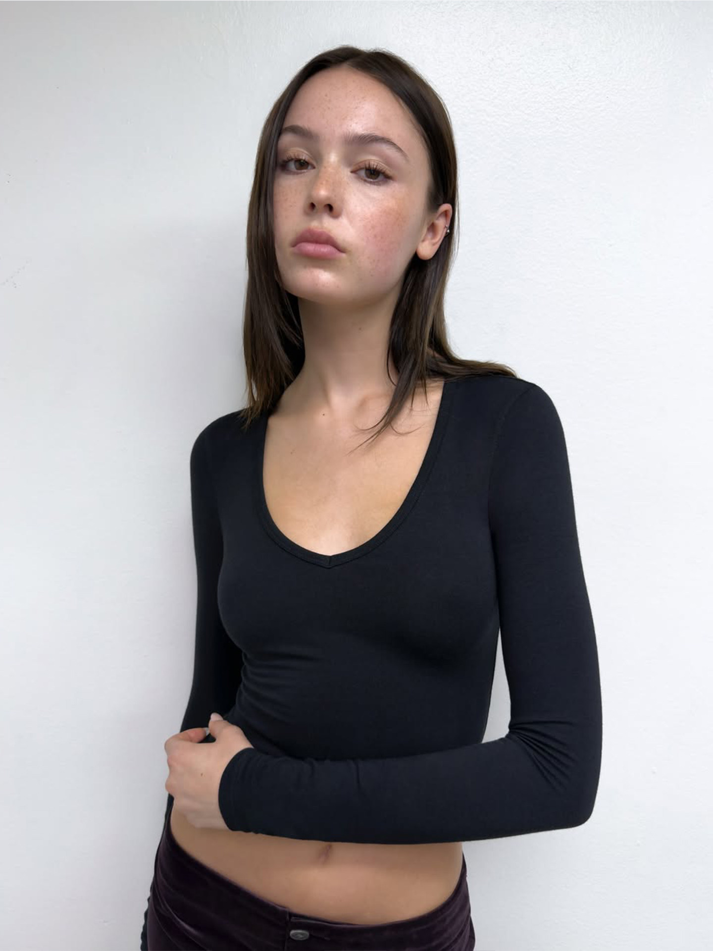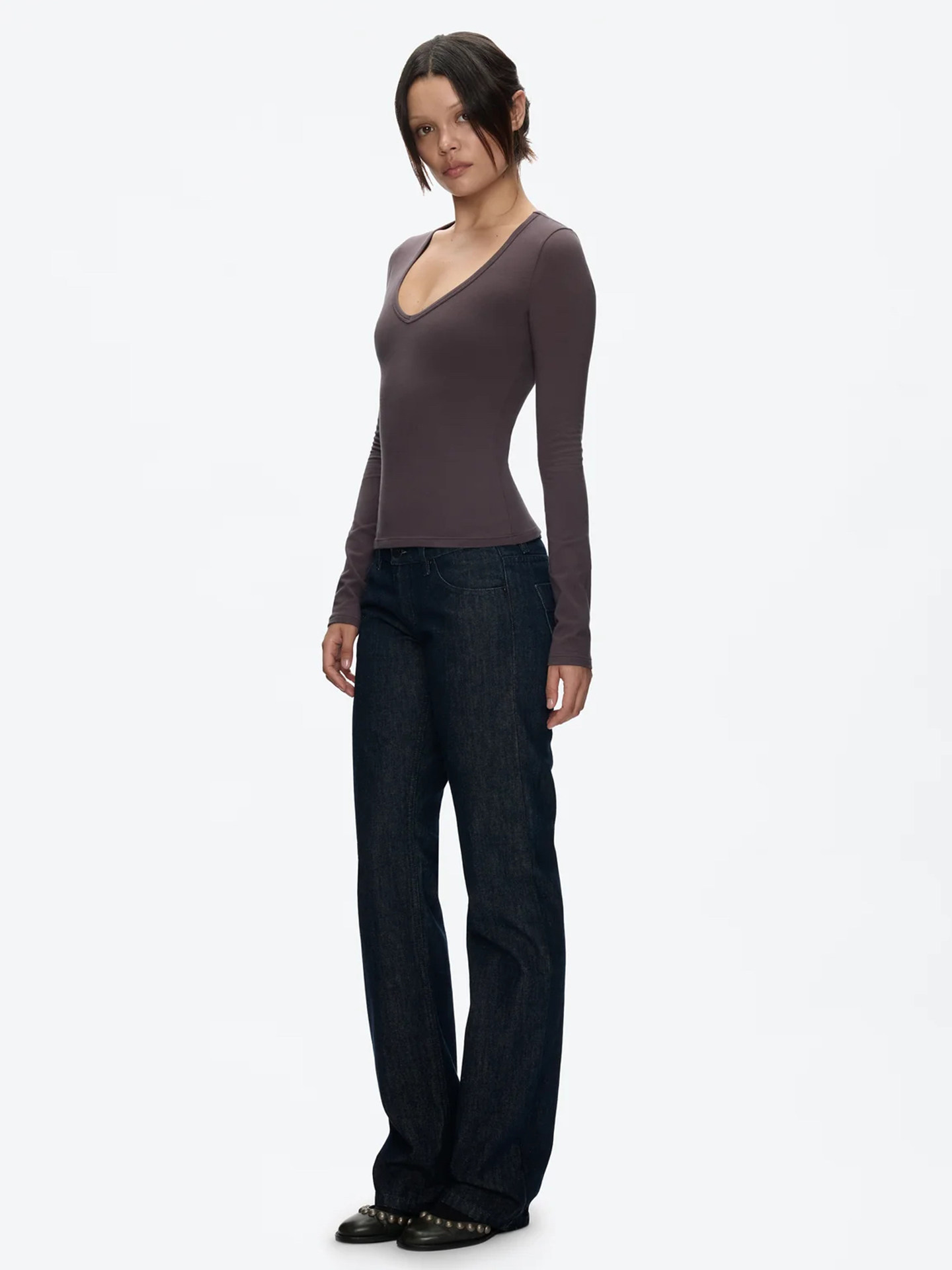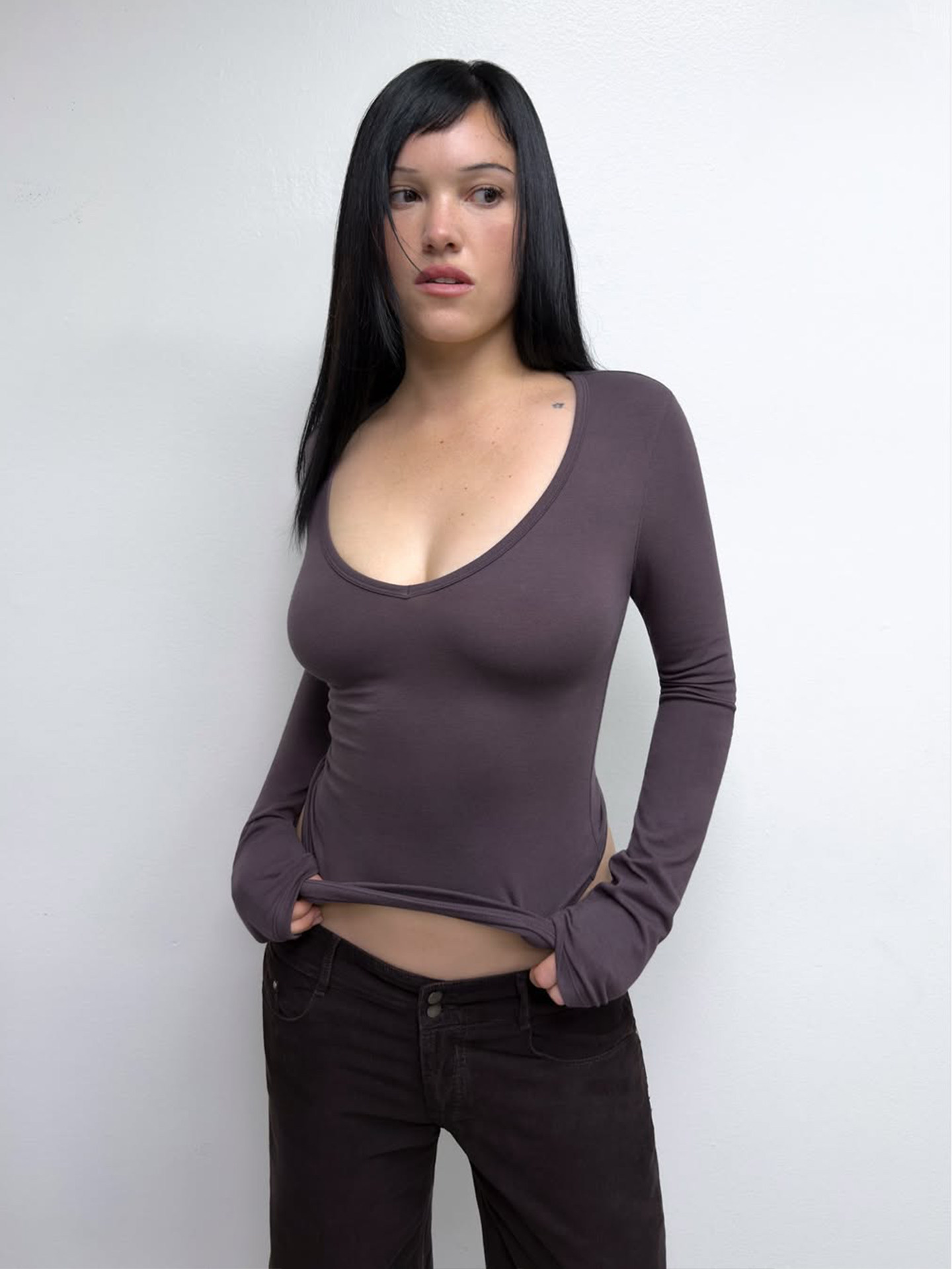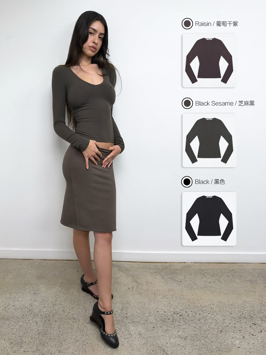Tankair Grape Purple New V-Neck Slim Long Sleeve Cotton Stretch Series Solid Color Waist-Cinching Cut-Out Base Shirt