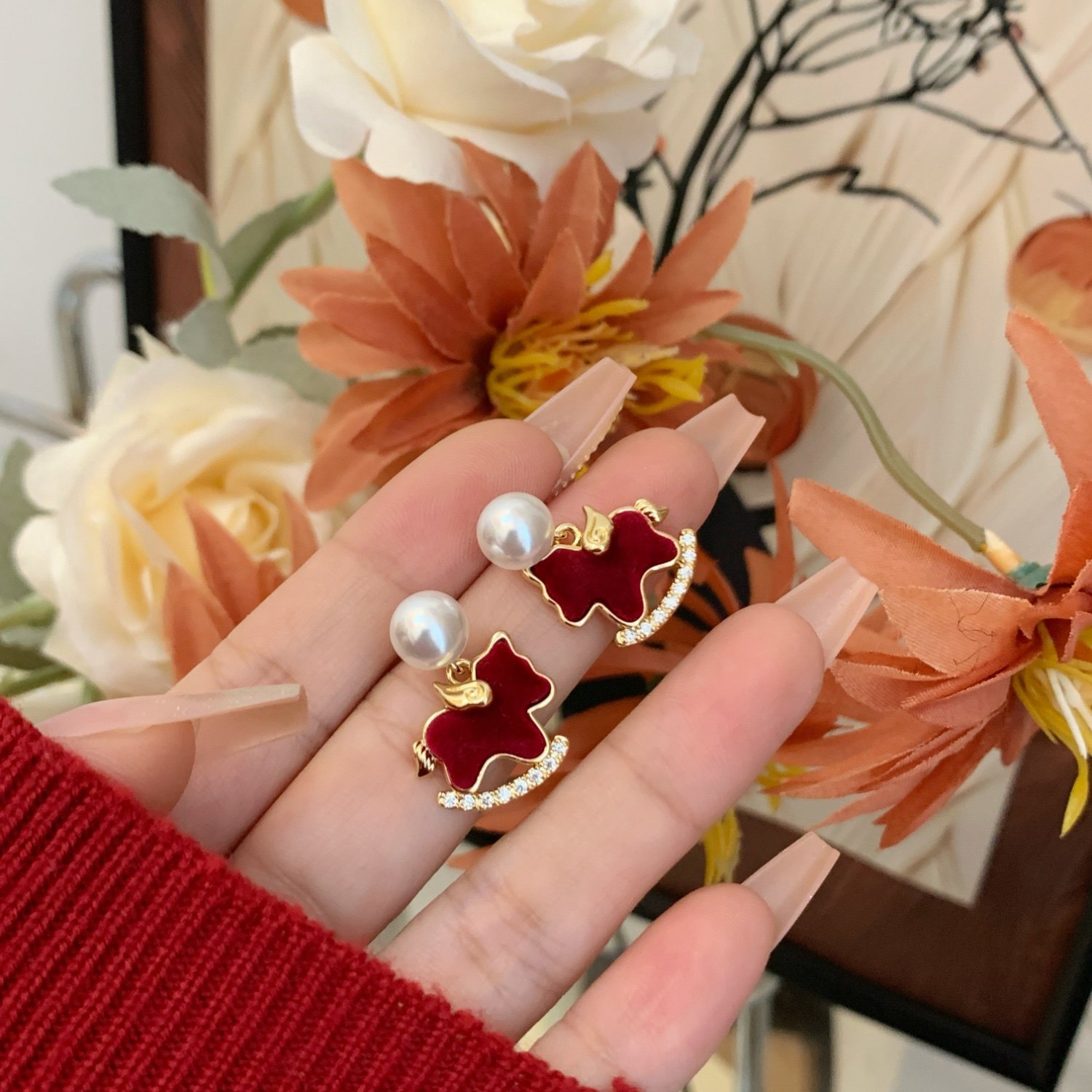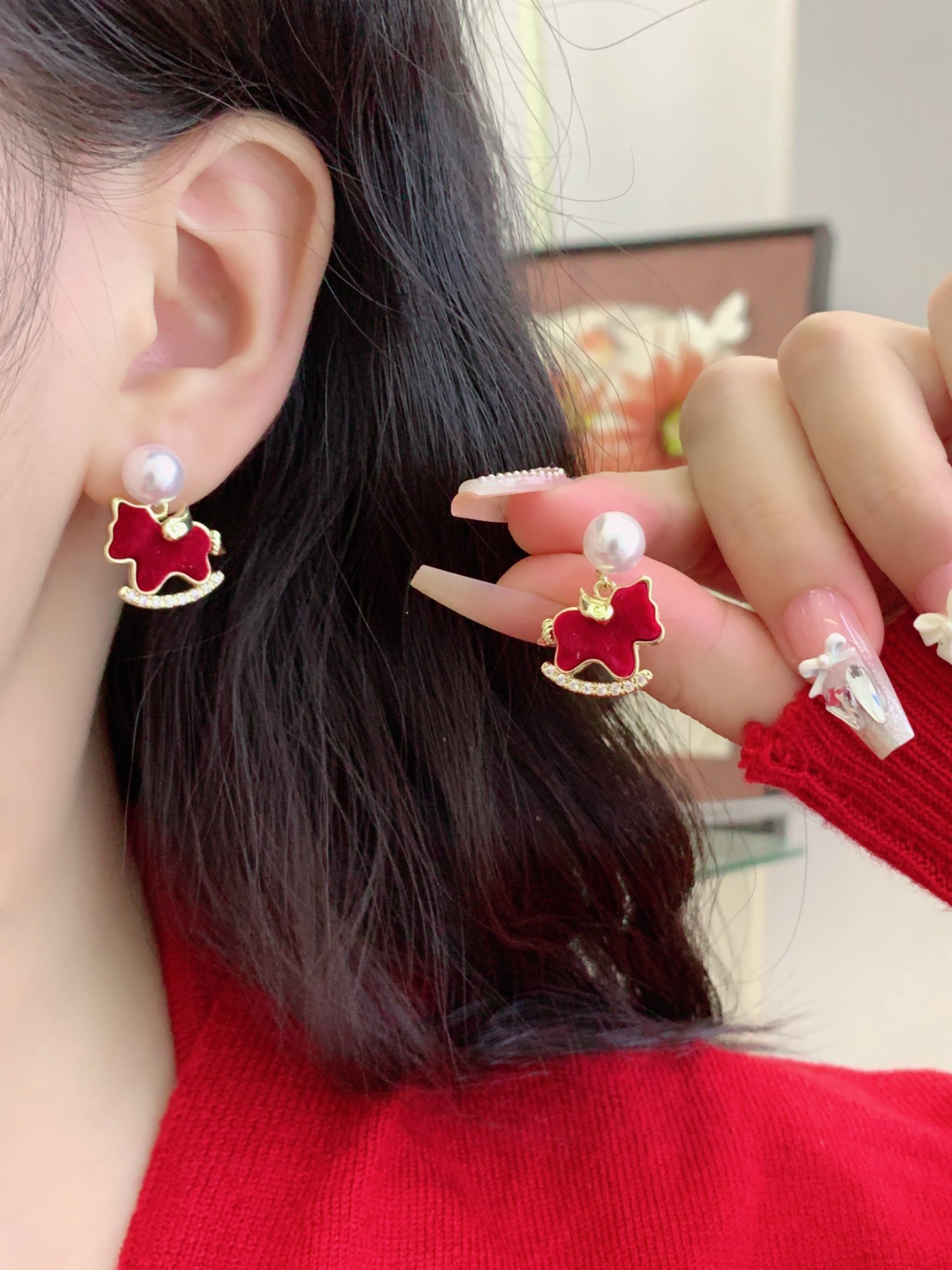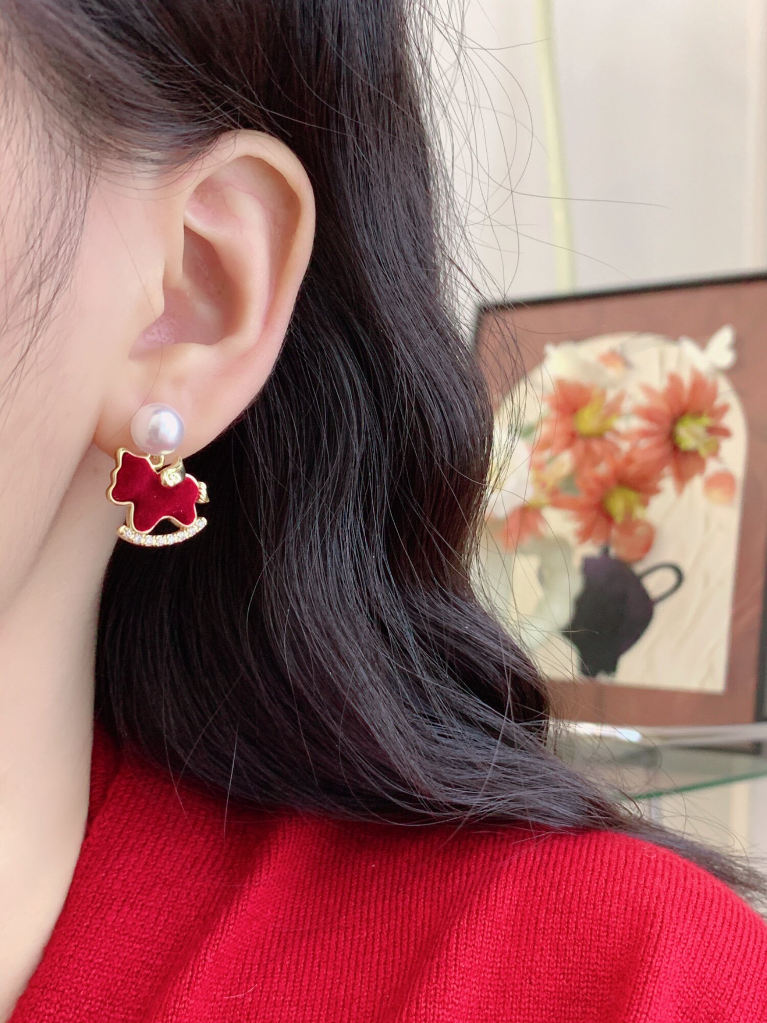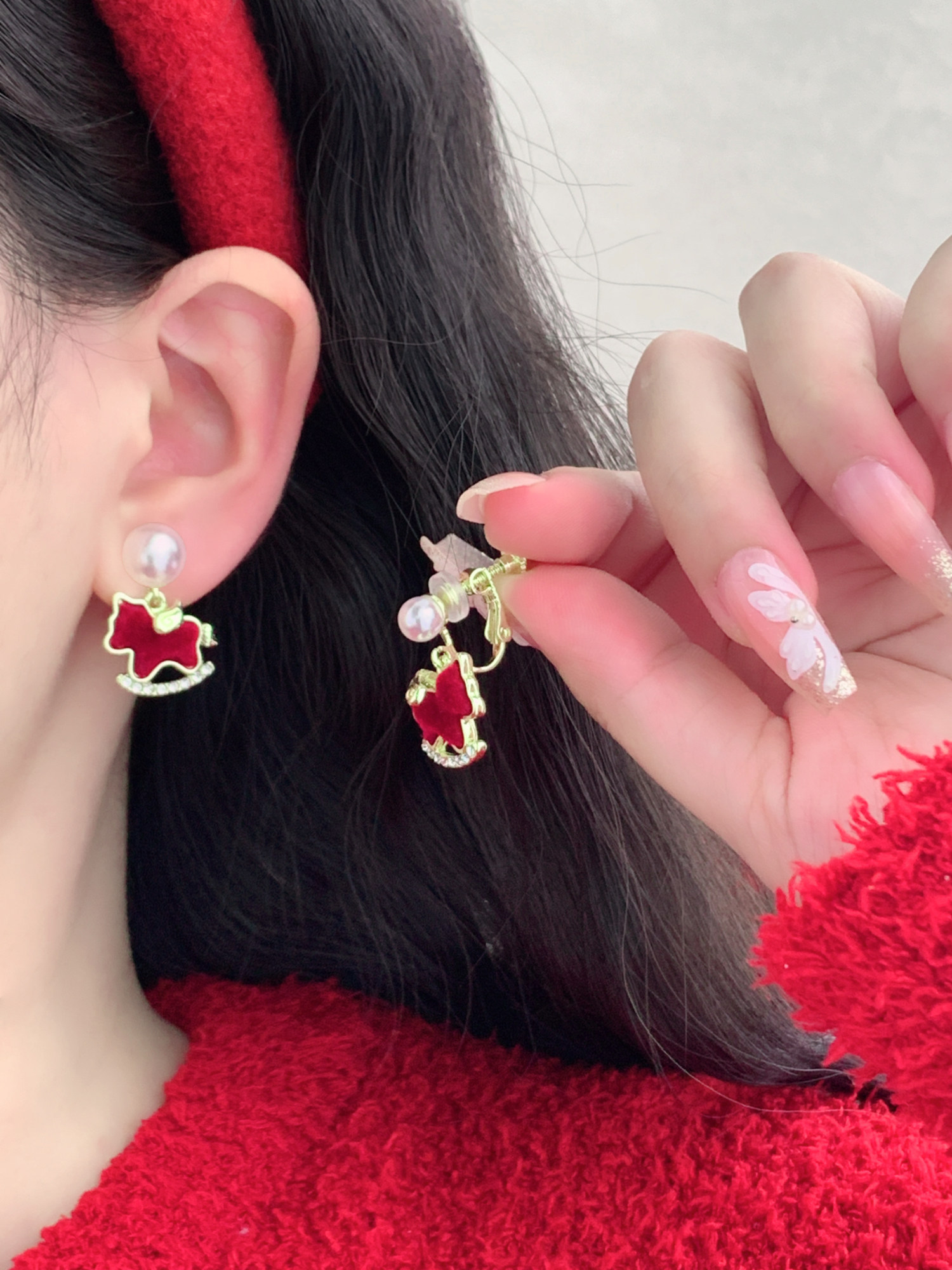 Winter Cute Velvet Pony Pearl Earrings Without Ear Holes, Ear Clips for Women, Red New Year Zodiac Year Gift Ear Accessories
