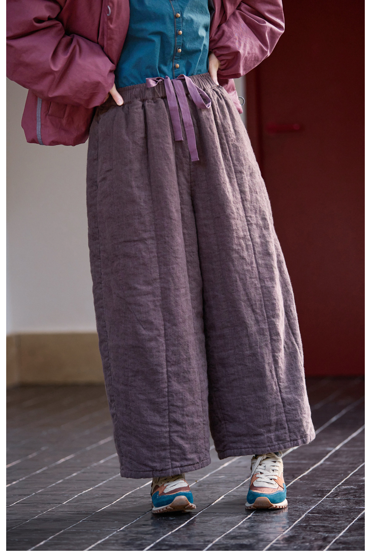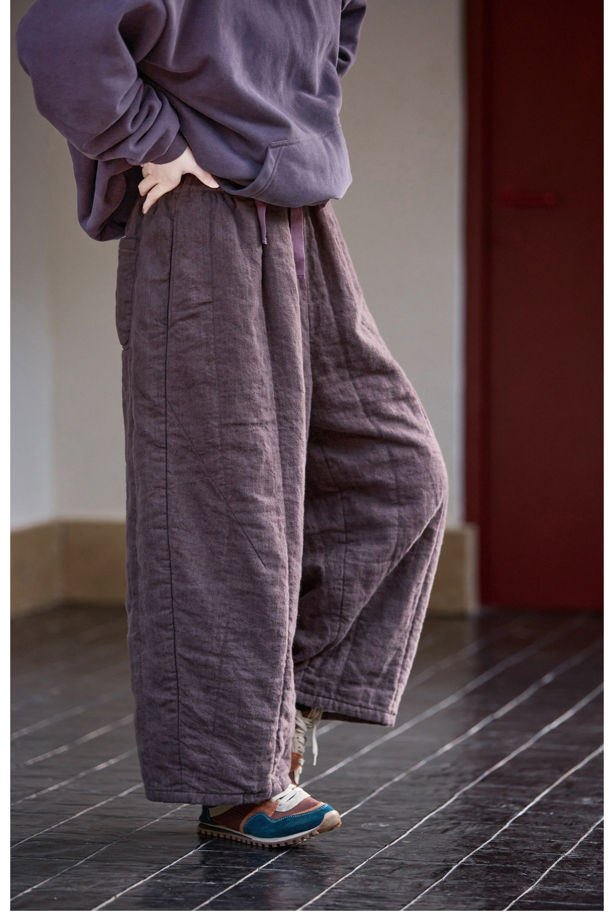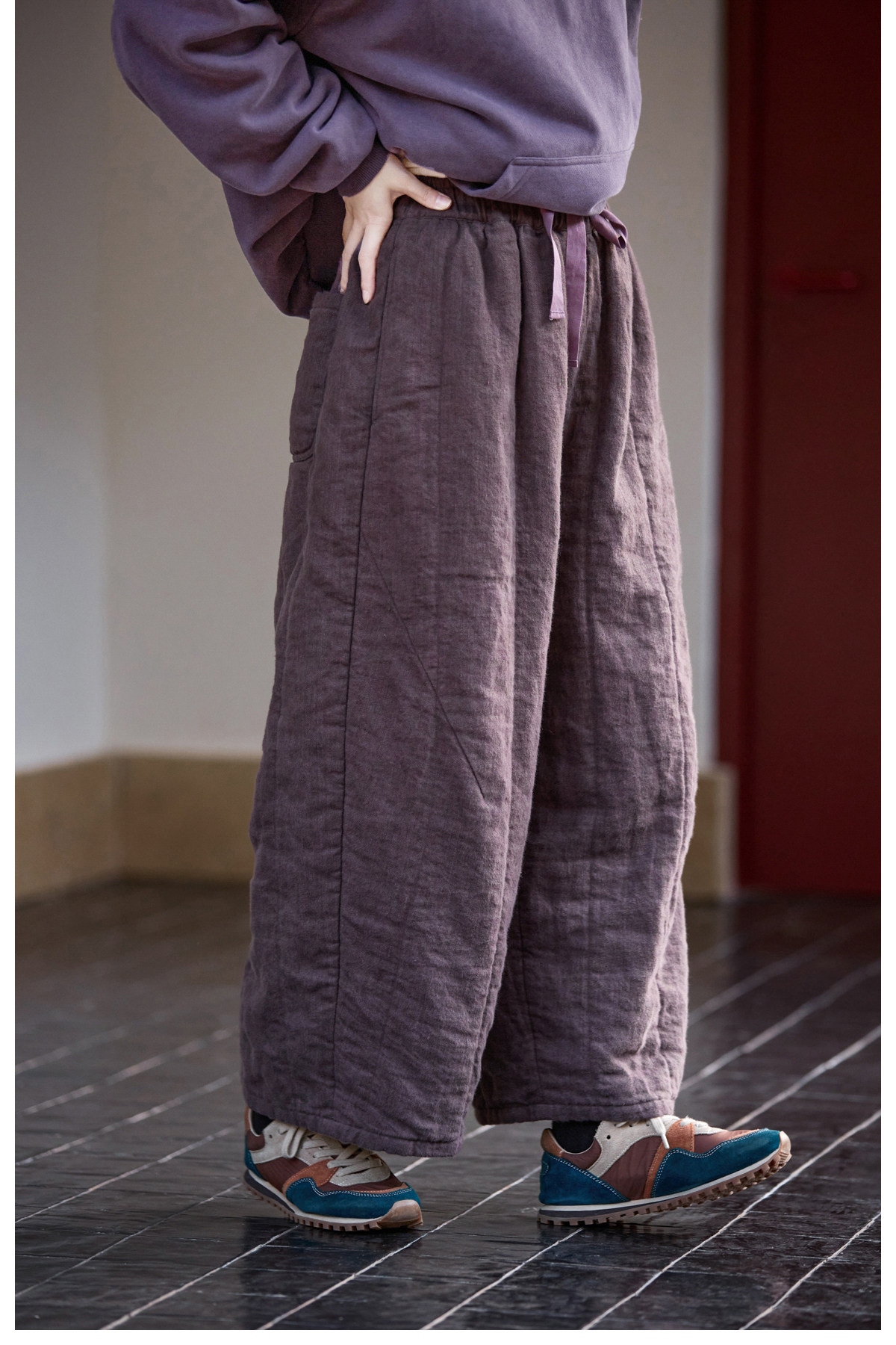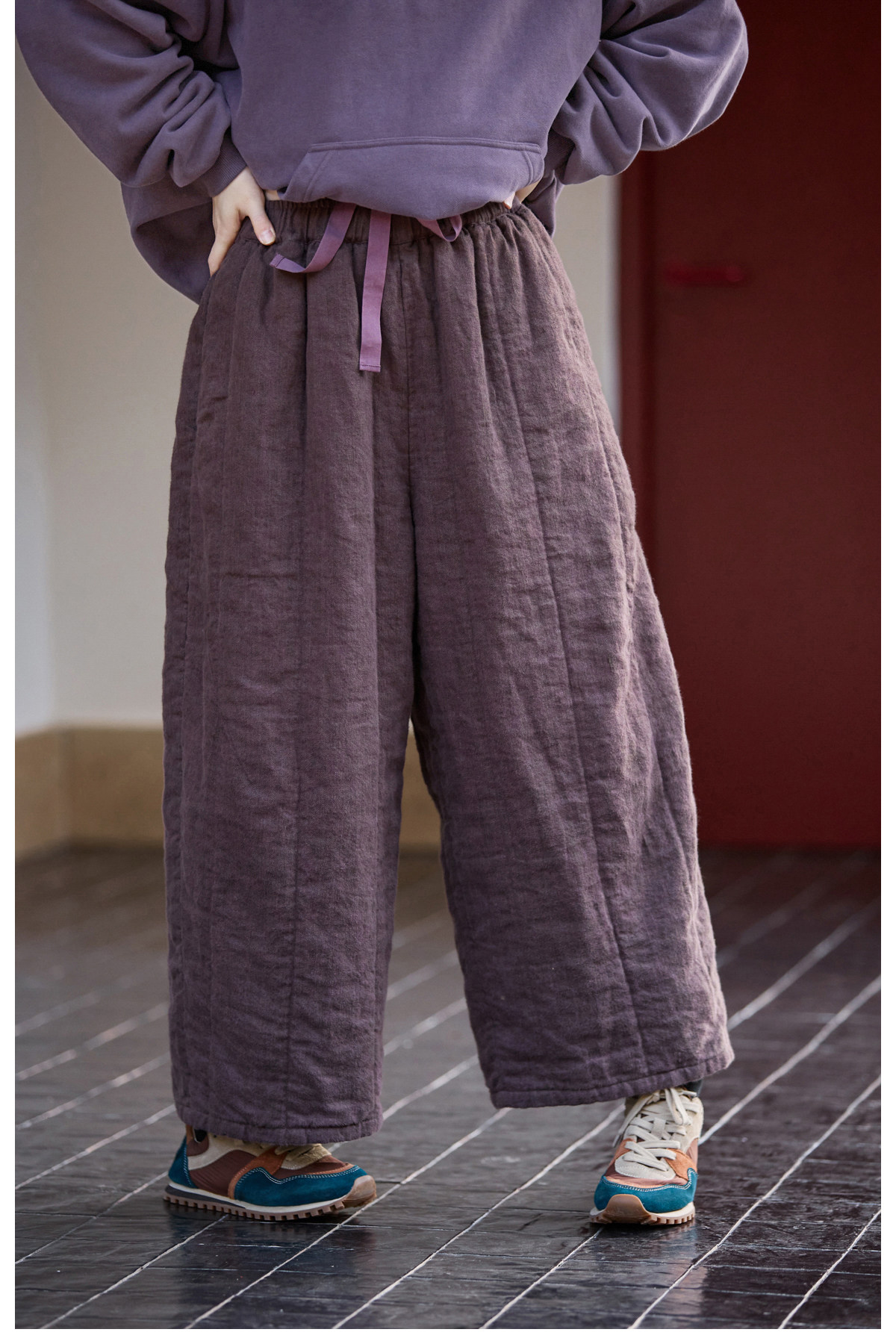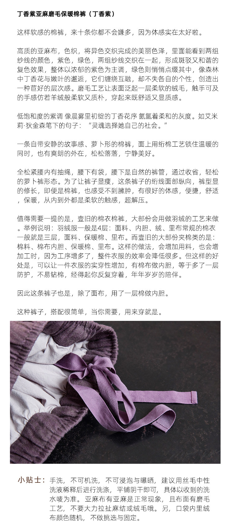 Original [Folk Art] Winter Edition Lilac Purple Linen Brushed High-Quality Warm Elastic Waist Cotton Pants 8583-1B