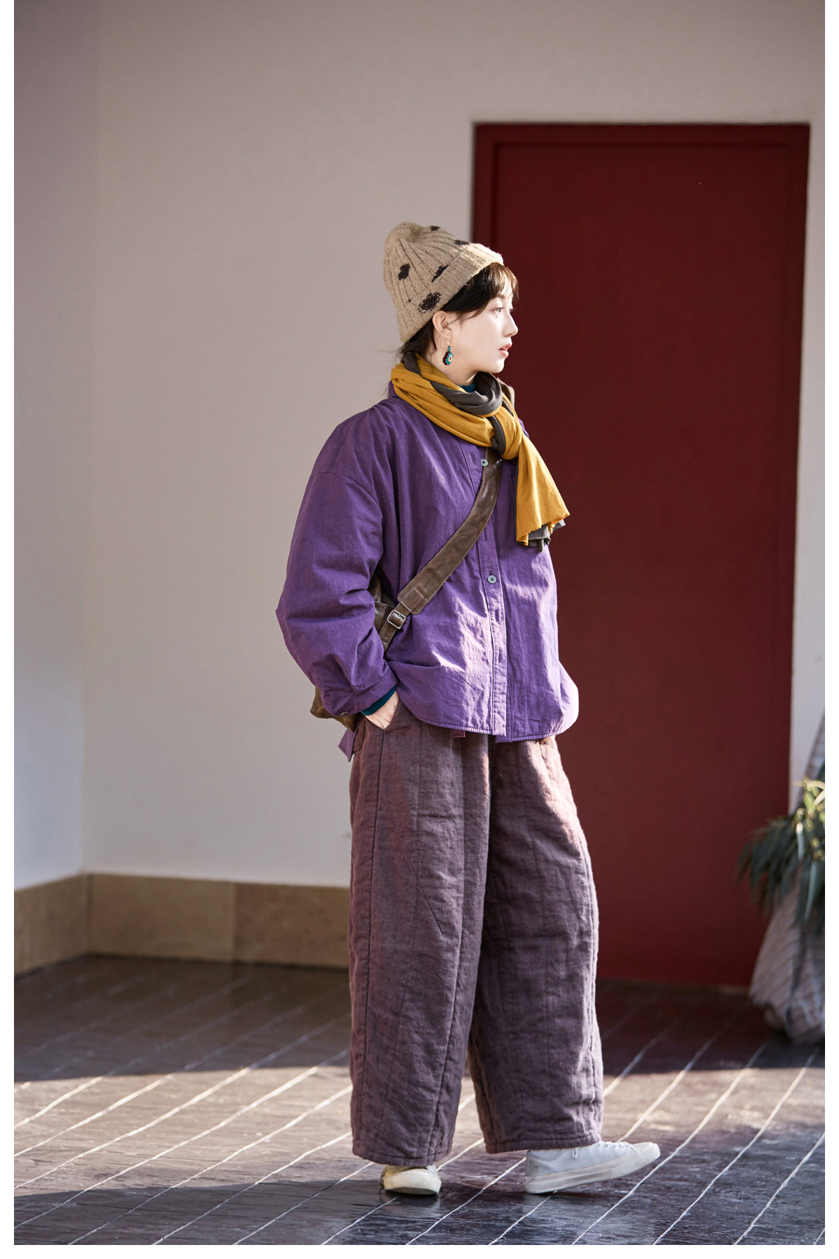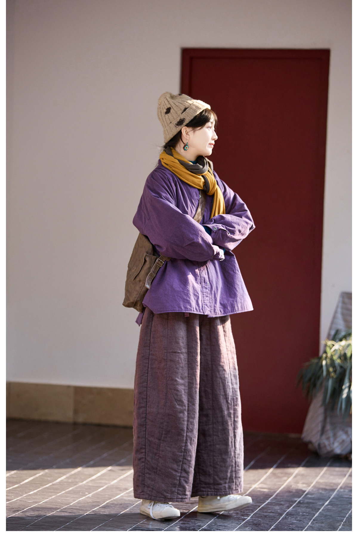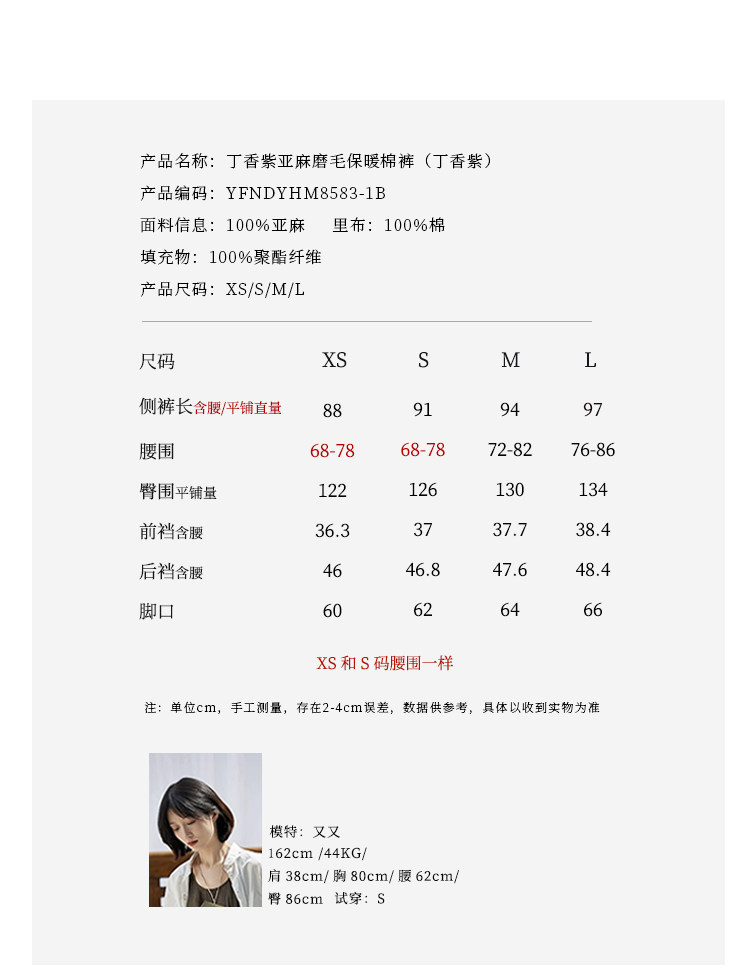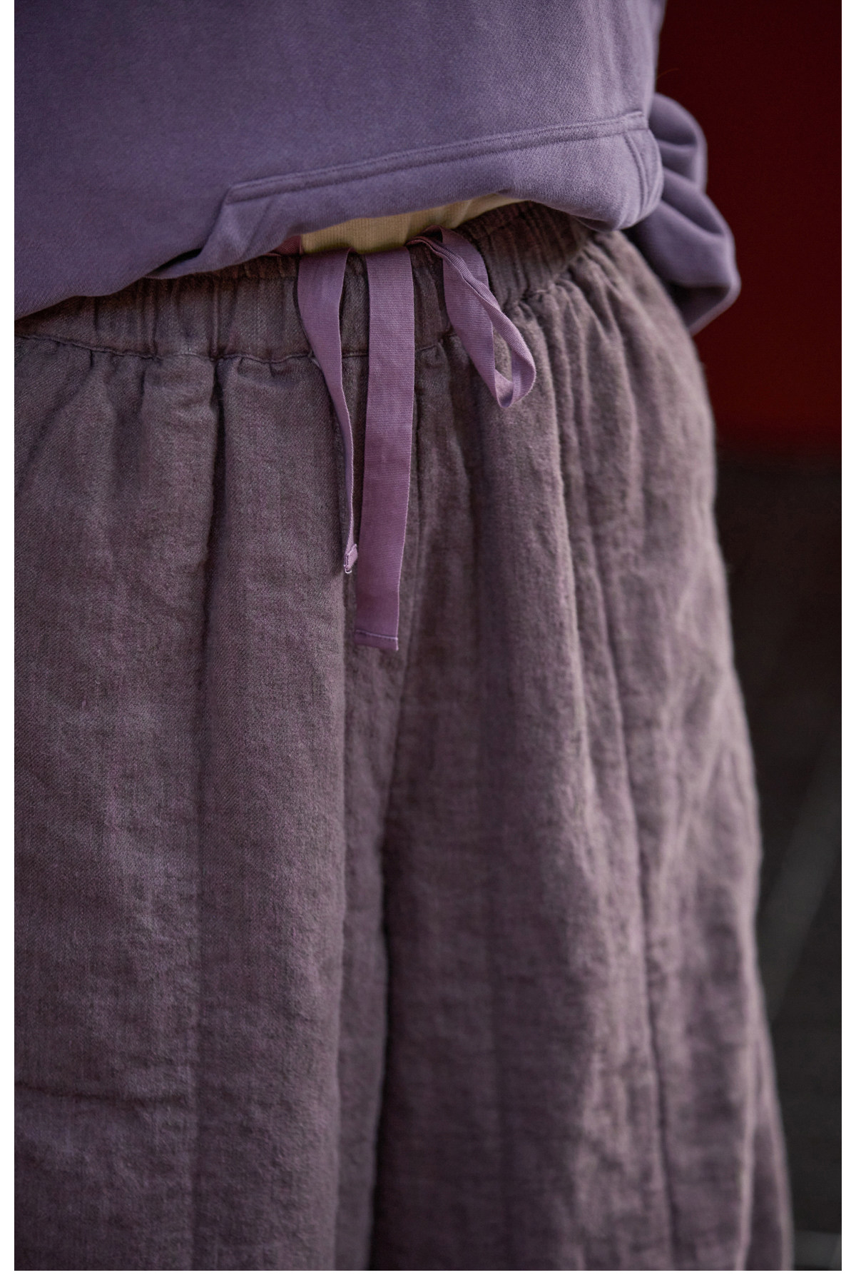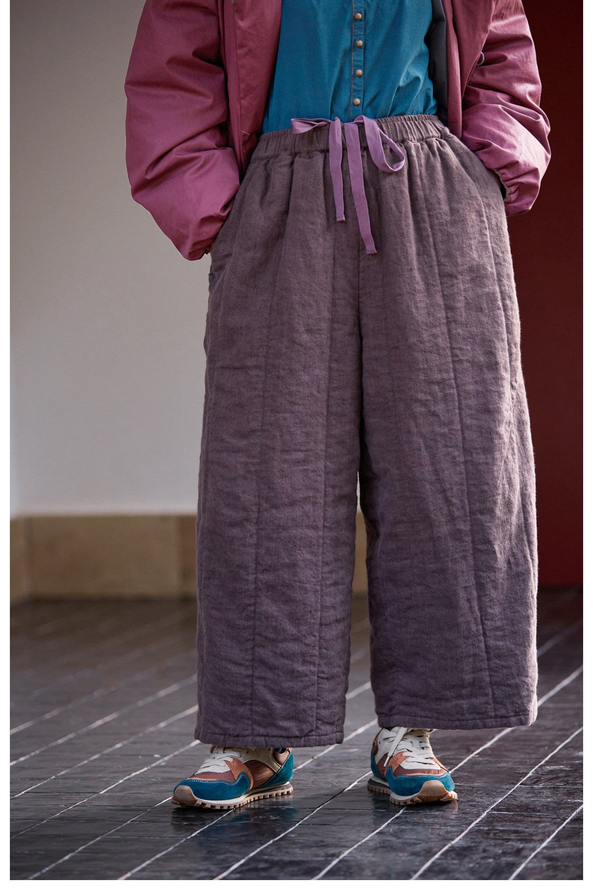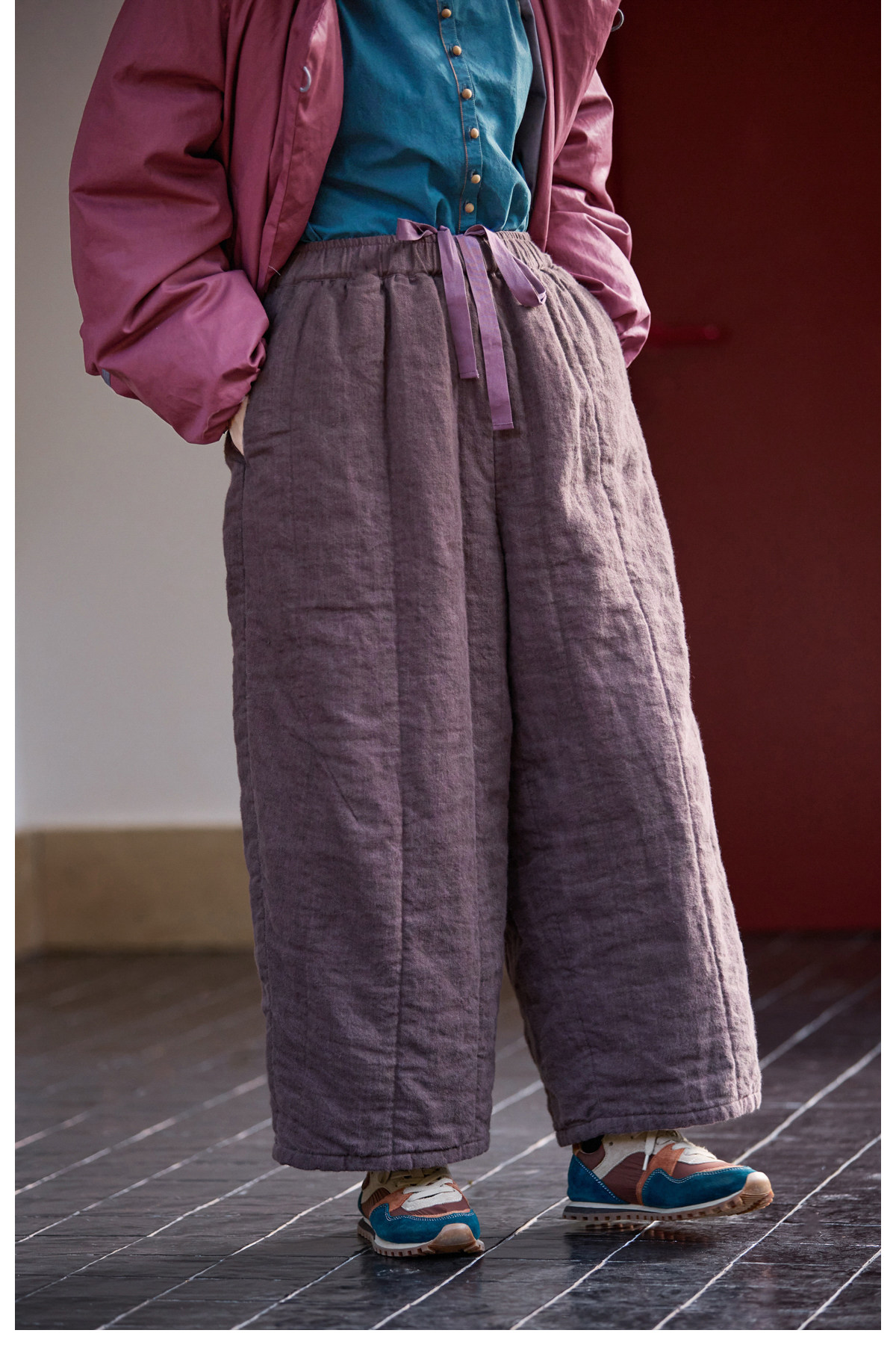 Original [Folk Art] Winter Edition Lilac Purple Linen Brushed High-Quality Warm Elastic Waist Cotton Pants 8583-1B