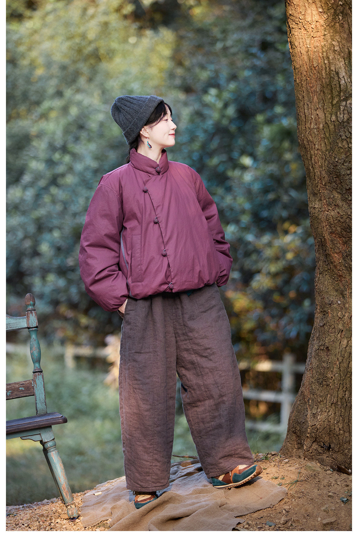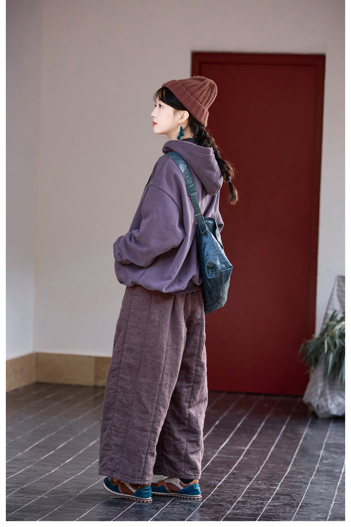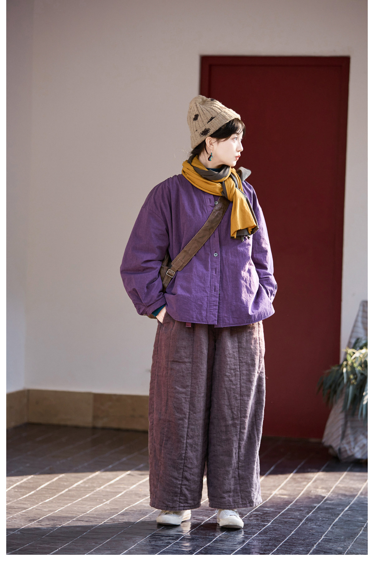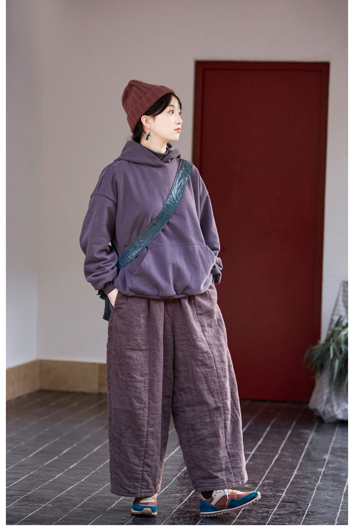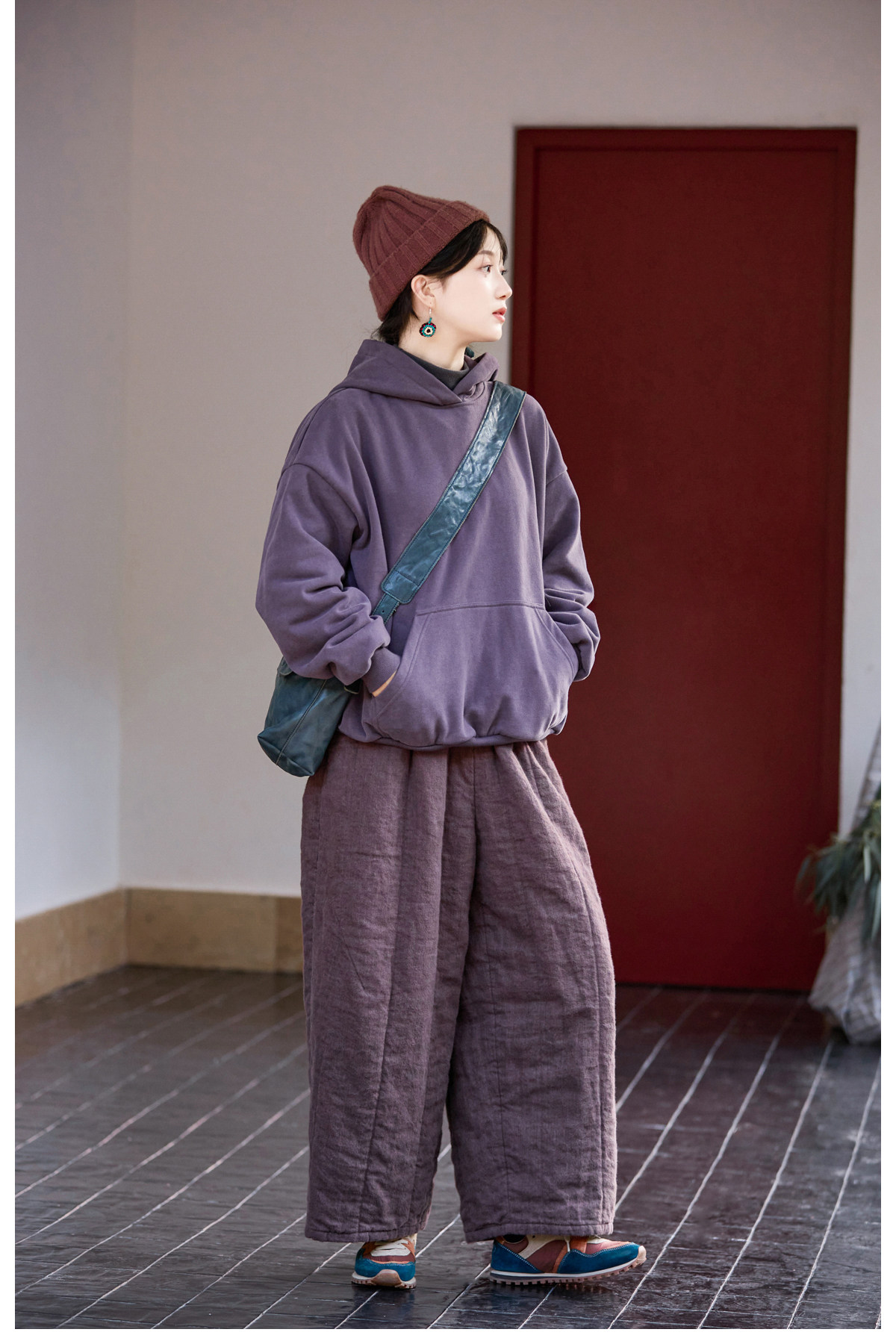 Original [Folk Art] Winter Edition Lilac Purple Linen Brushed High-Quality Warm Elastic Waist Cotton Pants 8583-1B