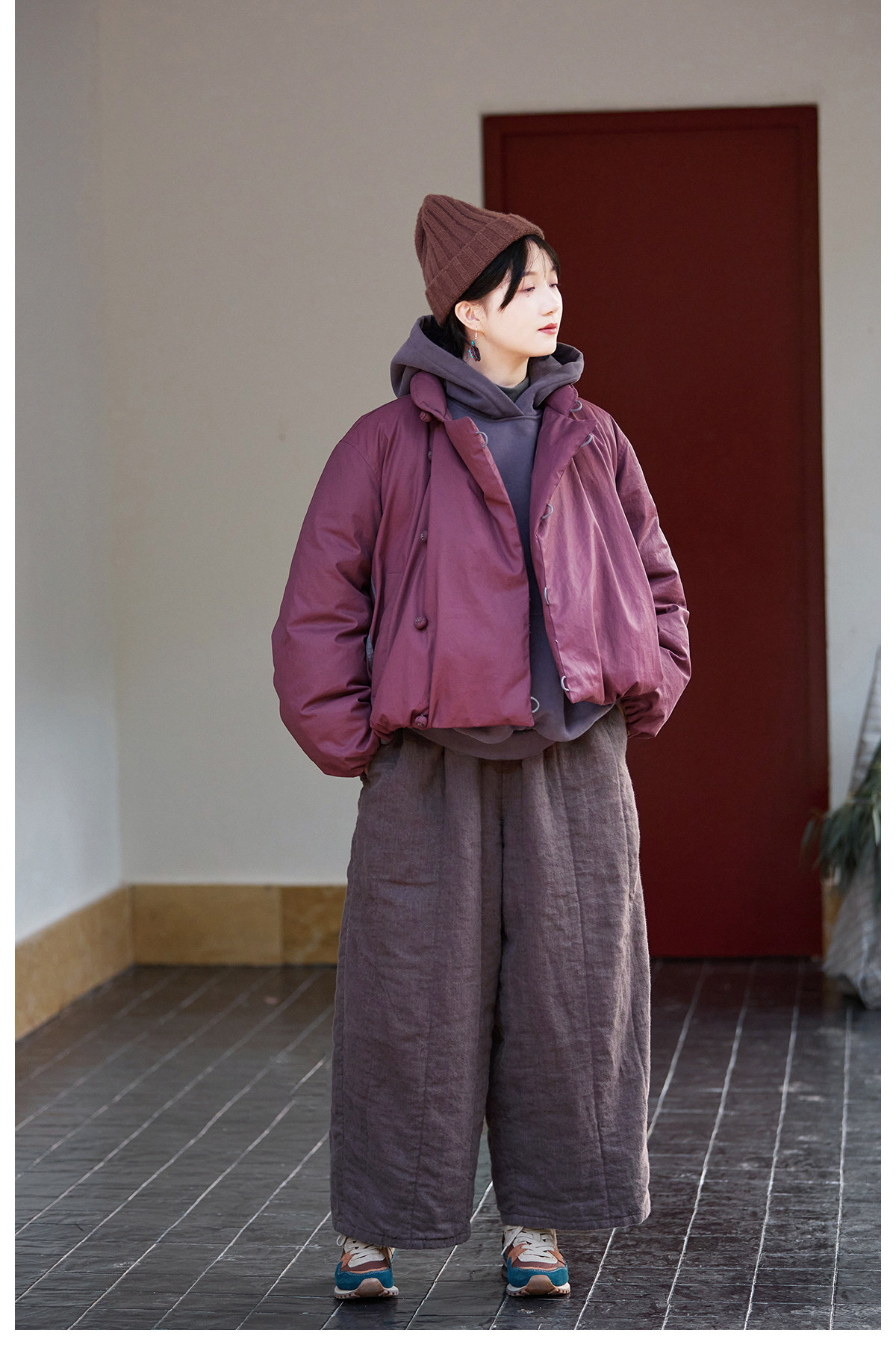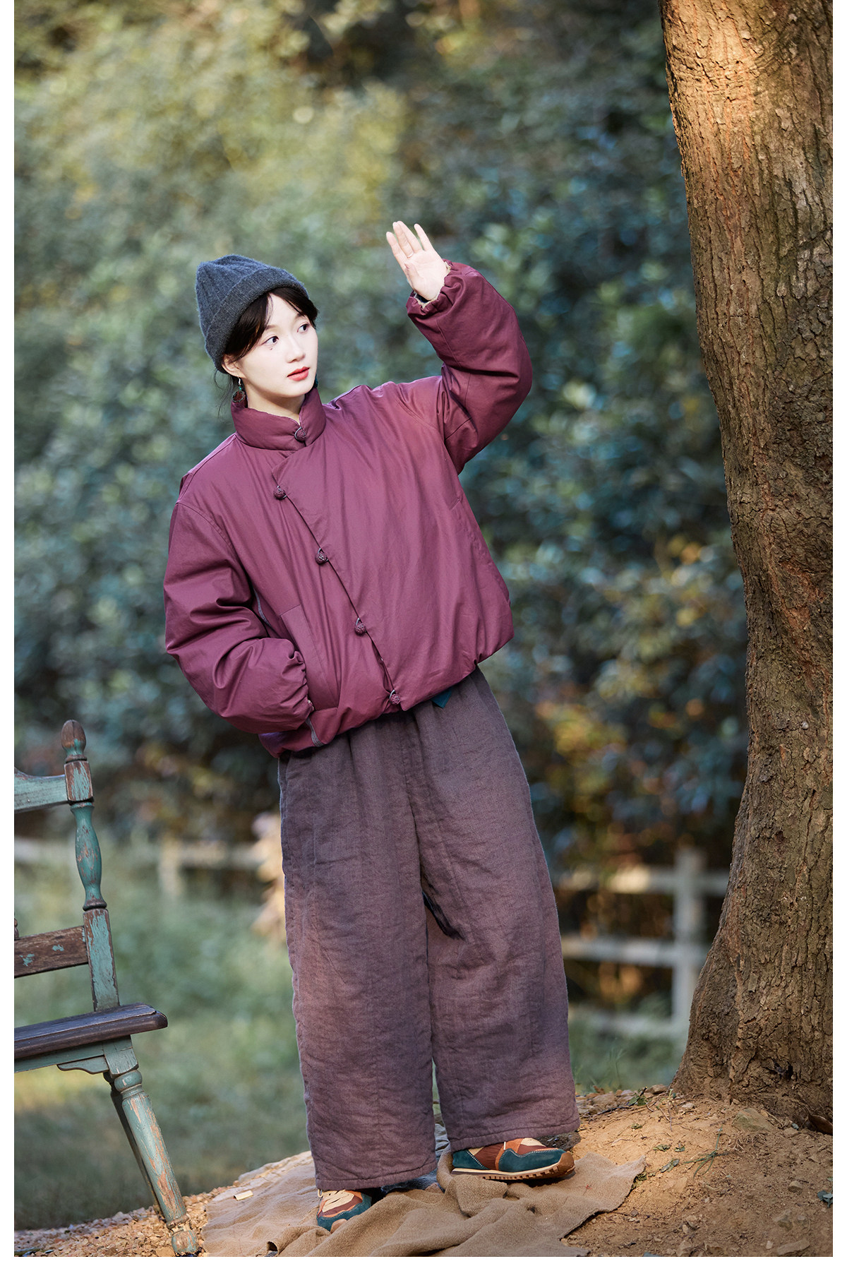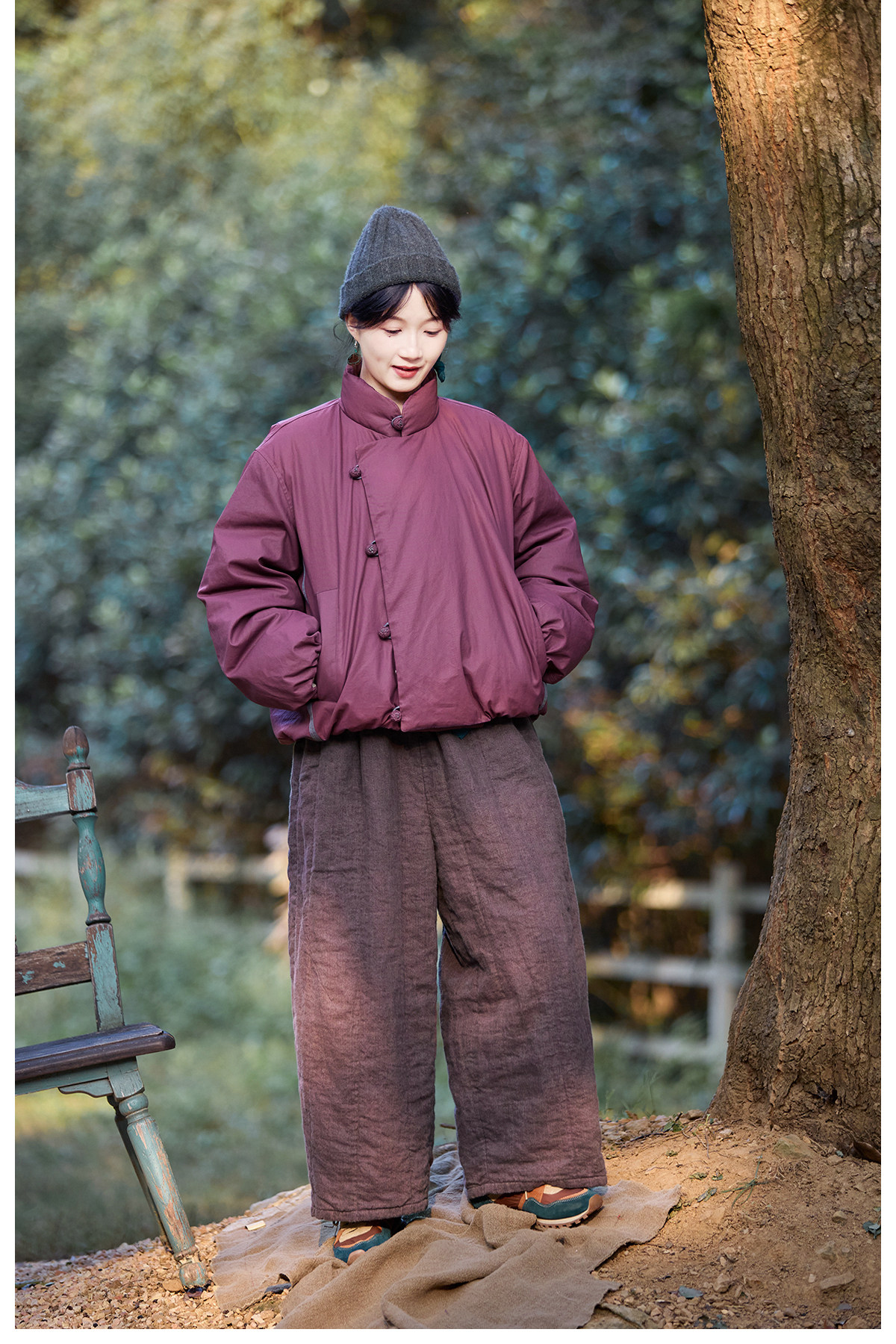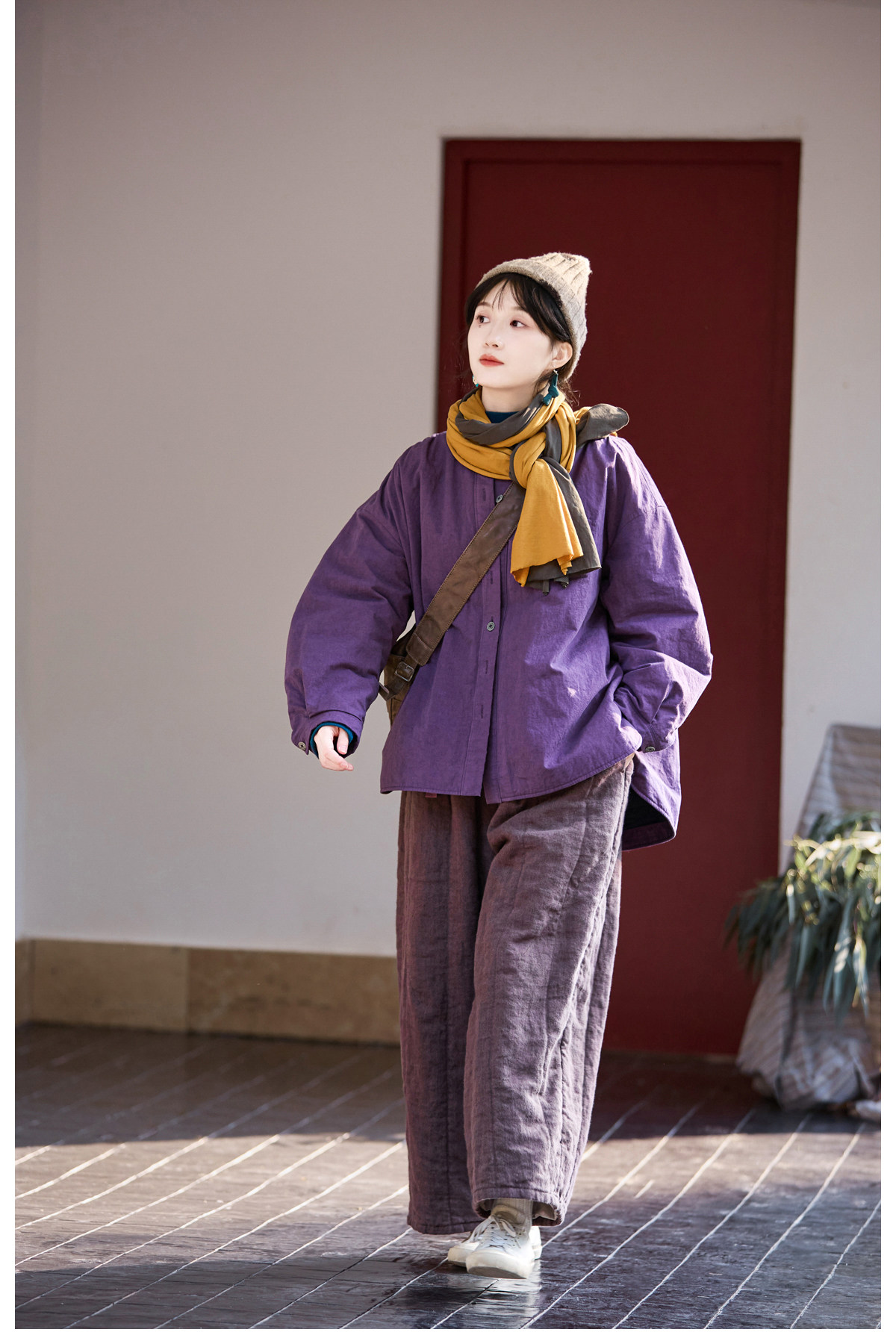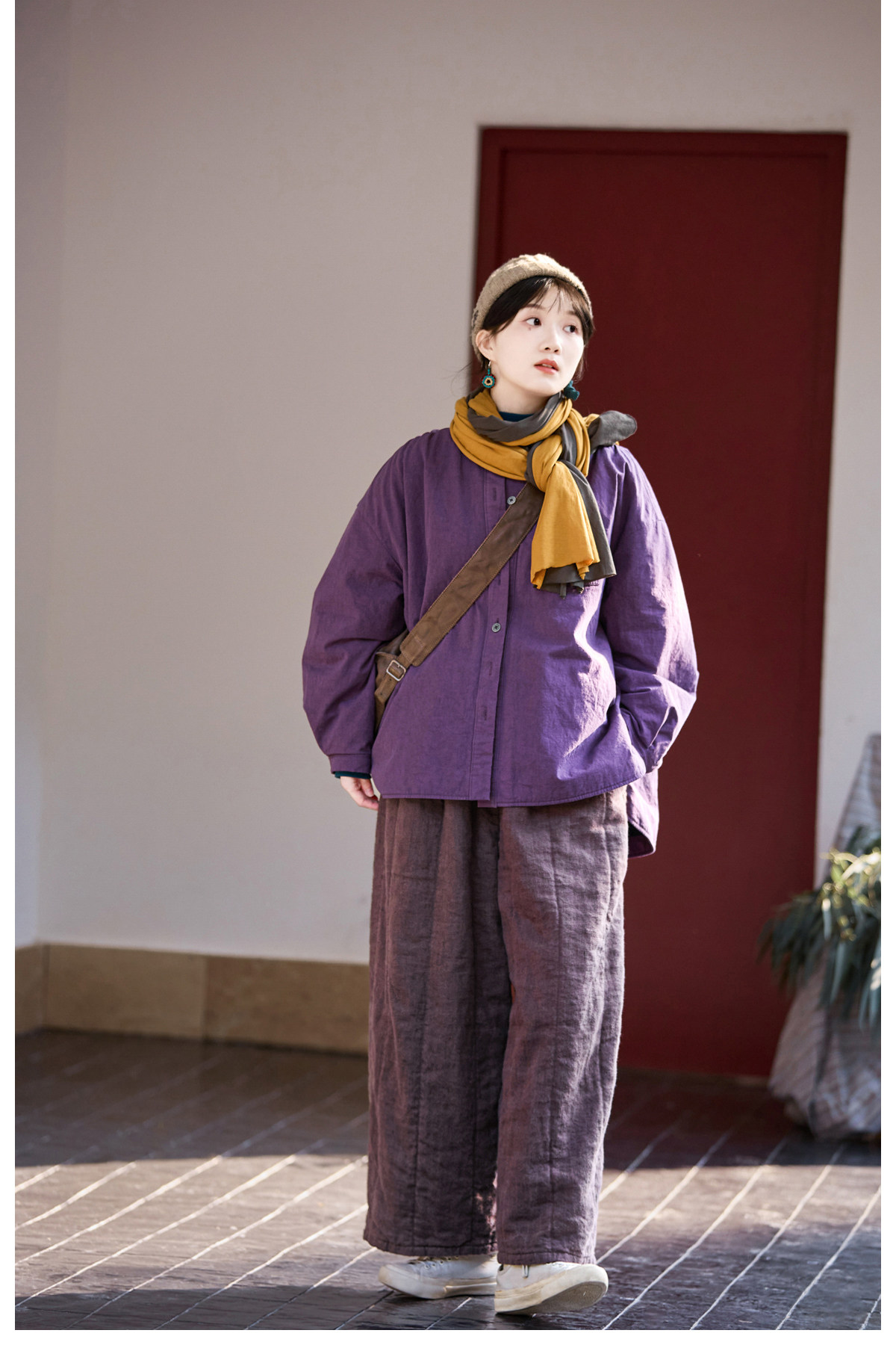 Original [Folk Art] Winter Edition Lilac Purple Linen Brushed High-Quality Warm Elastic Waist Cotton Pants 8583-1B