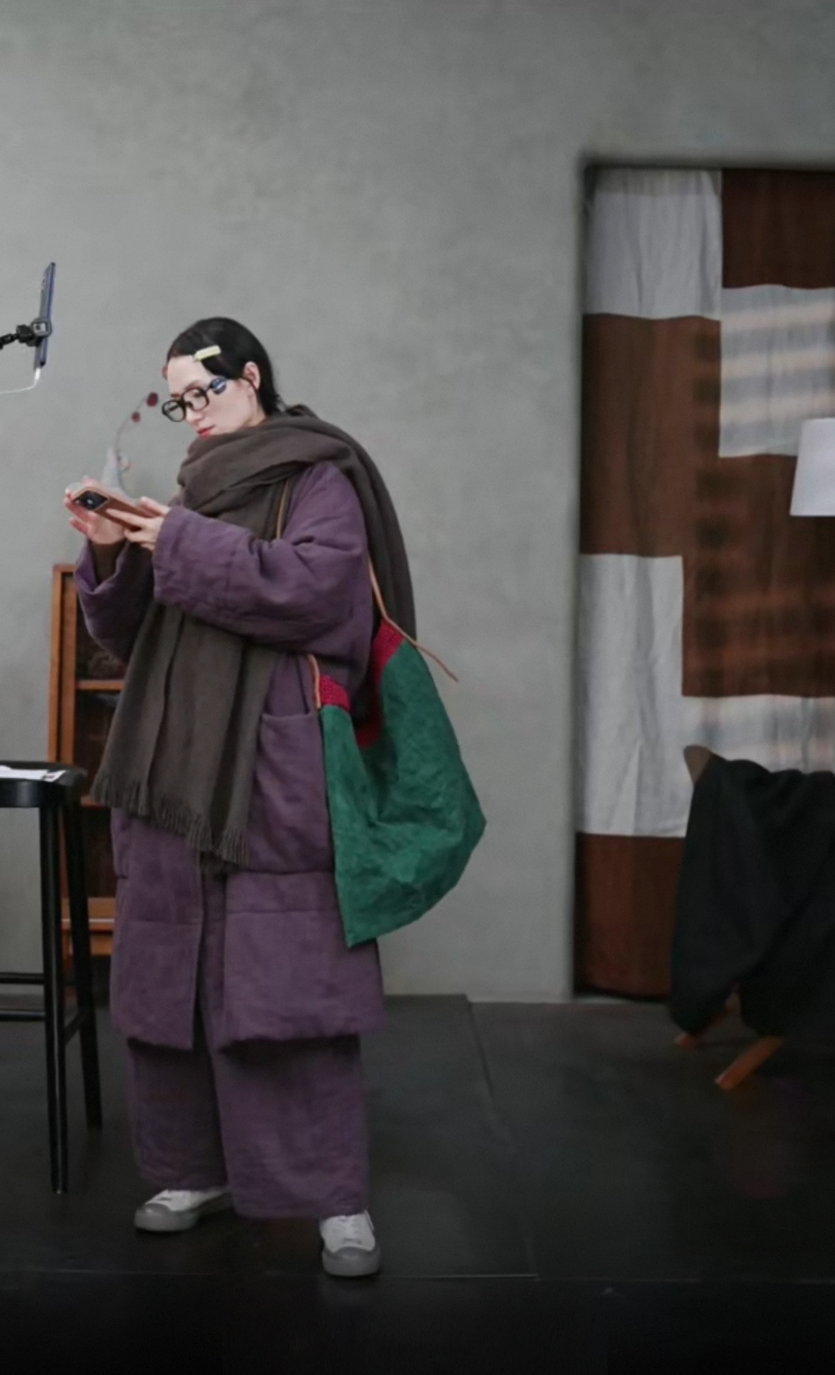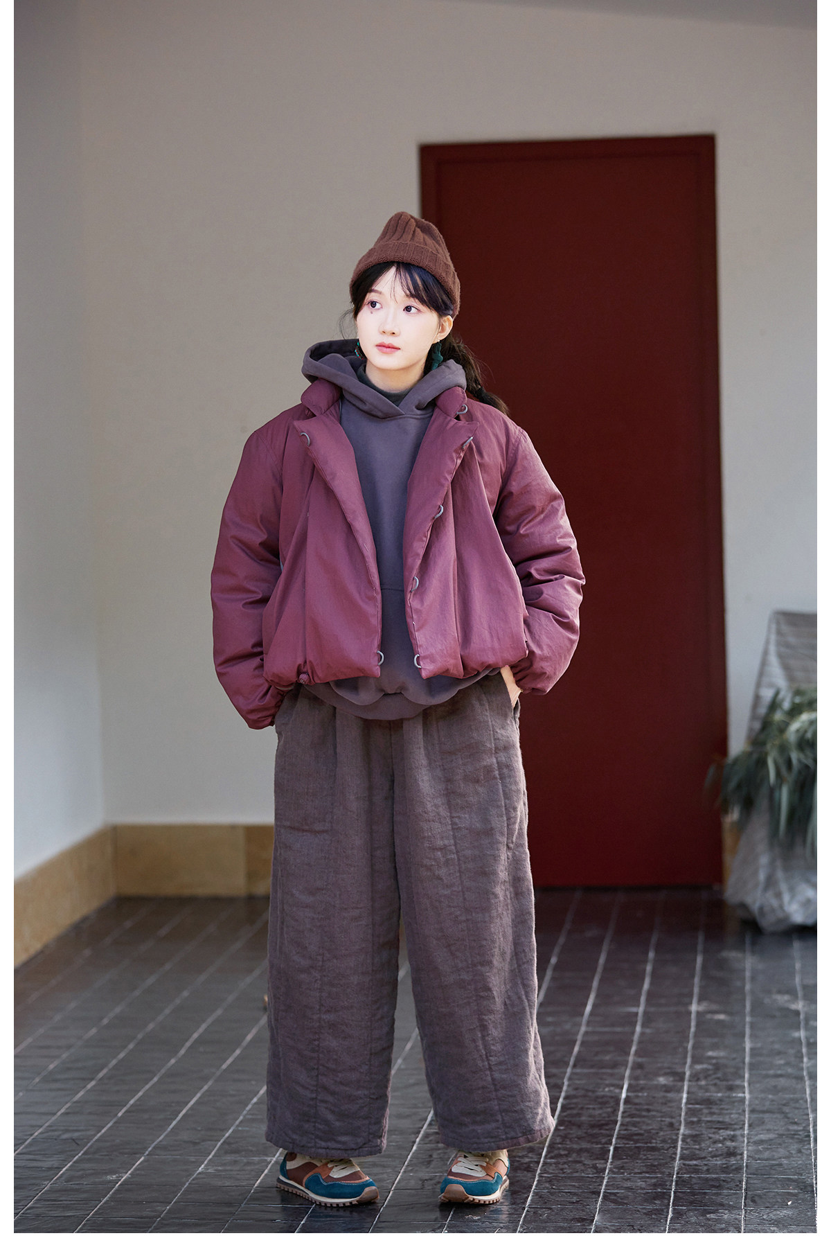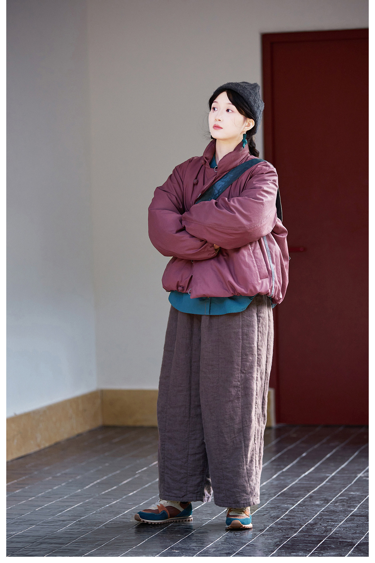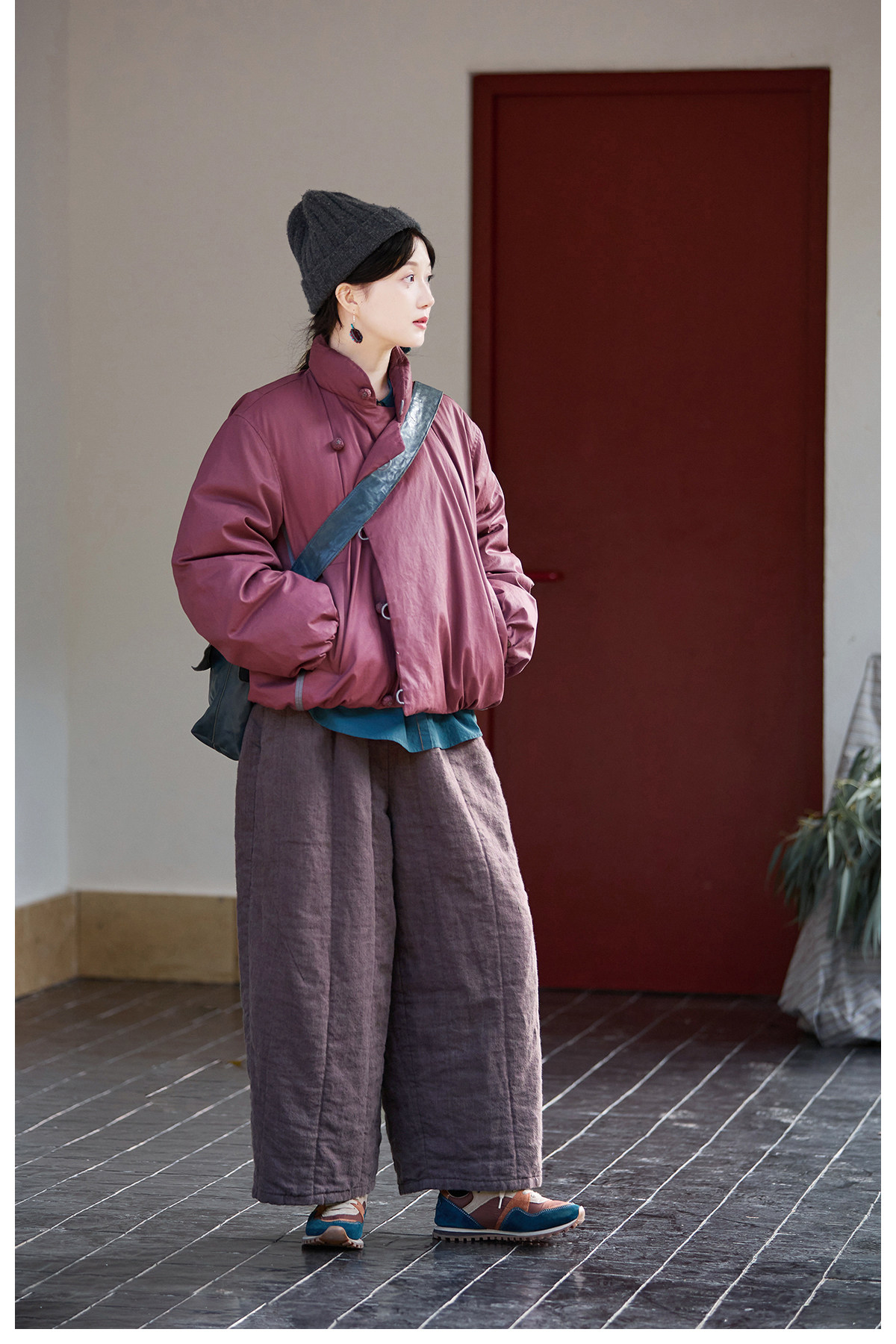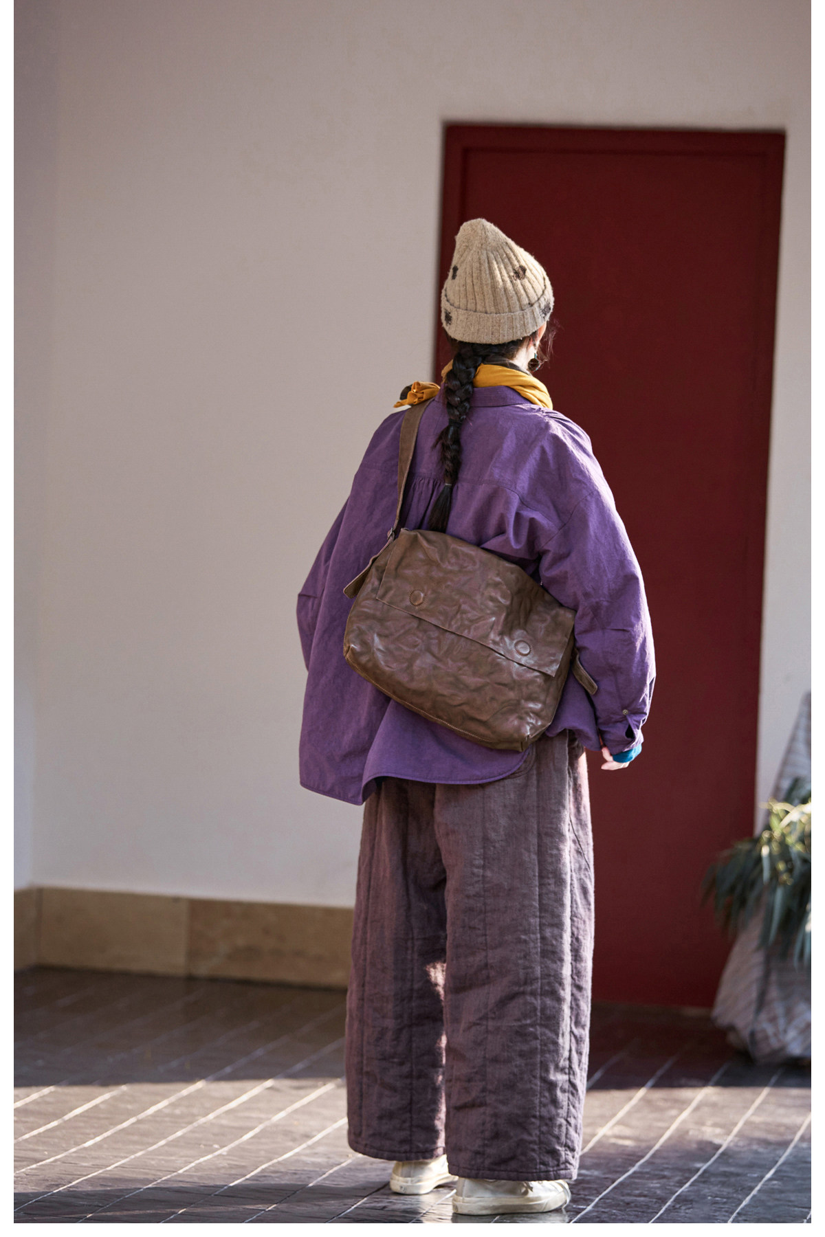 Original [Folk Art] Winter Edition Lilac Purple Linen Brushed High-Quality Warm Elastic Waist Cotton Pants 8583-1B