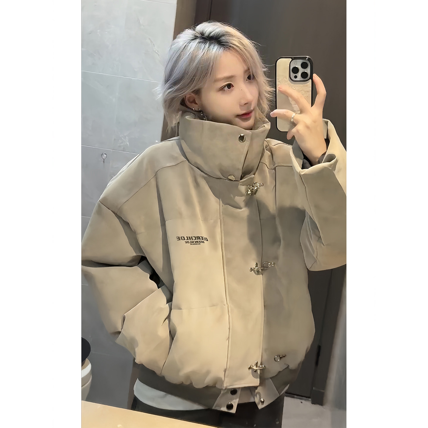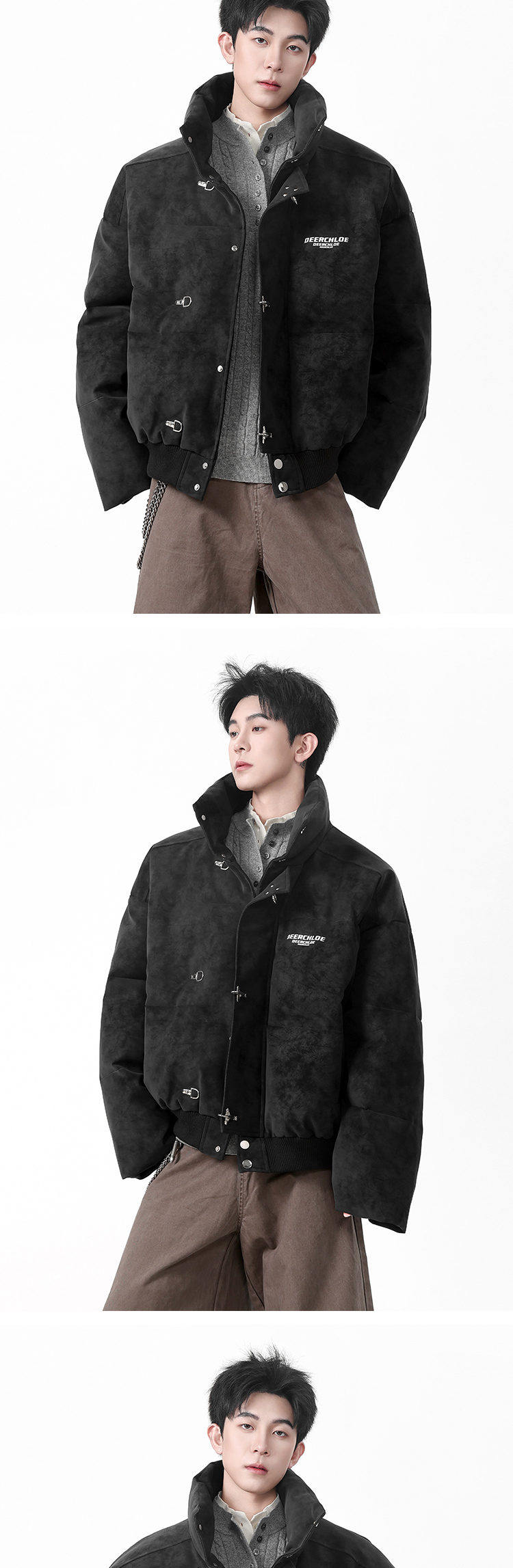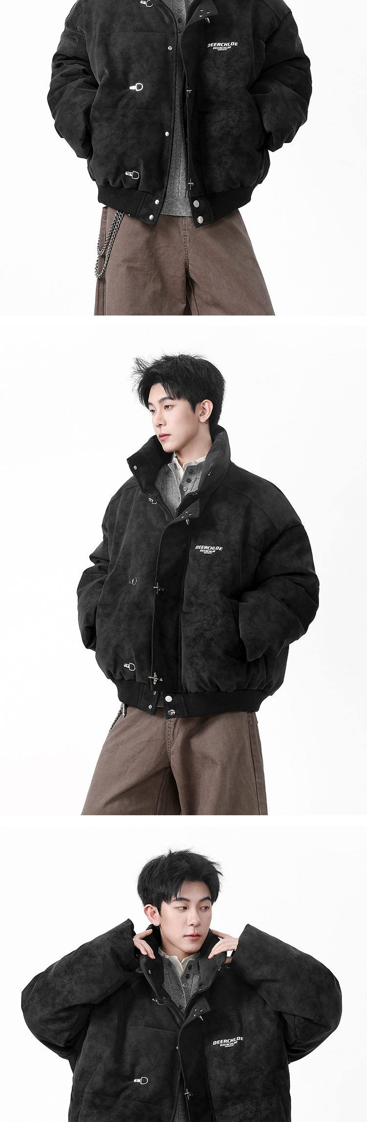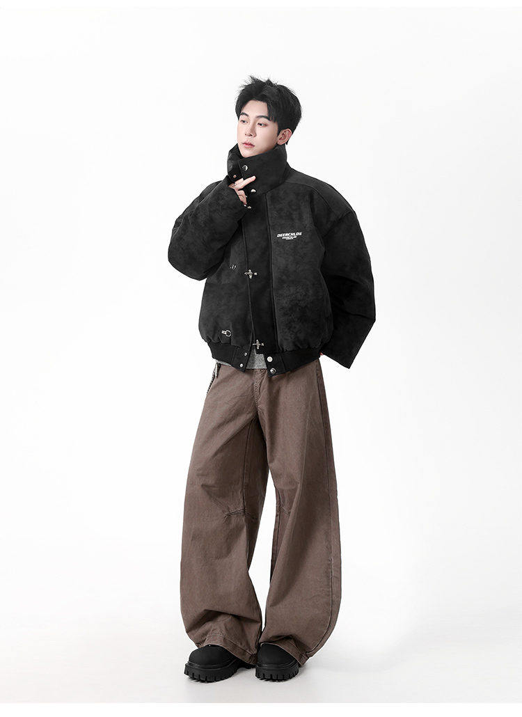 American High Street Style Pu Leather Tie-Dye Cotton Jacket for Men, Winter Trendy Brand, Thickened, Warm, Short, Stand Collar down Cotton Coat