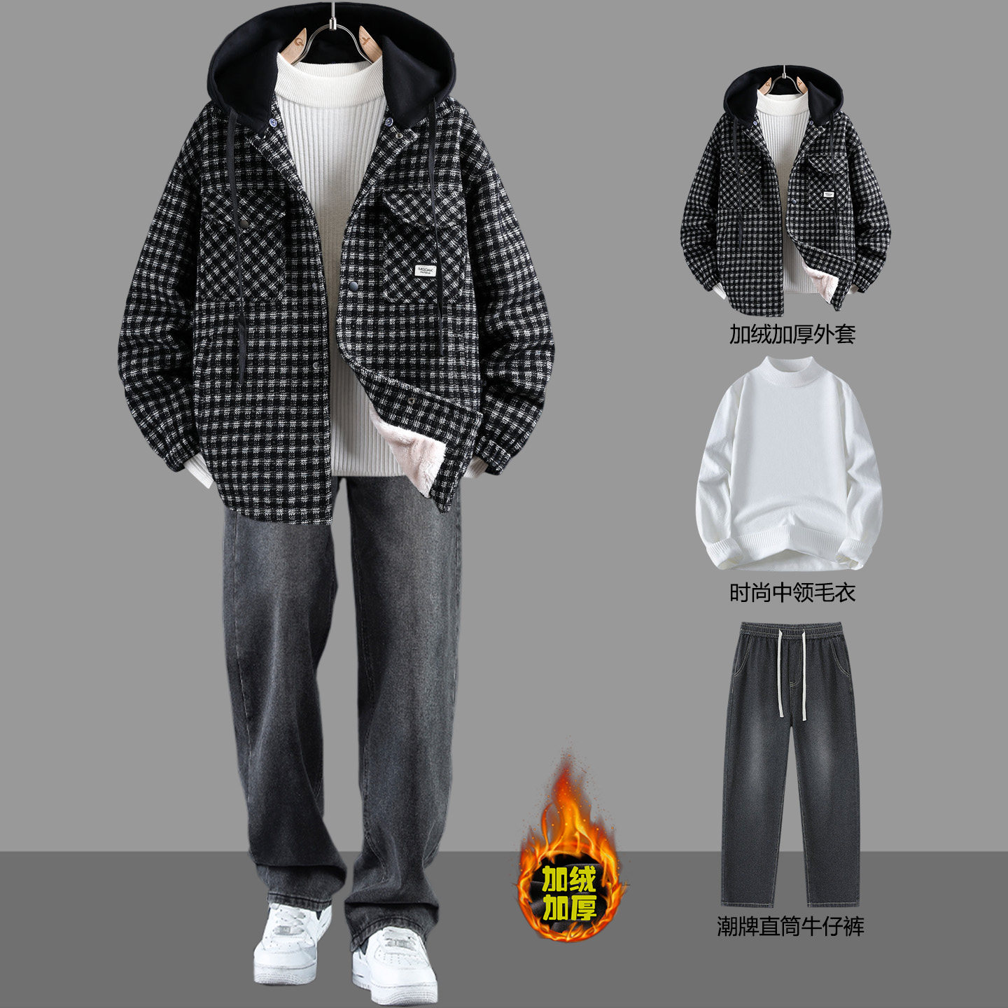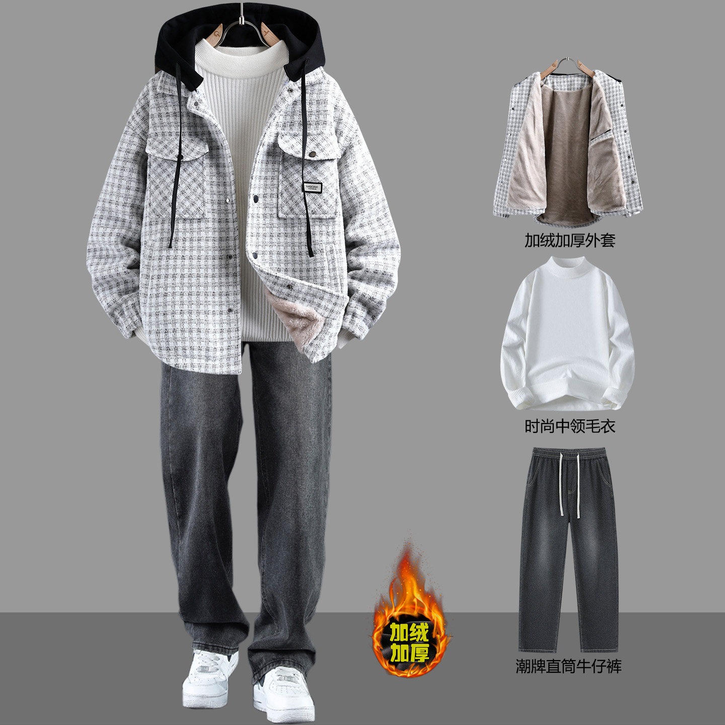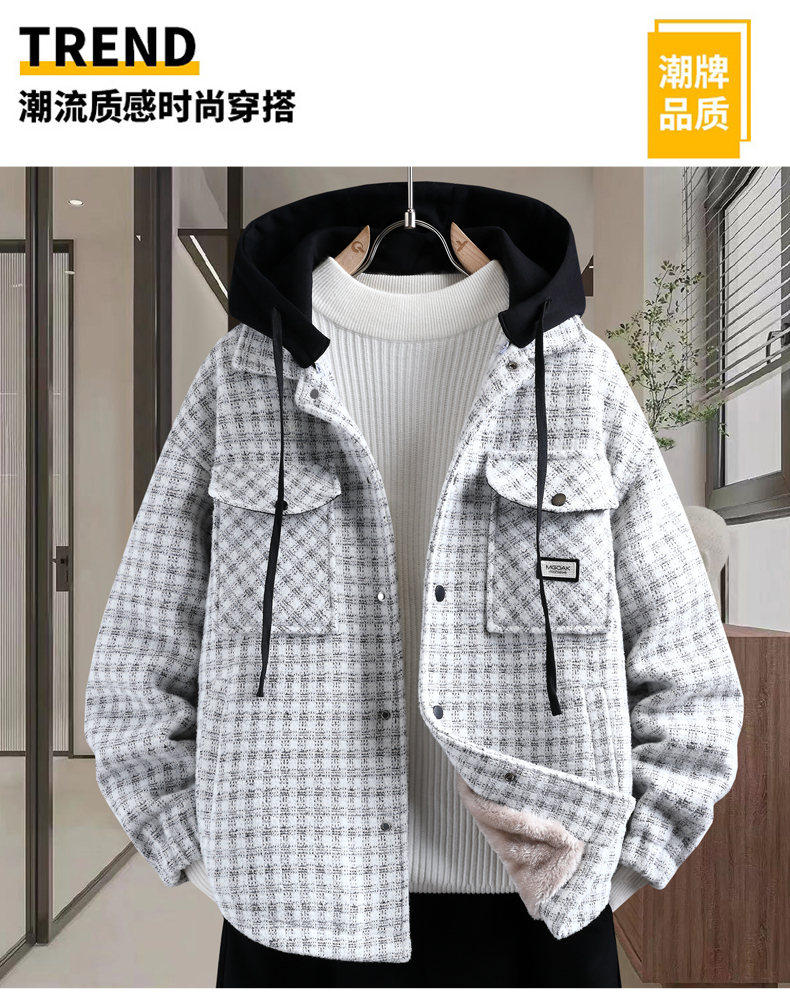 Fleece-Lined Thick Cotton Suit for Men, Winter Trendy Brand, Cool and Casual, Fake Two-Piece Jacket, Complete Outfit for Teenagers