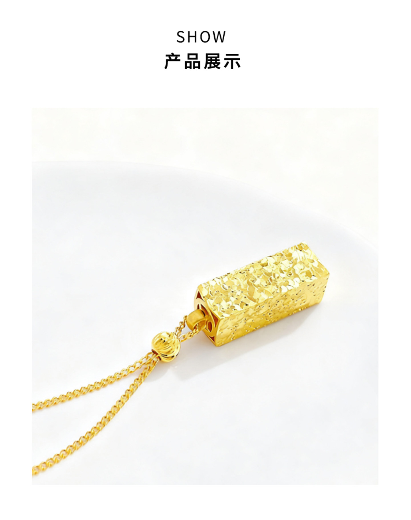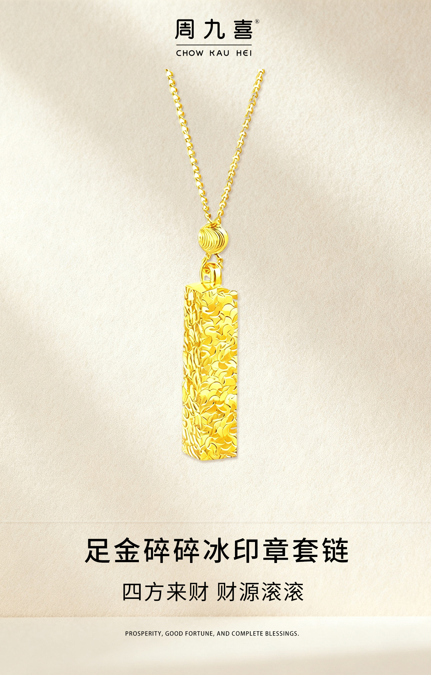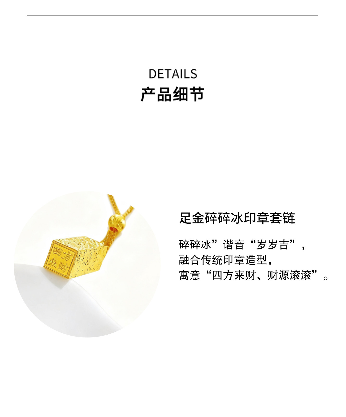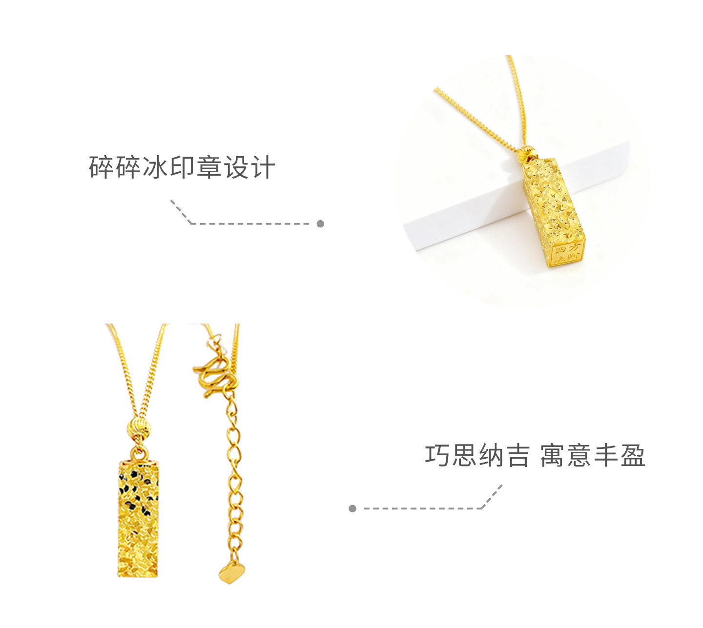 Zhou Juxi 999 Pure Gold Crushed Ice Seal Chain Set, Square Shape, Brings Wealth, Gold Pendant, Holiday Gift for Girlfriend