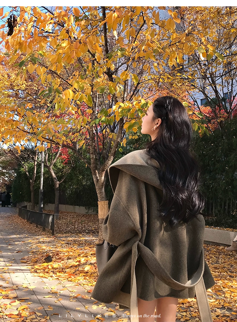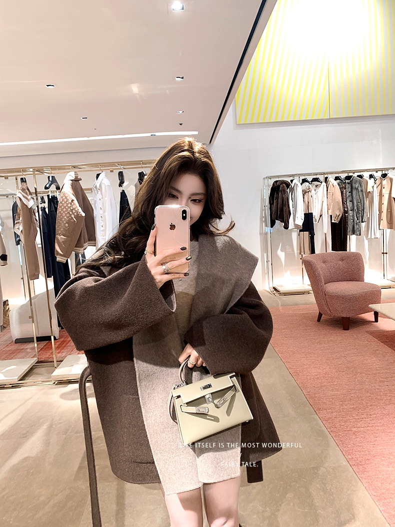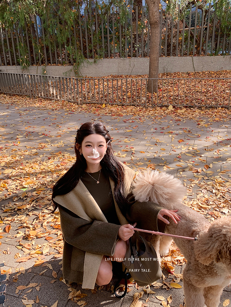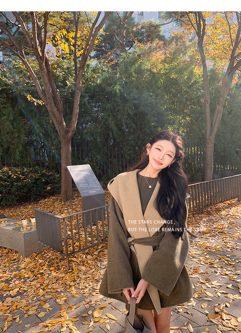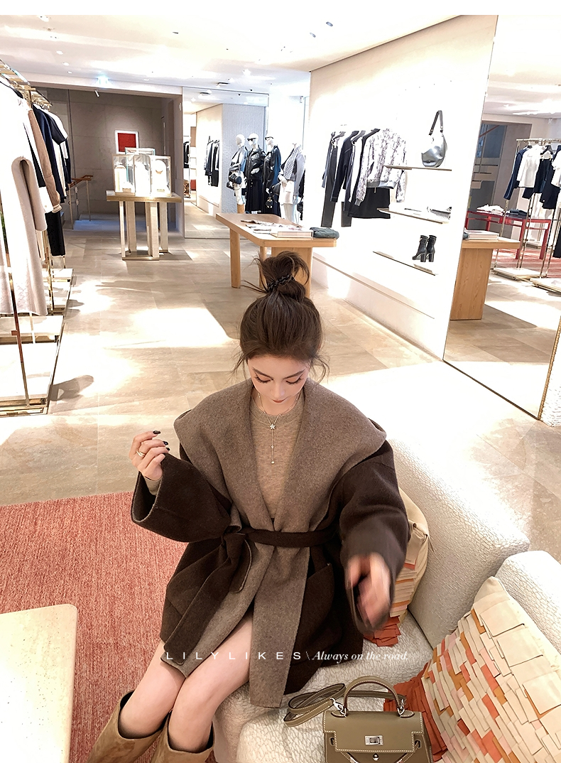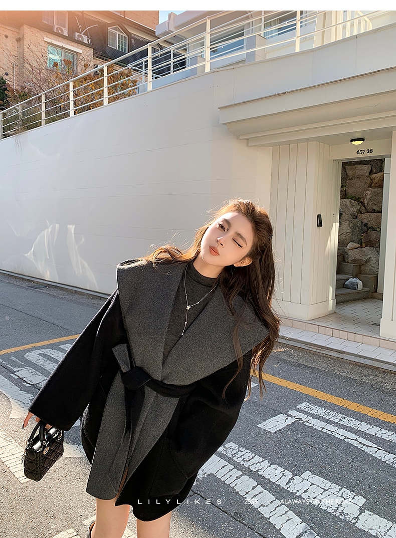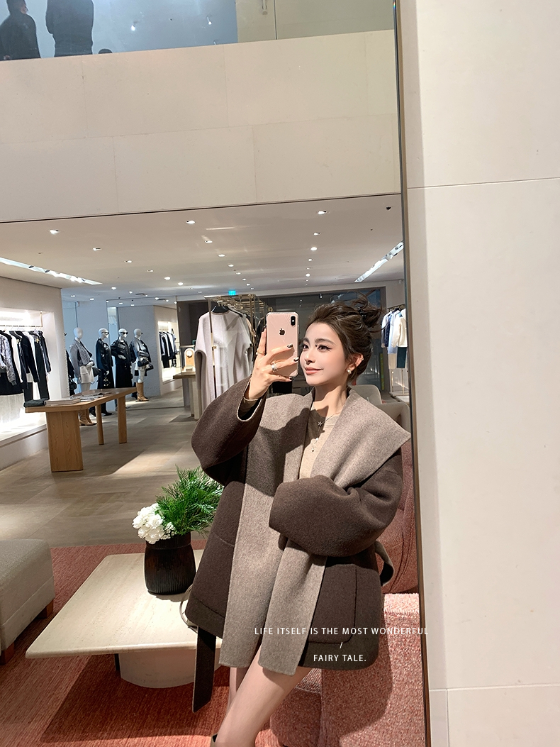 L*V Noble Lady's Bathrobe Coat Cashmere Silk Wool/Wool Cashmere Reversible Color-Blocked Hooded Bathrobe Coat