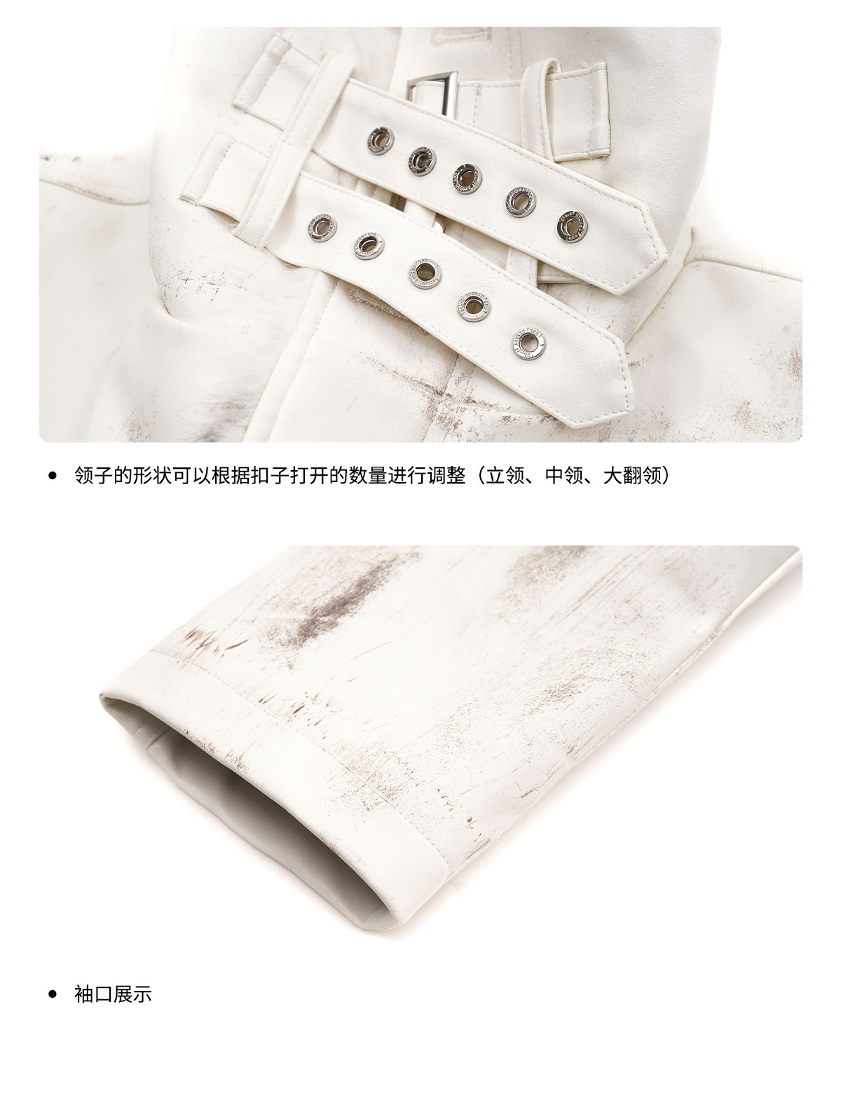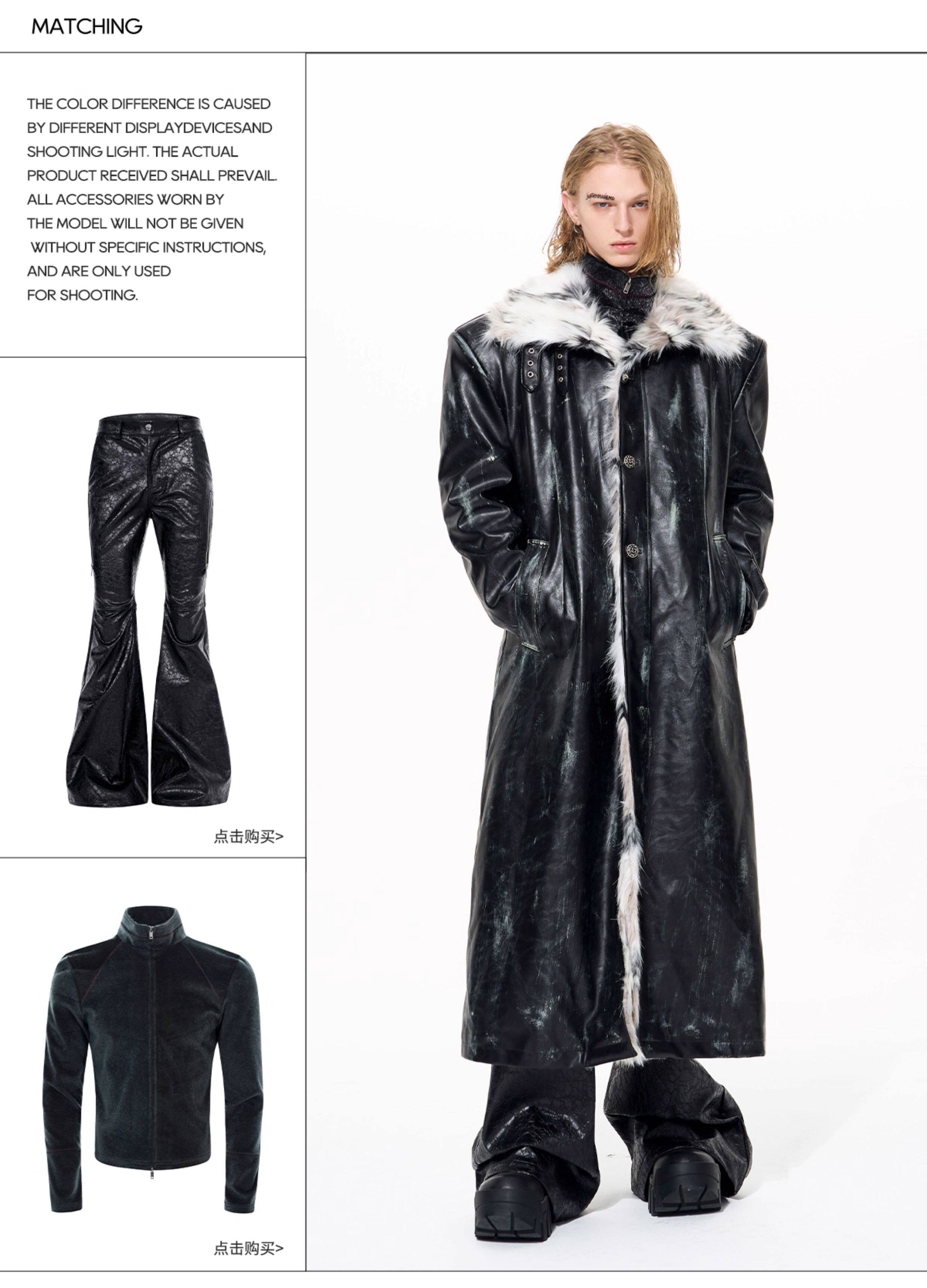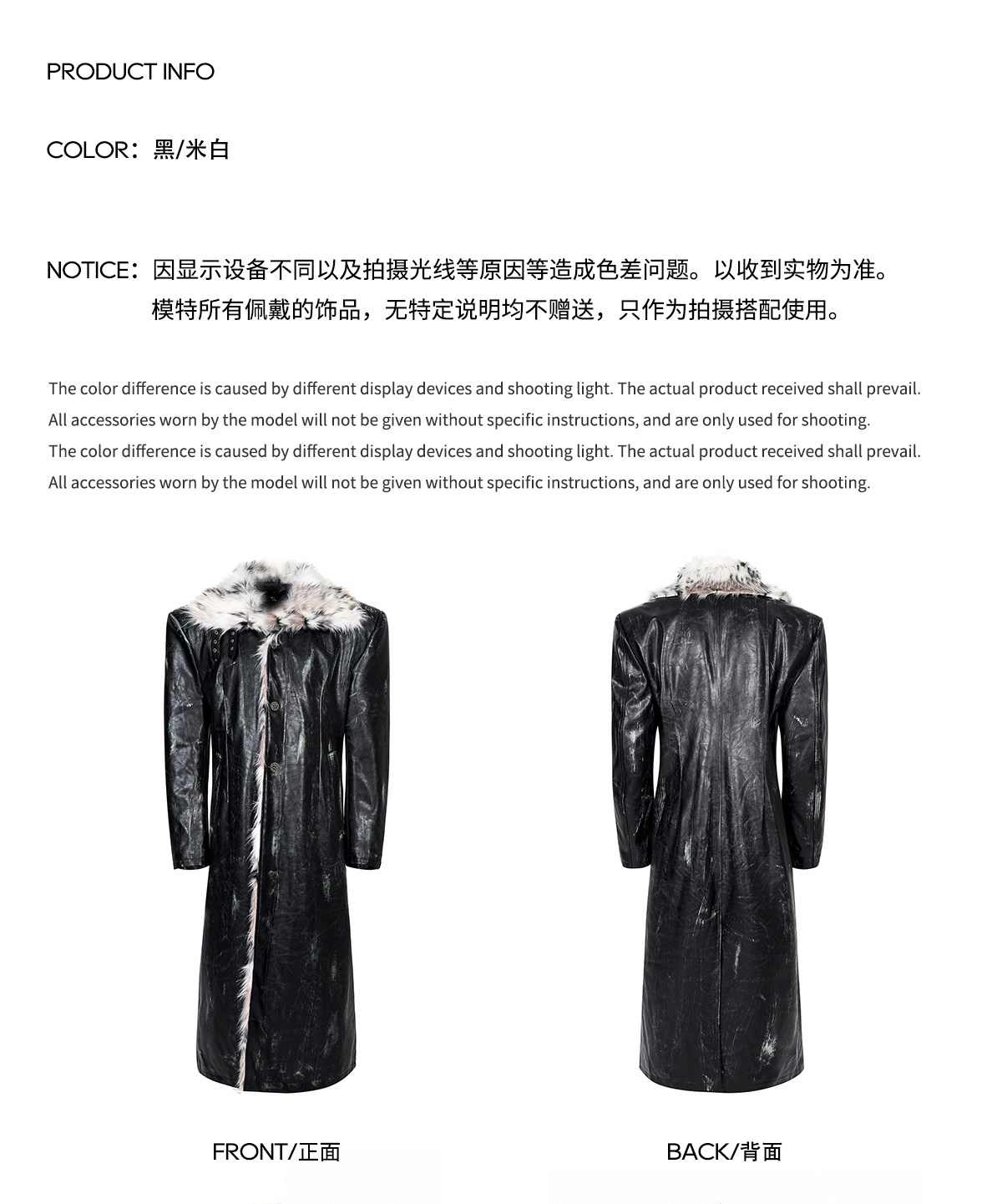 See Hand-Painted Distressed Long Leather Coat for Men, Winter Stand Collar Buttoned Fur Patchwork Men's Quilted Trench Coat