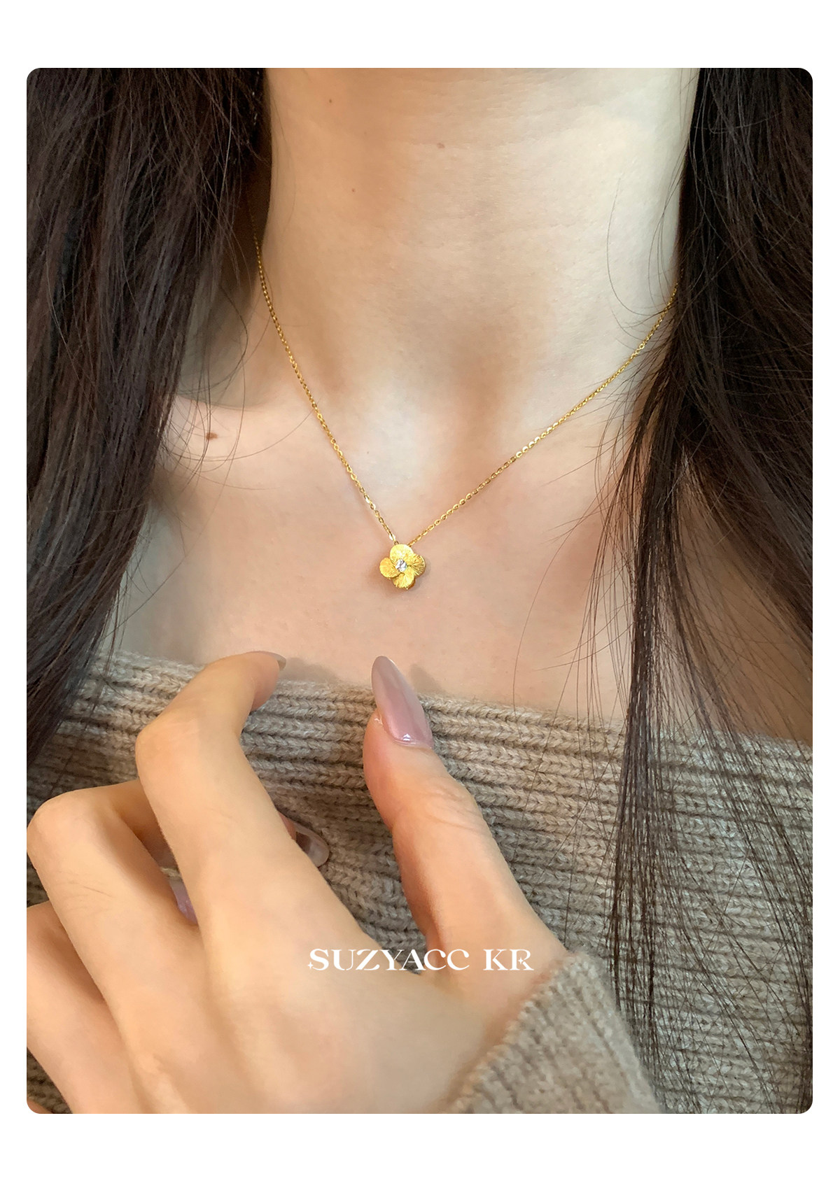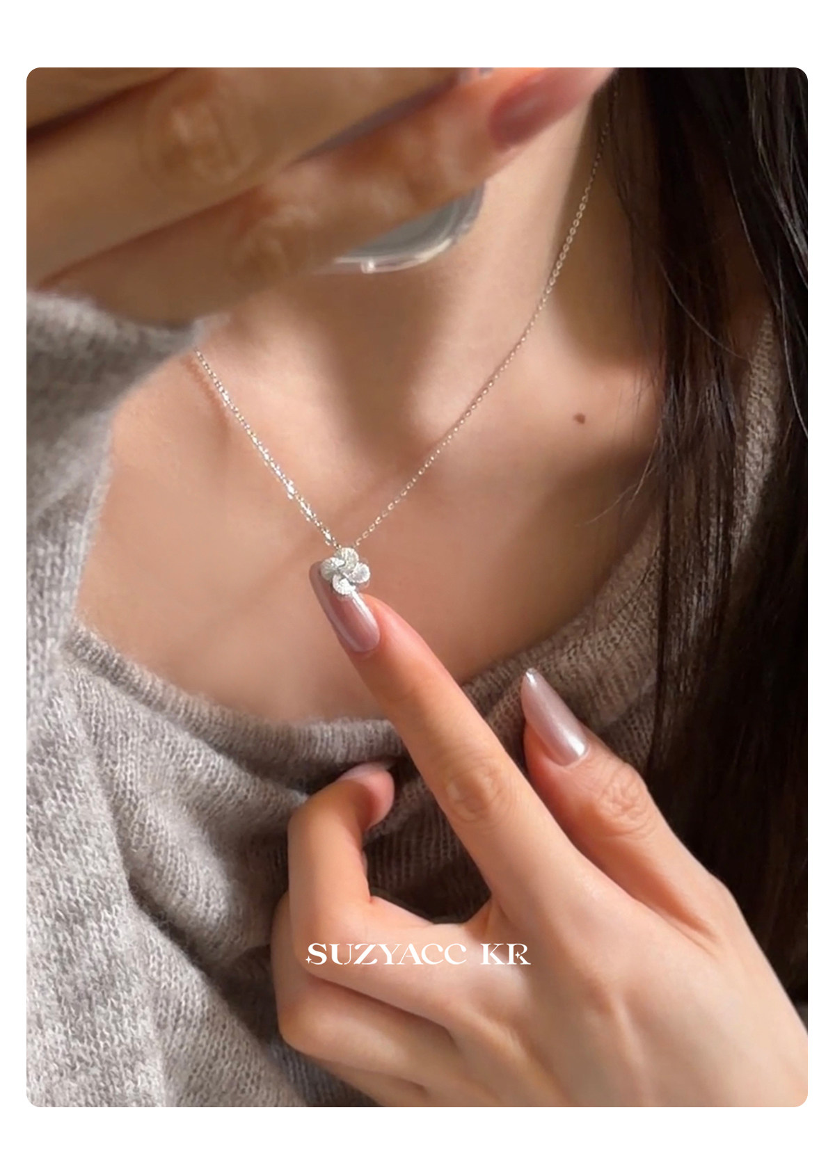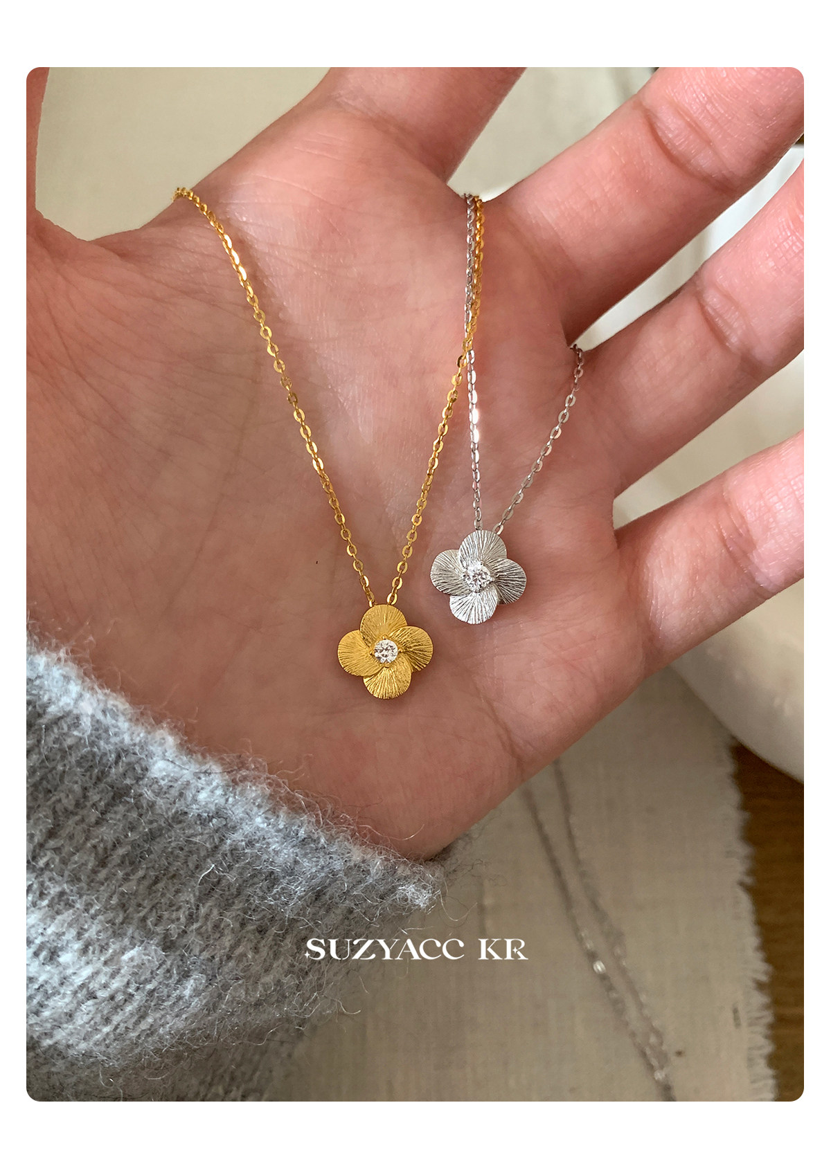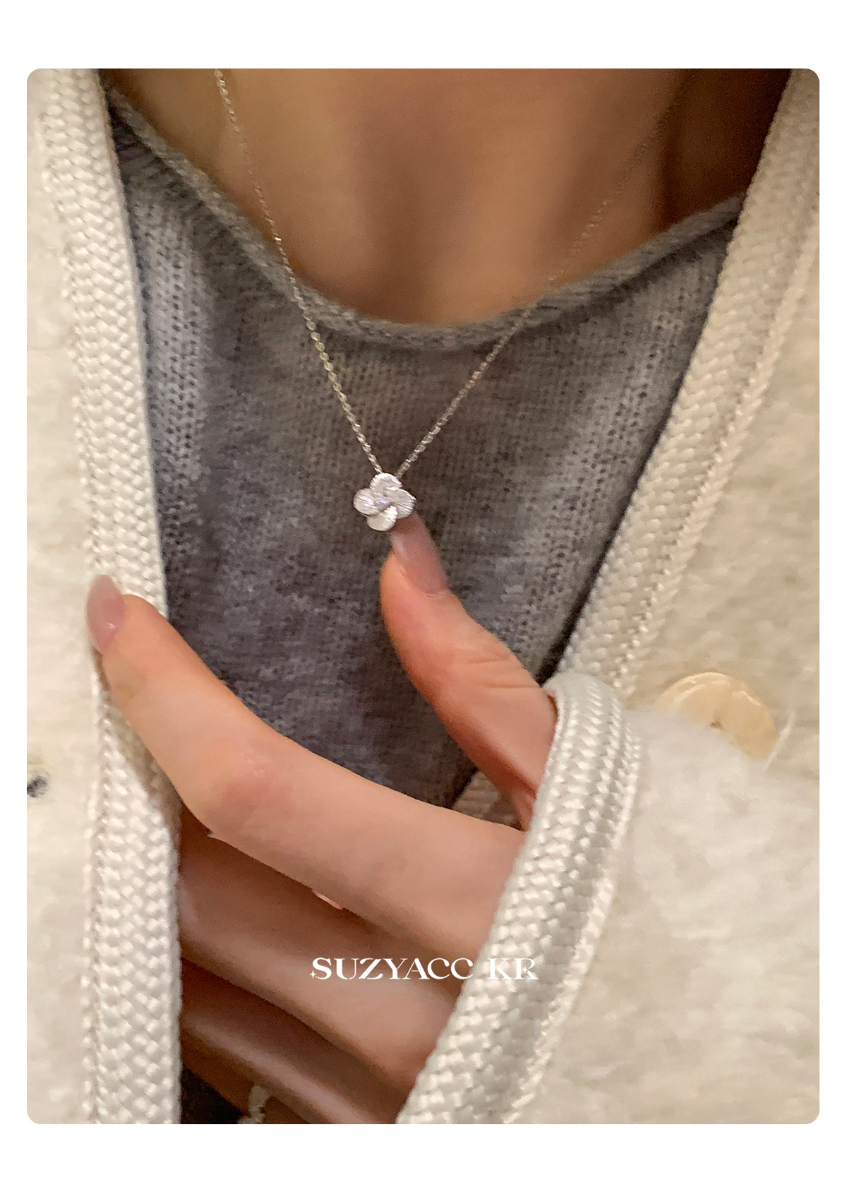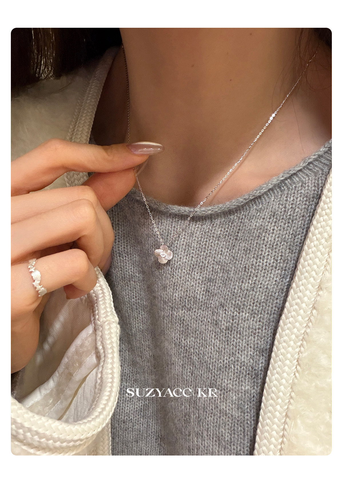 Suzyacc Kr Exquisite Pure Silver Brushed Four-Leaf Clover Necklace, Simple and Niche Design, Stackable Clavicle Chain Necklace