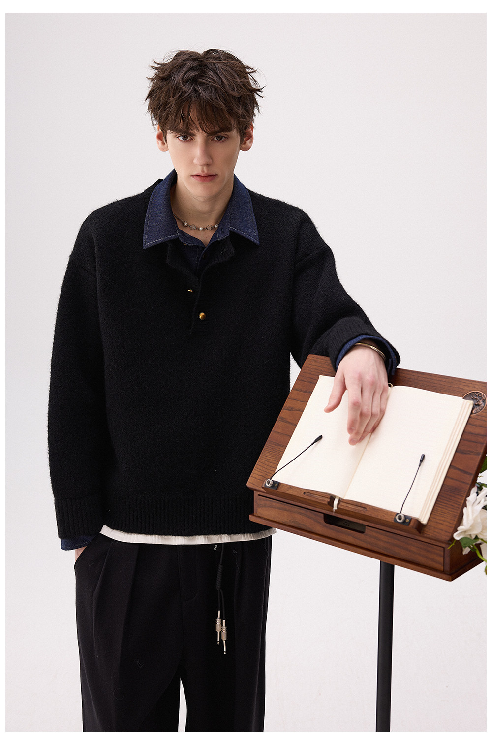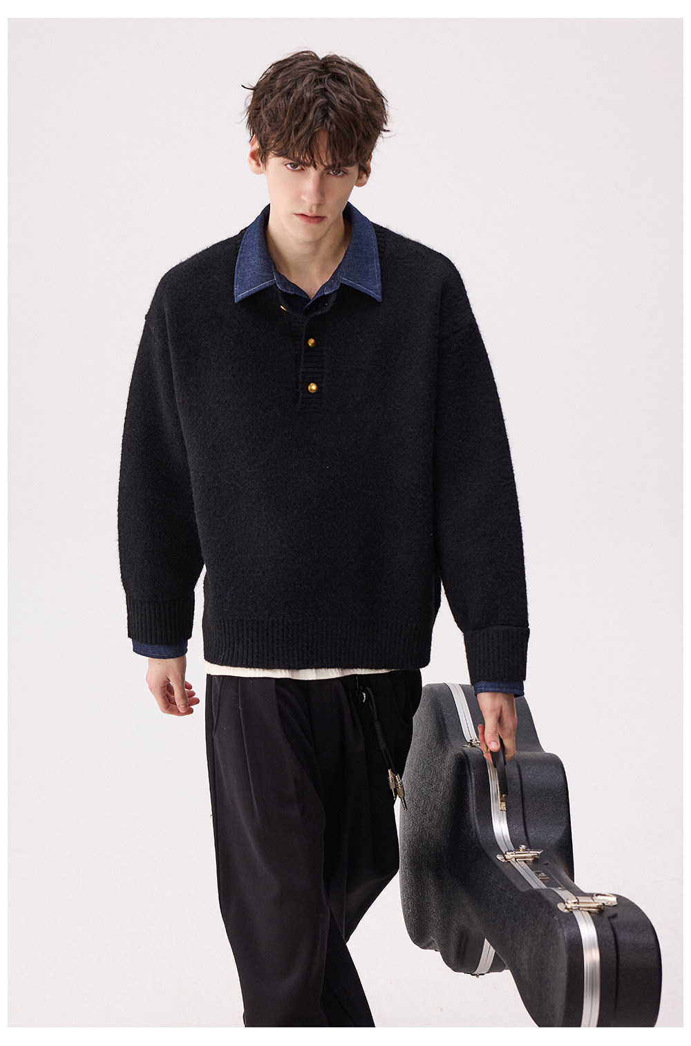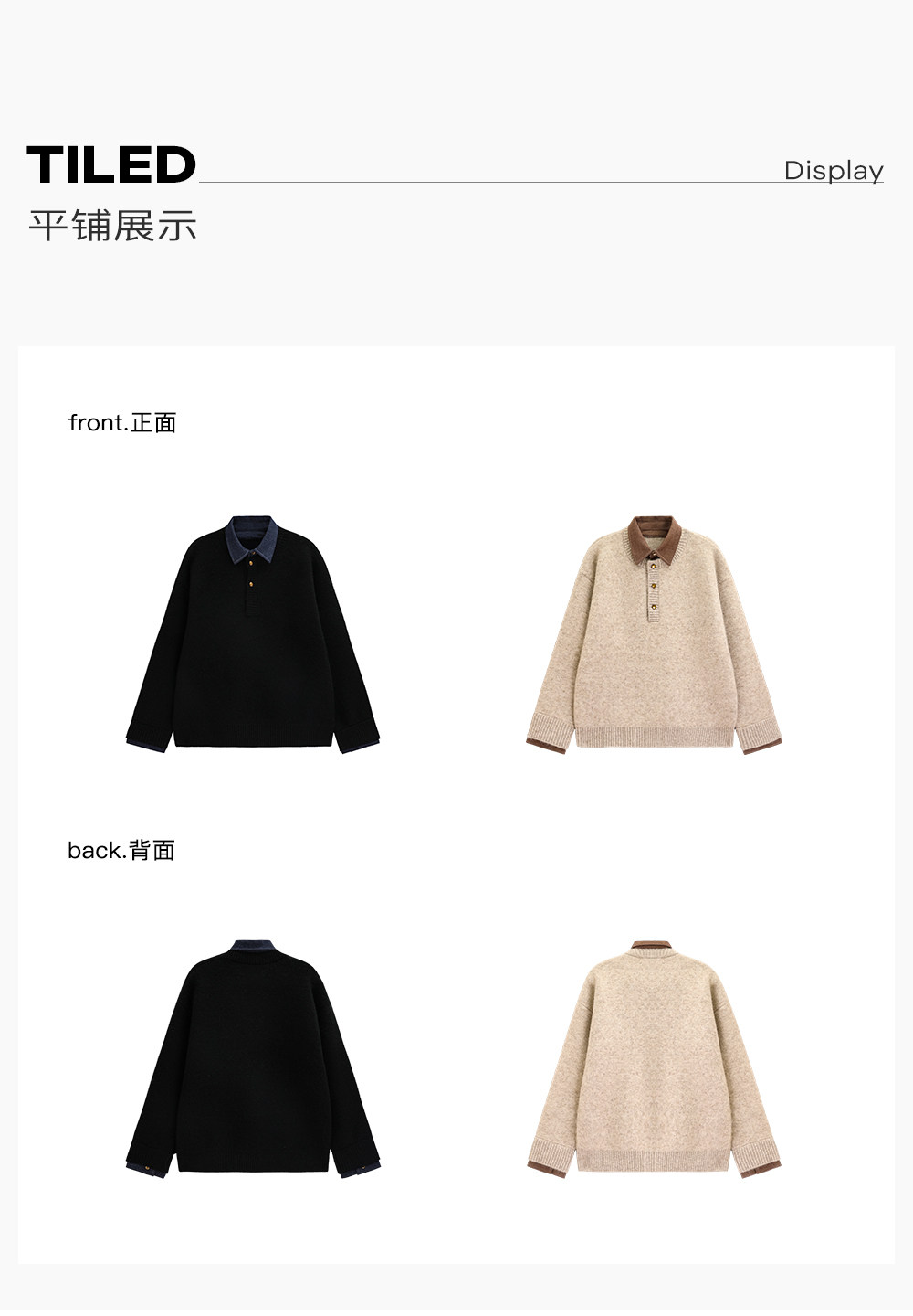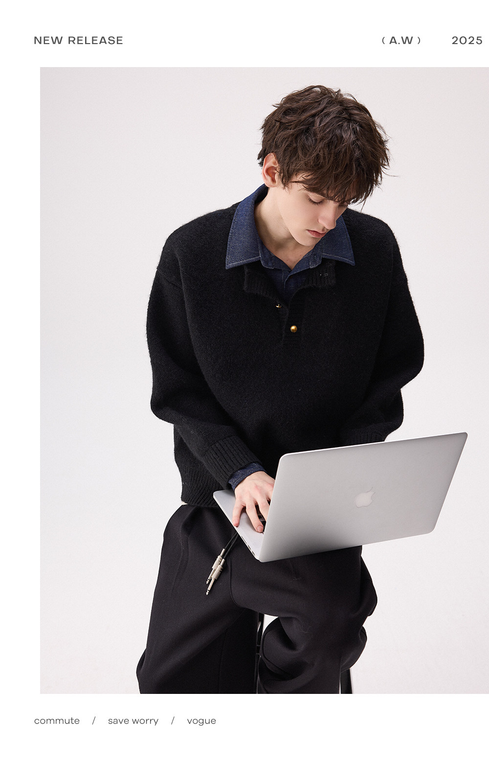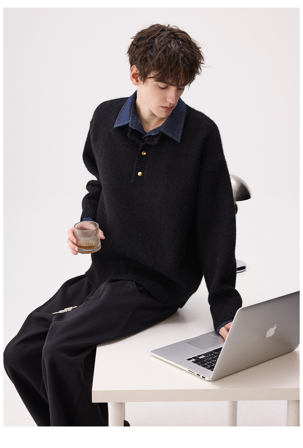 Chicerro Sicilian Men's Clothing with Artistic Design, Faux Two-Piece Denim Shirt Collar Sweater, Men's Inner Layer Top