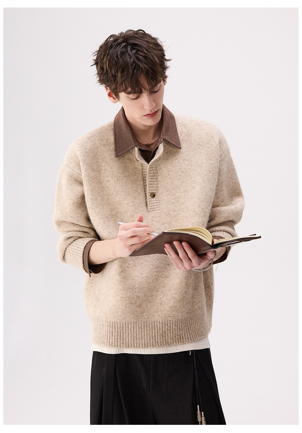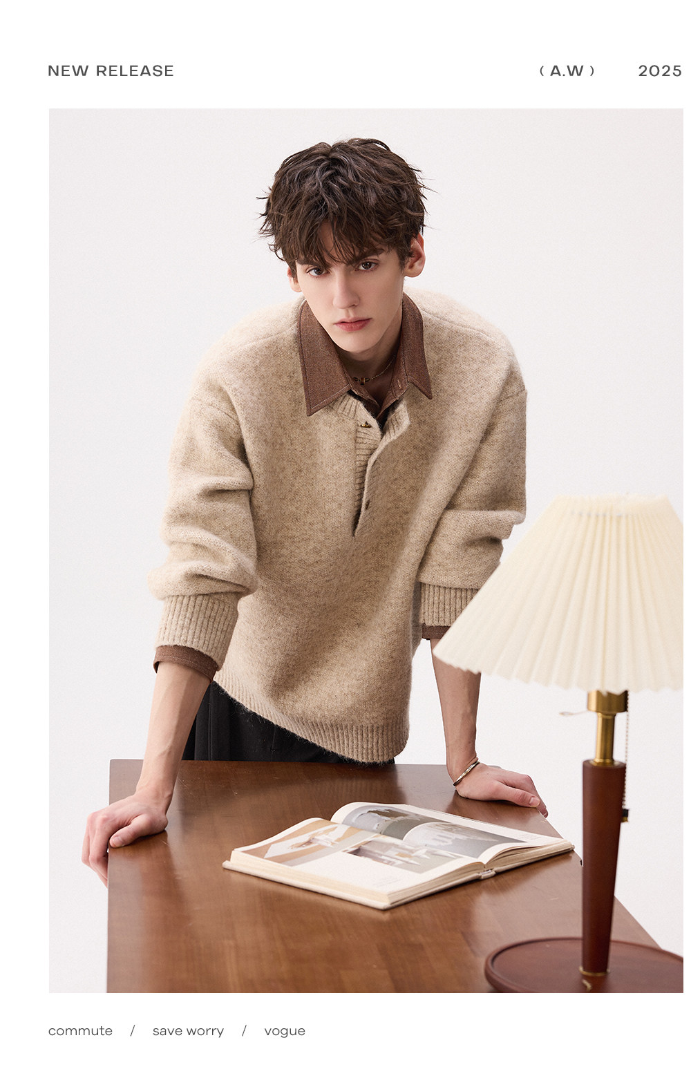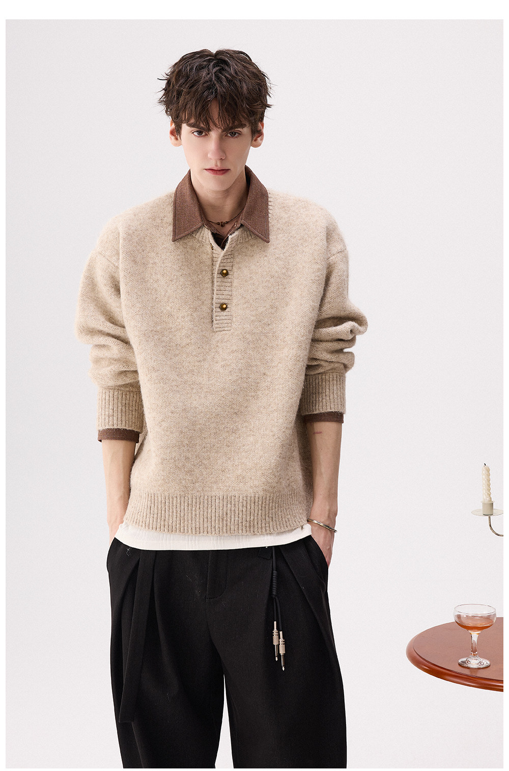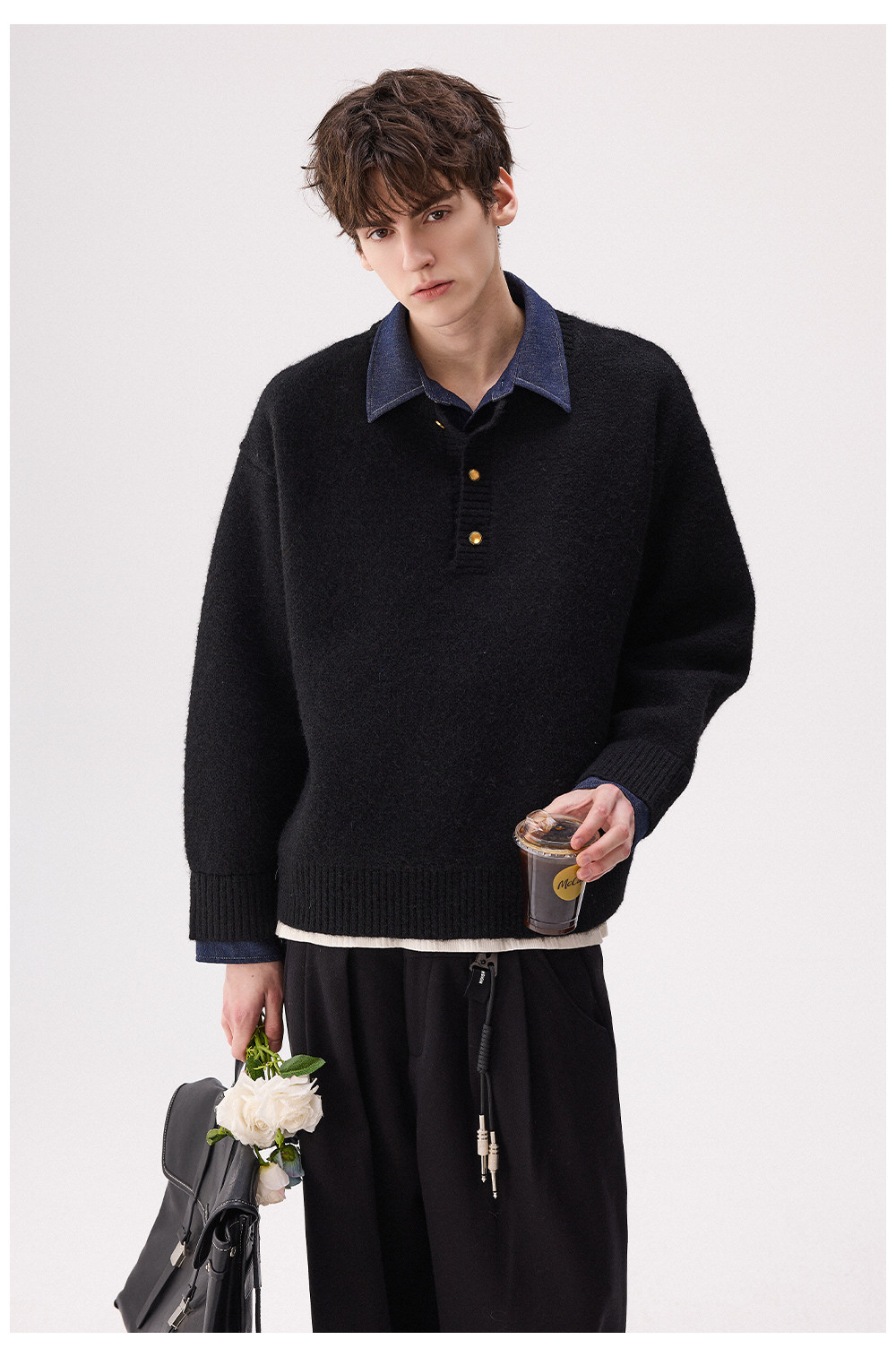 Chicerro Sicilian Men's Clothing with Artistic Design, Faux Two-Piece Denim Shirt Collar Sweater, Men's Inner Layer Top