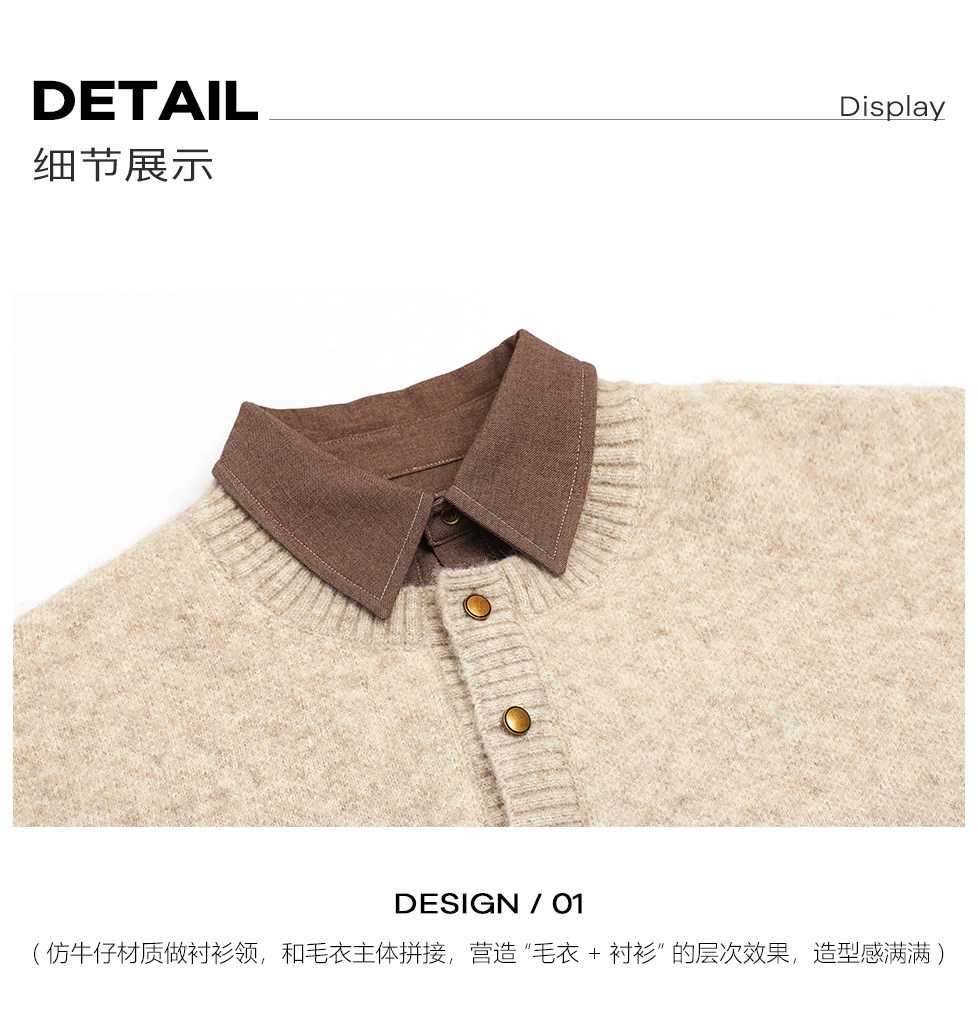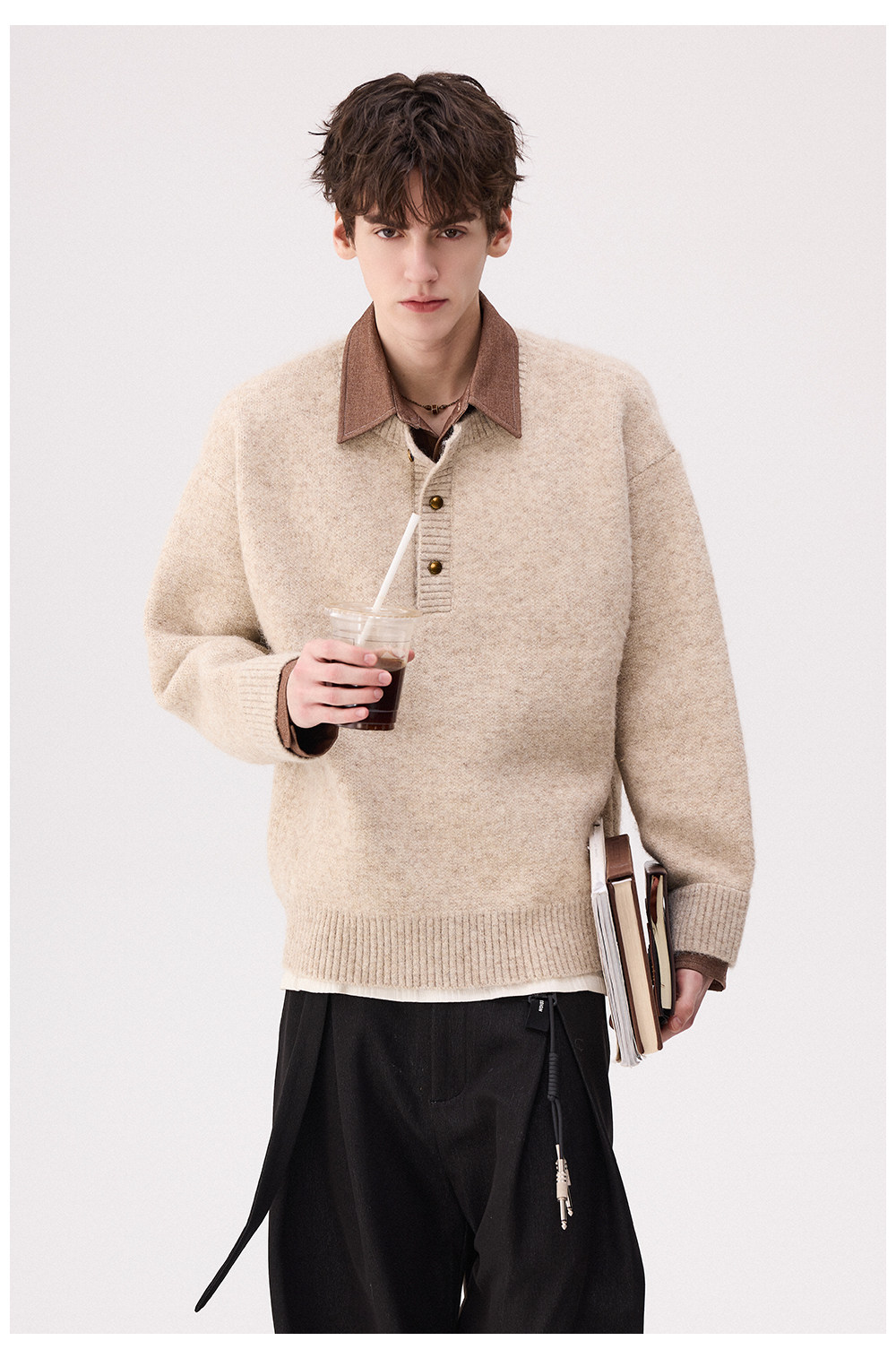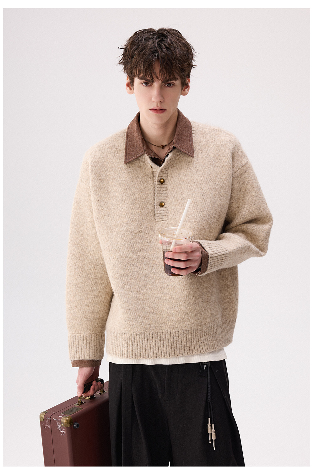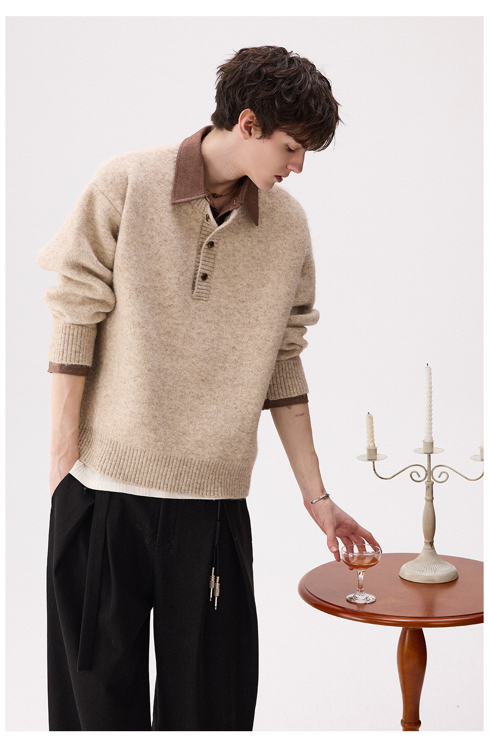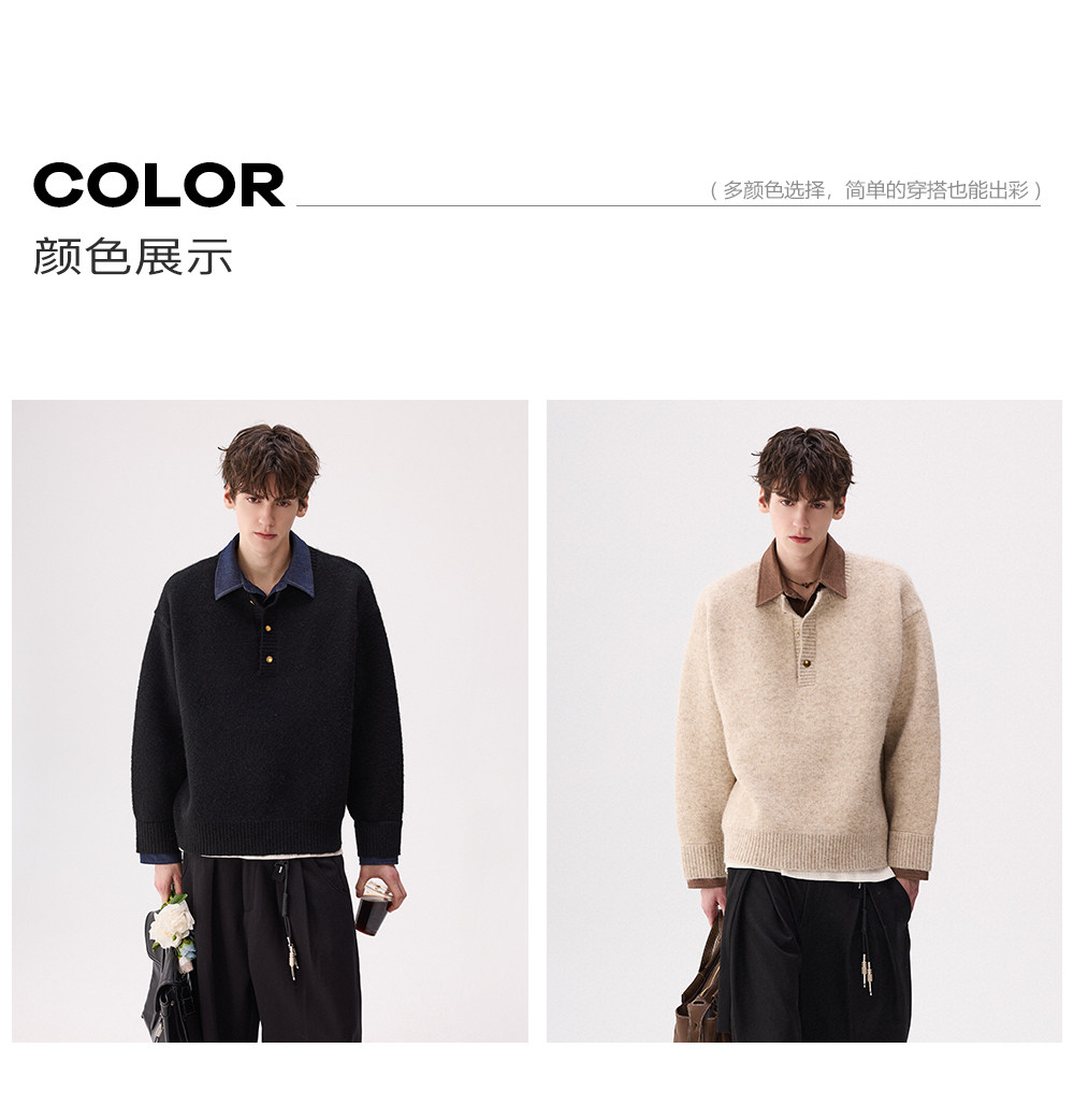 Chicerro Sicilian Men's Clothing with Artistic Design, Faux Two-Piece Denim Shirt Collar Sweater, Men's Inner Layer Top