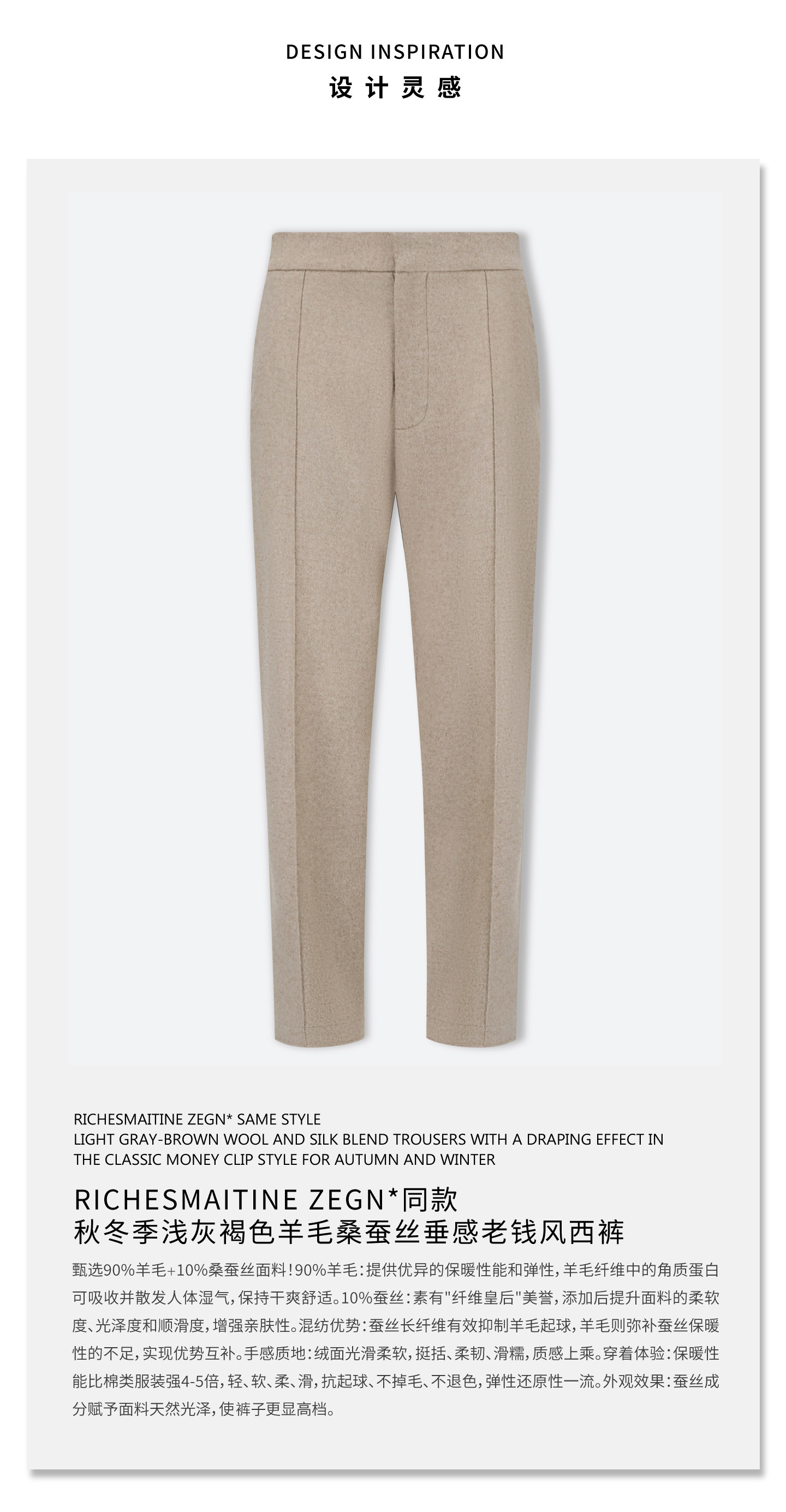Richesmaitine Zegn* Same Style Spring Light Taupe Wool and Mulberry Silk Old Money Style Trousers