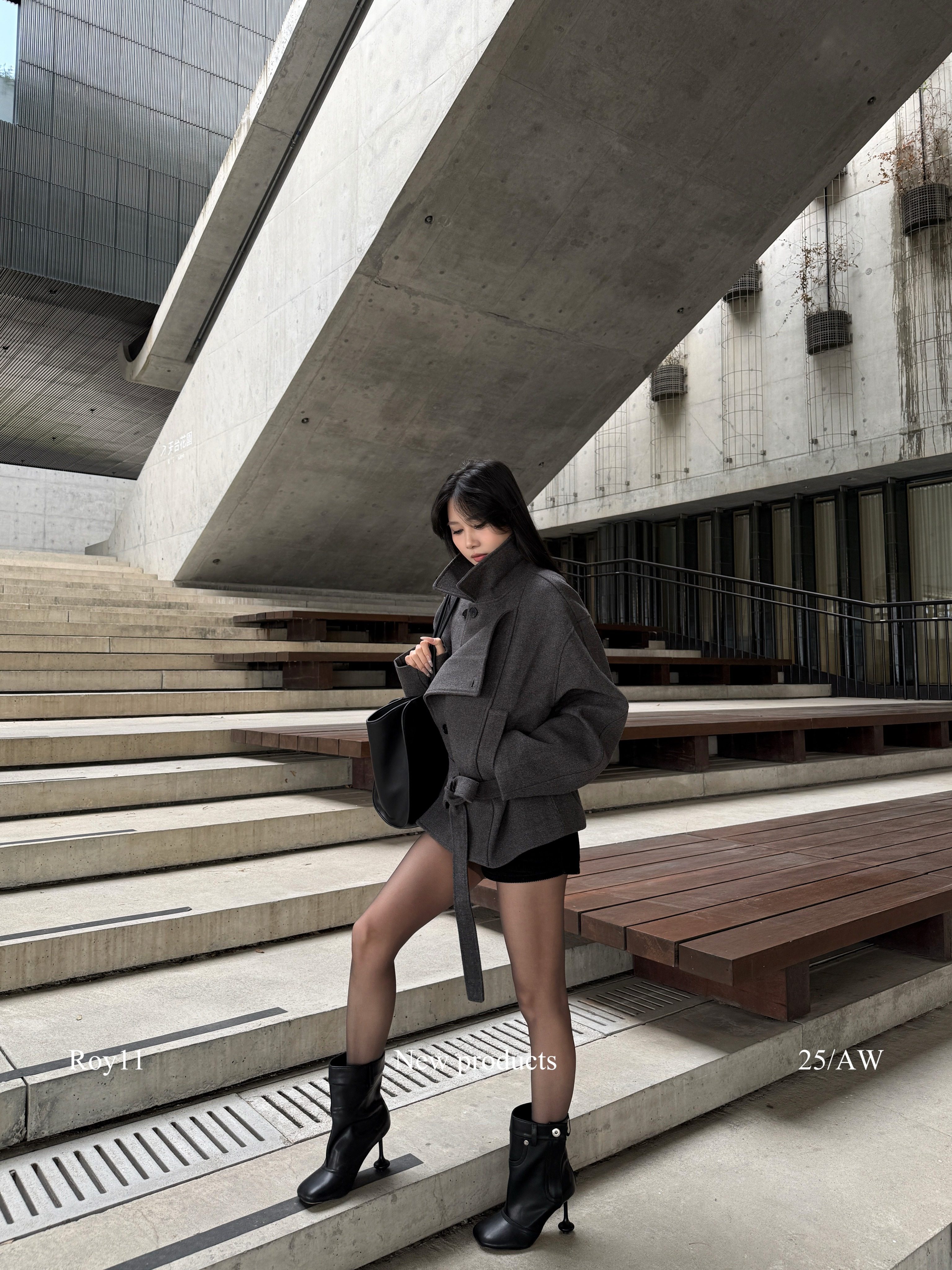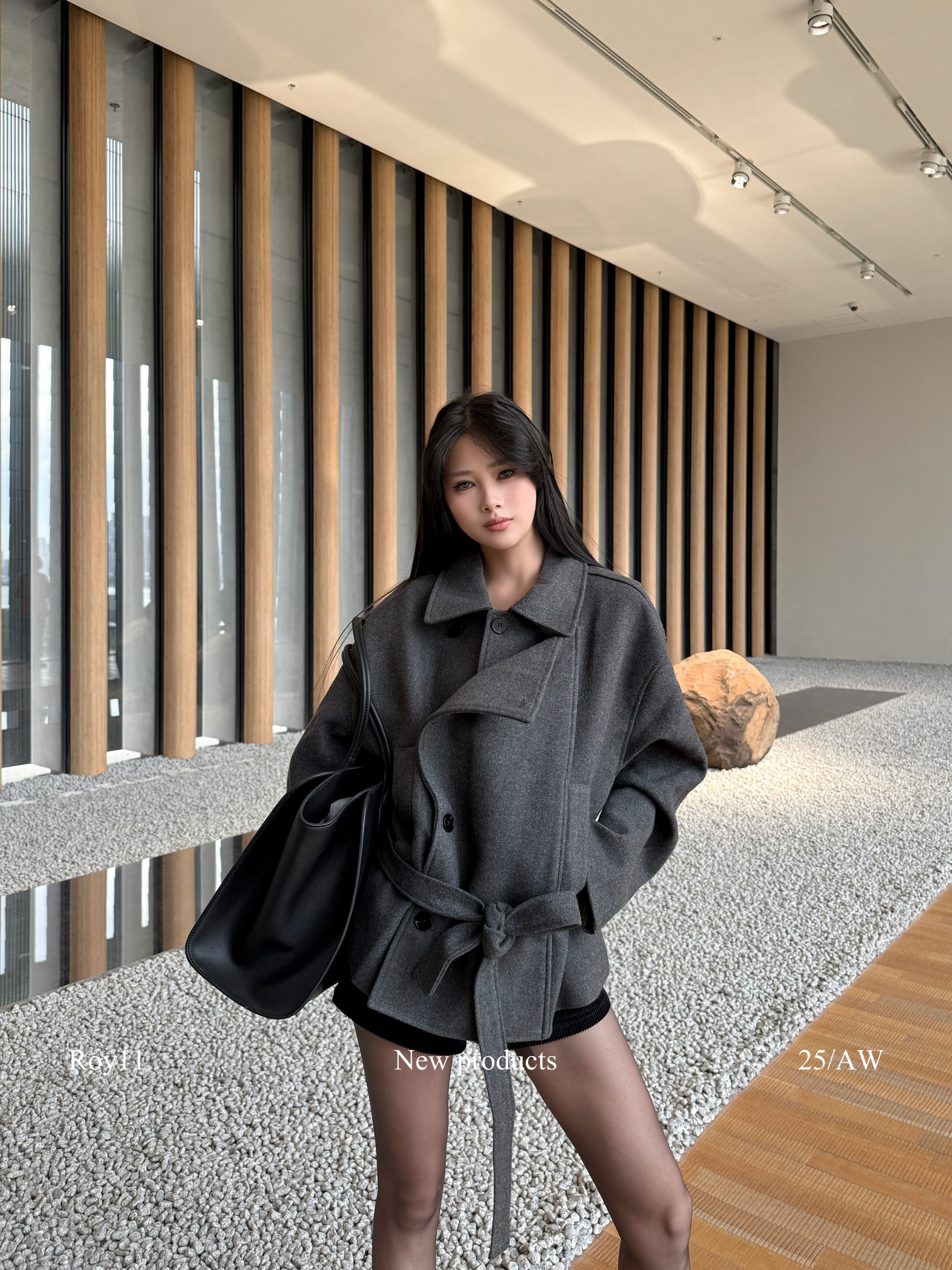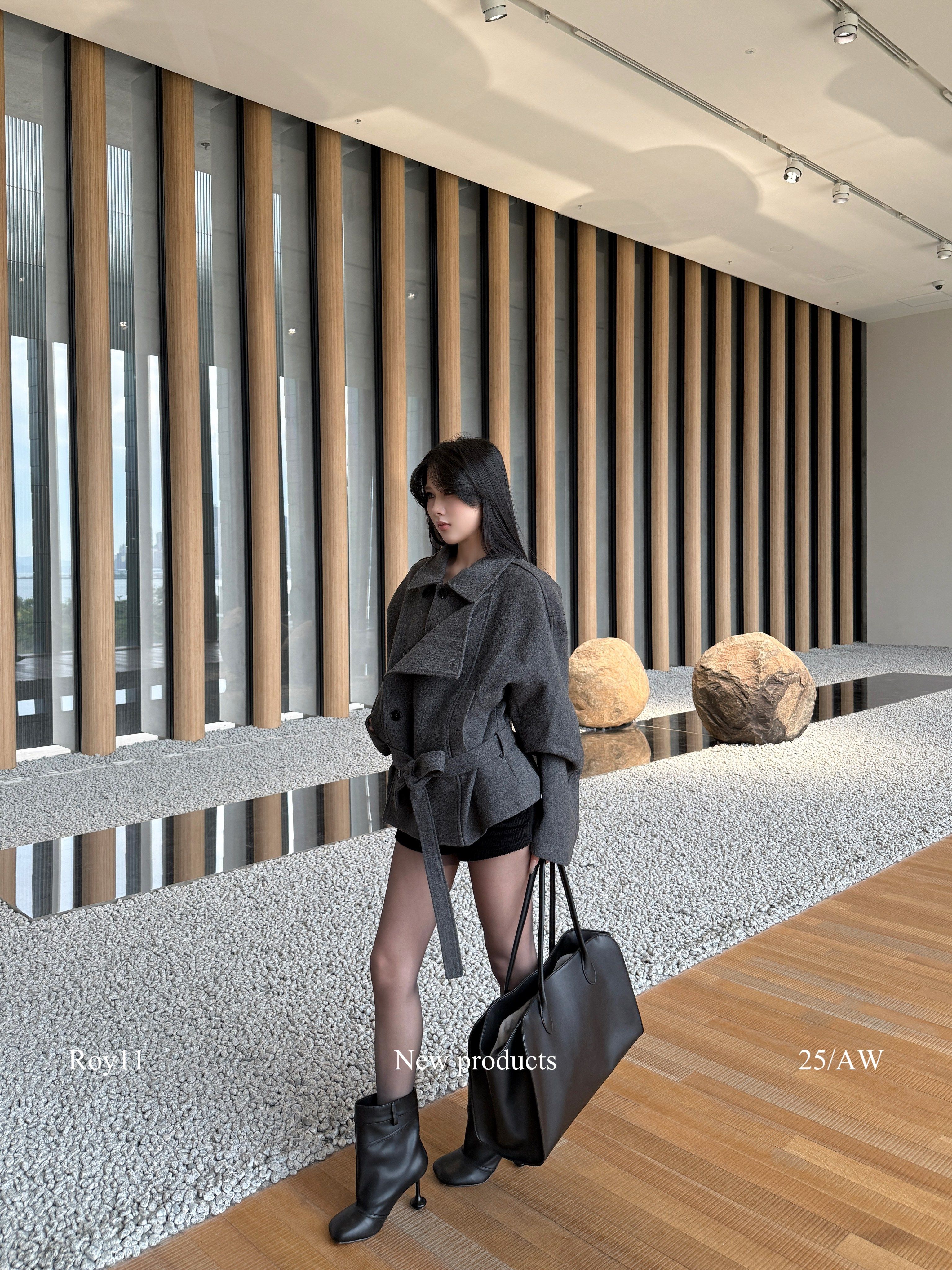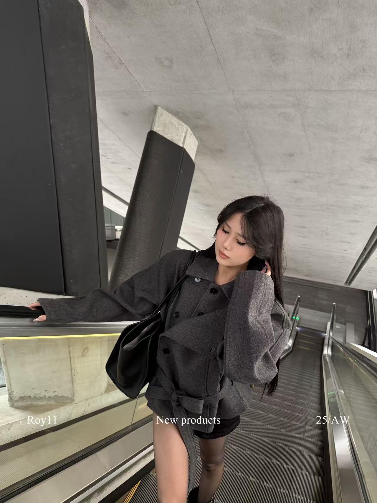 Roy11 Berlin Mist Gray Short Woolen Coat for Women Winter High-End Elegant Waist-Cinching Casual Top