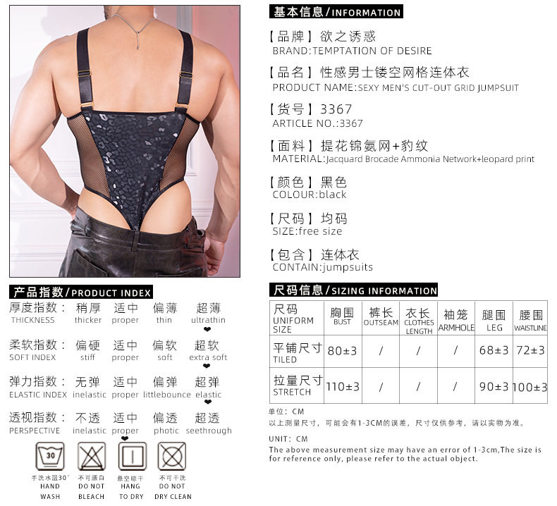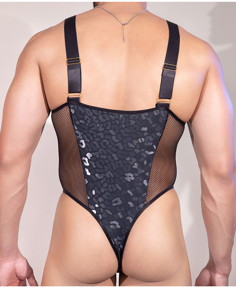 Sexy Men's Thong See-Through Mesh Splicing Leopard Print Men's Shapewear Bodysuit Camisole Underwear