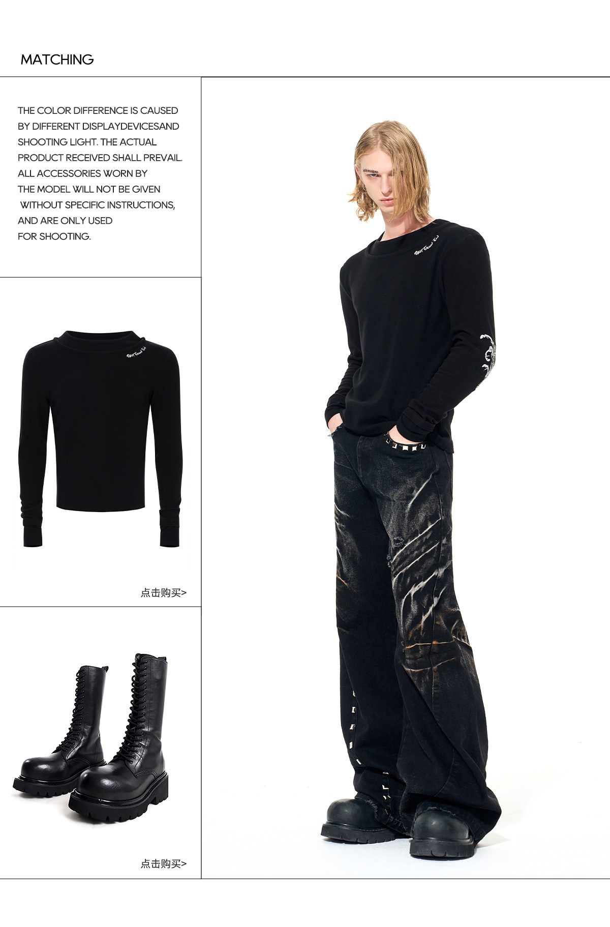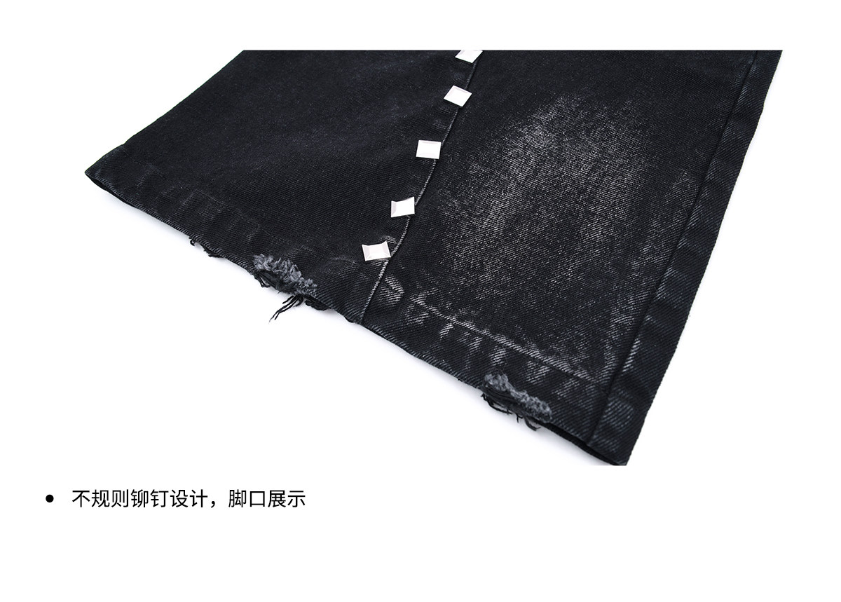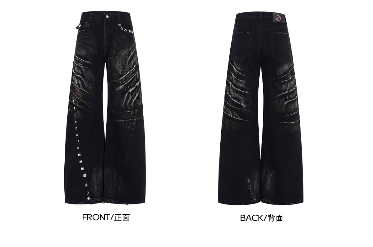 See【Lei Songran's Style】Vintage Washed Distressed Whiskered Denim Jeans for Men, Autumn and Winter Studded Design Wide-Leg Pants