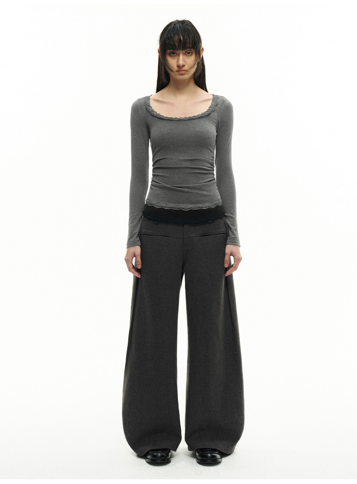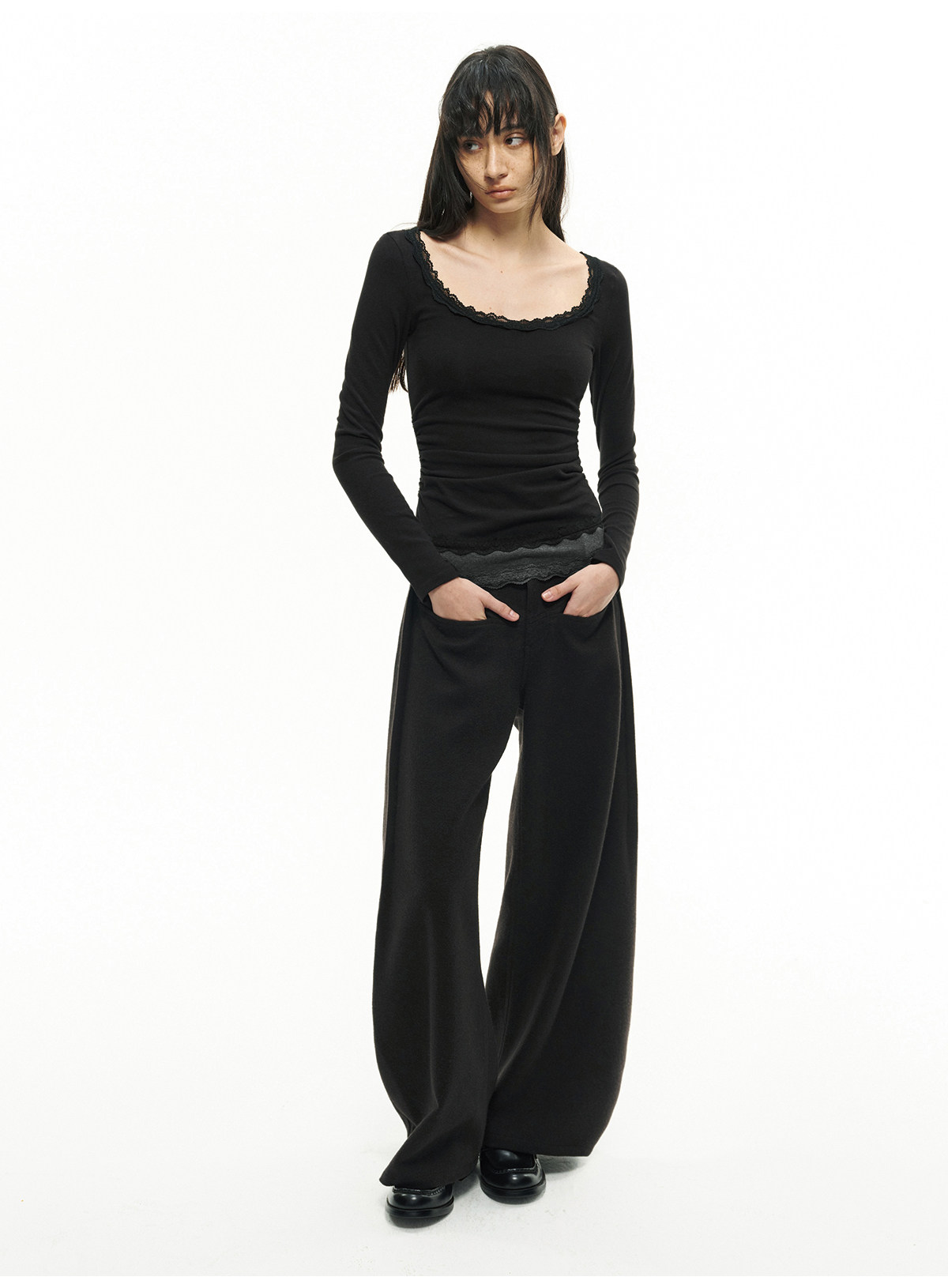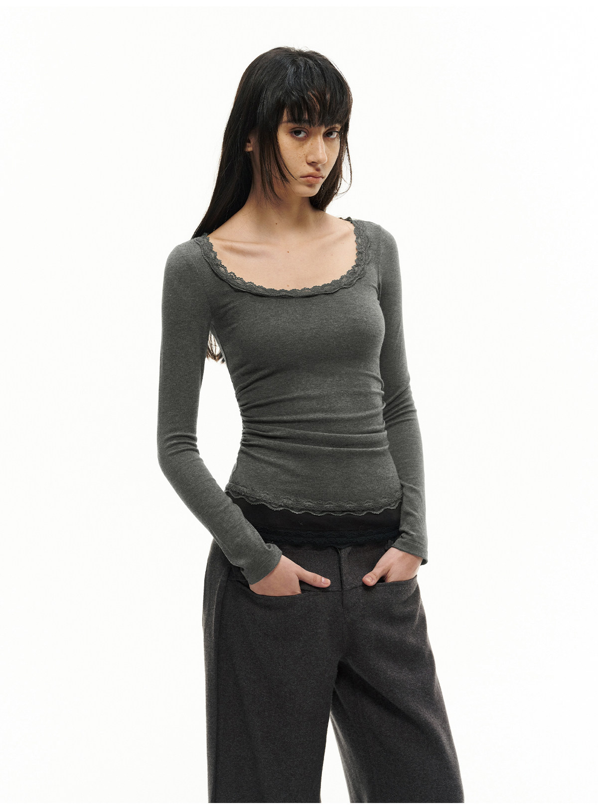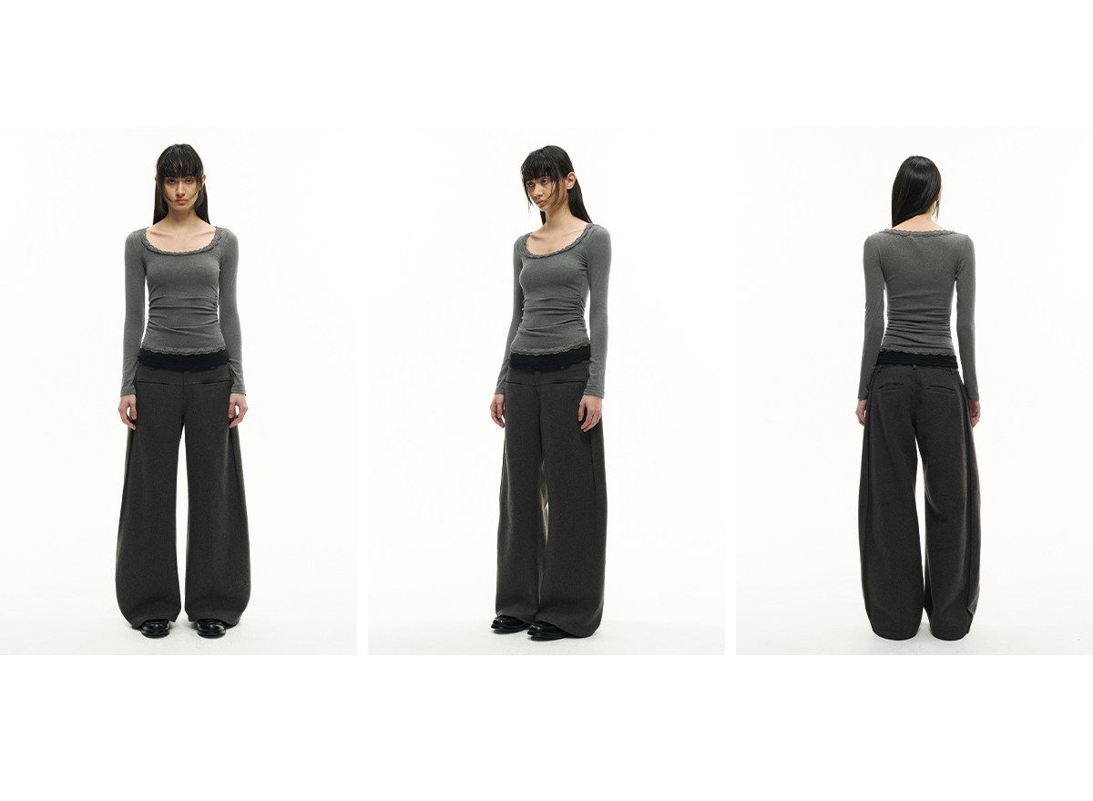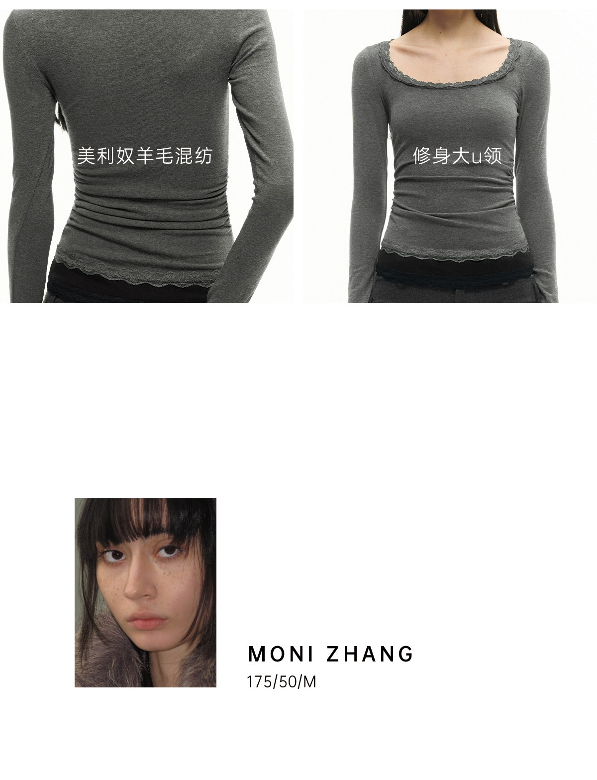 Jcaesar Women Pleated Lace Patchwork Base Shirt Merino Wool Blend Large U-Neck Slim Fit T-Shirt
