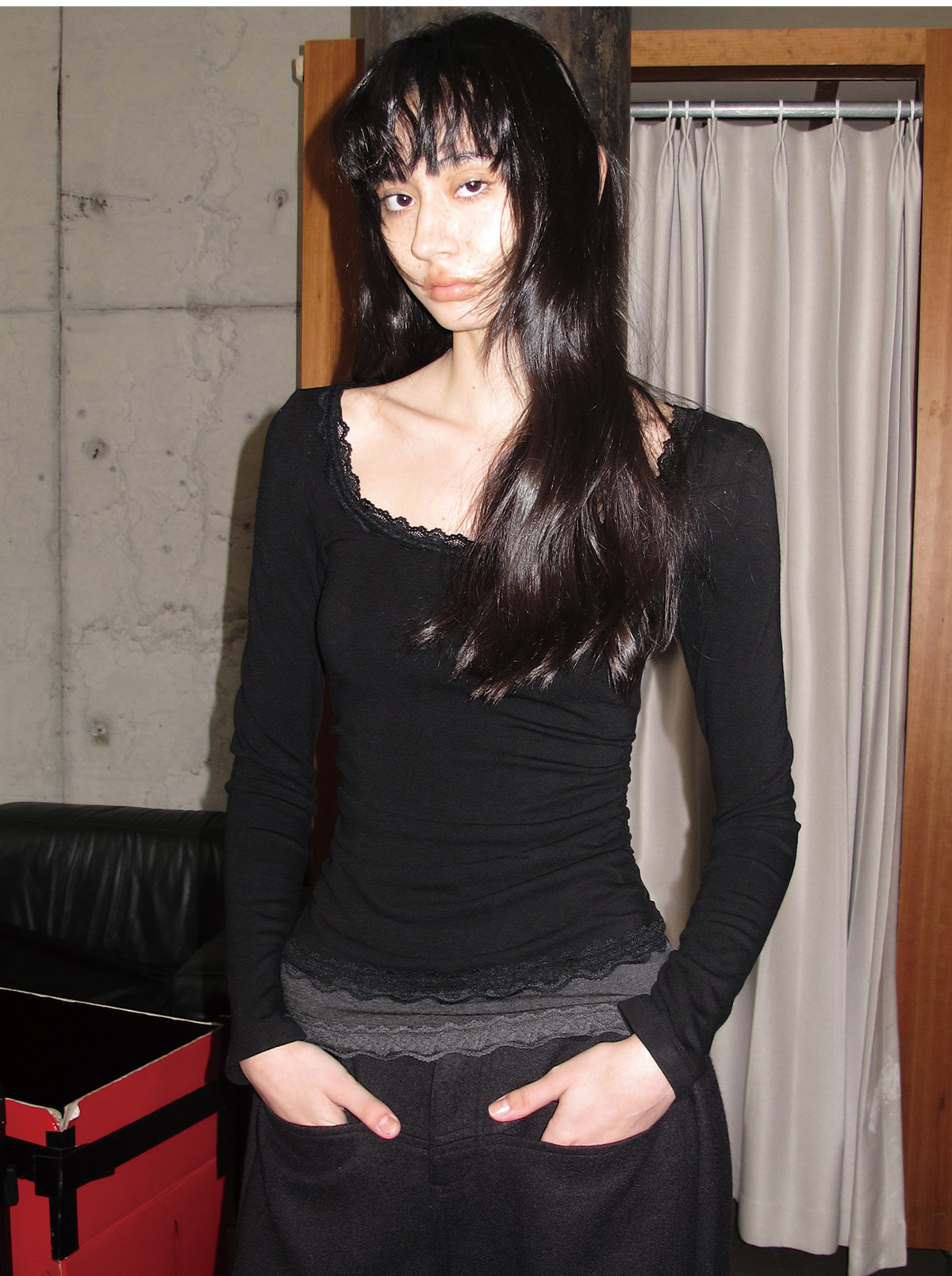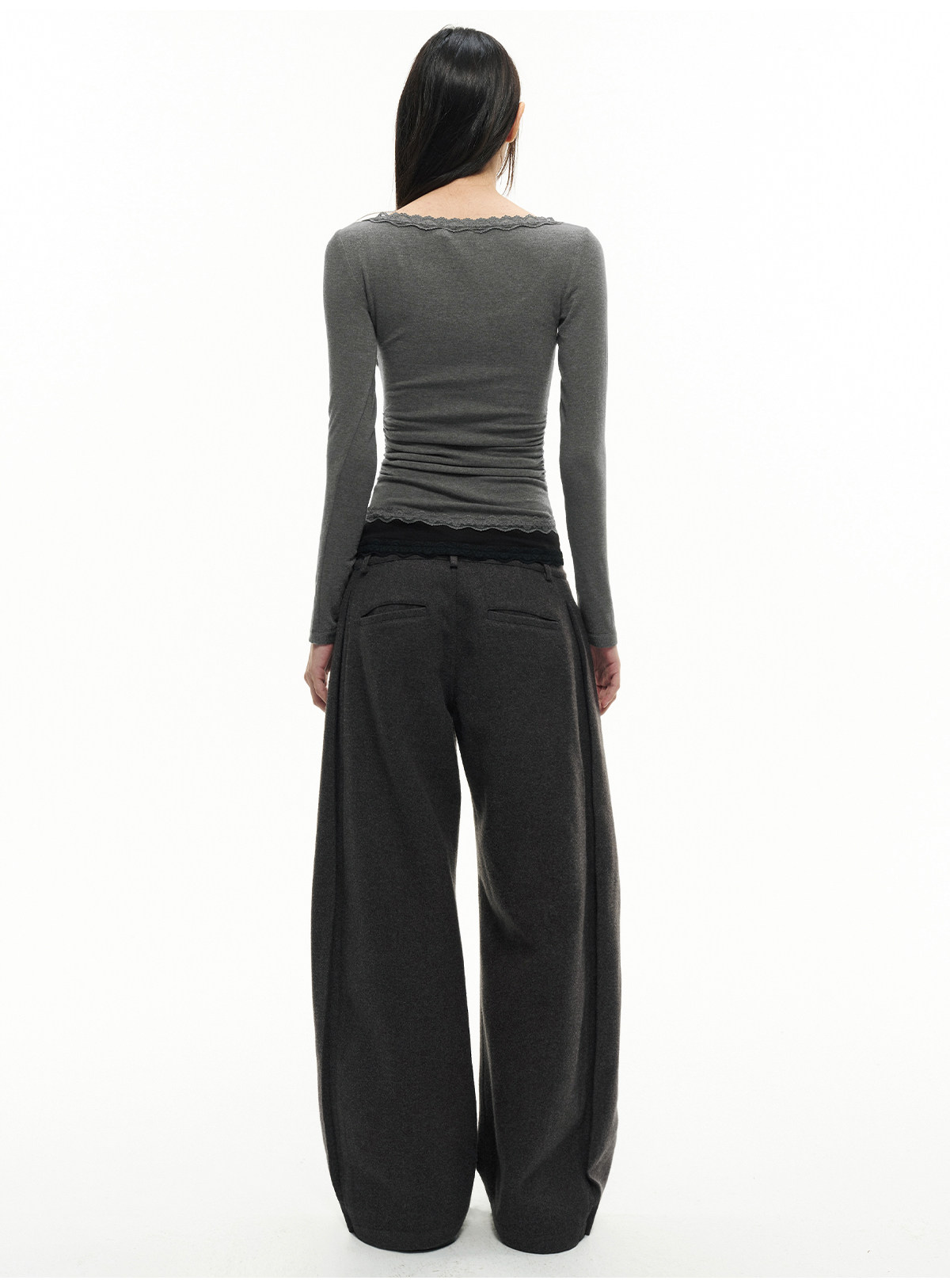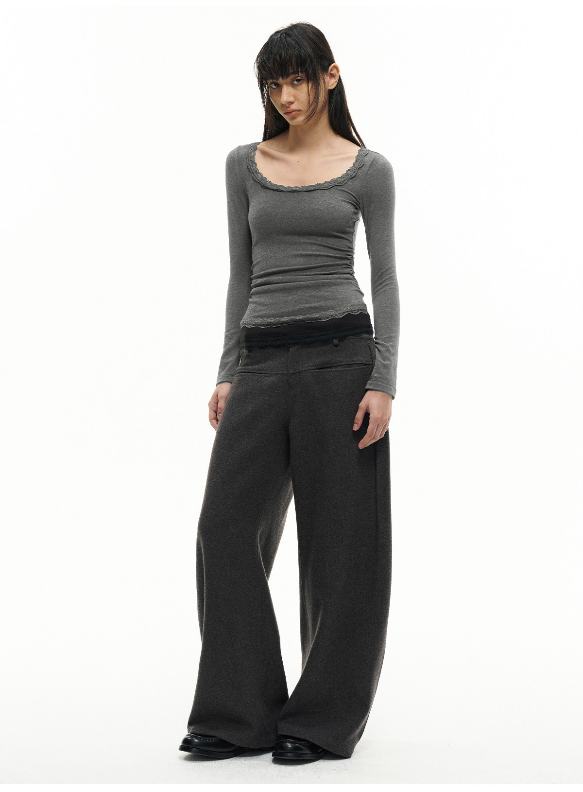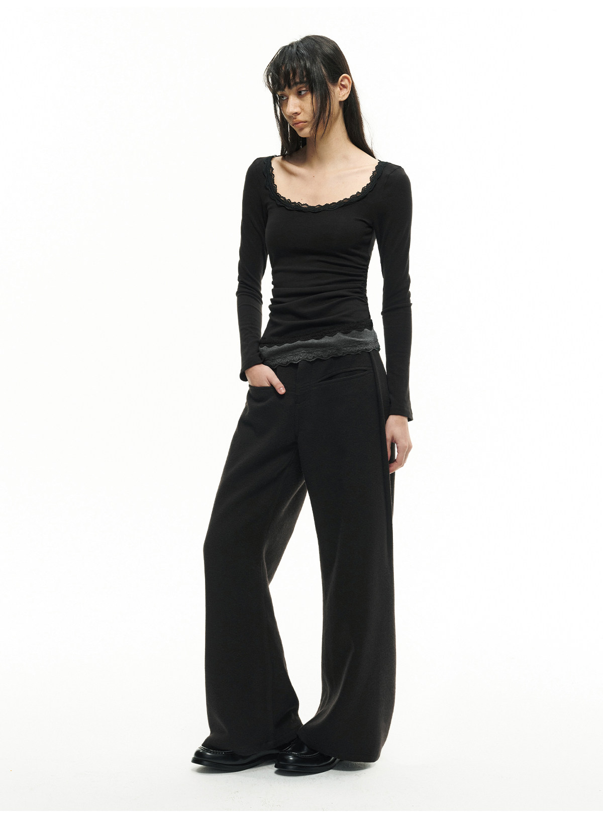 Jcaesar Women Pleated Lace Patchwork Base Shirt Merino Wool Blend Large U-Neck Slim Fit T-Shirt