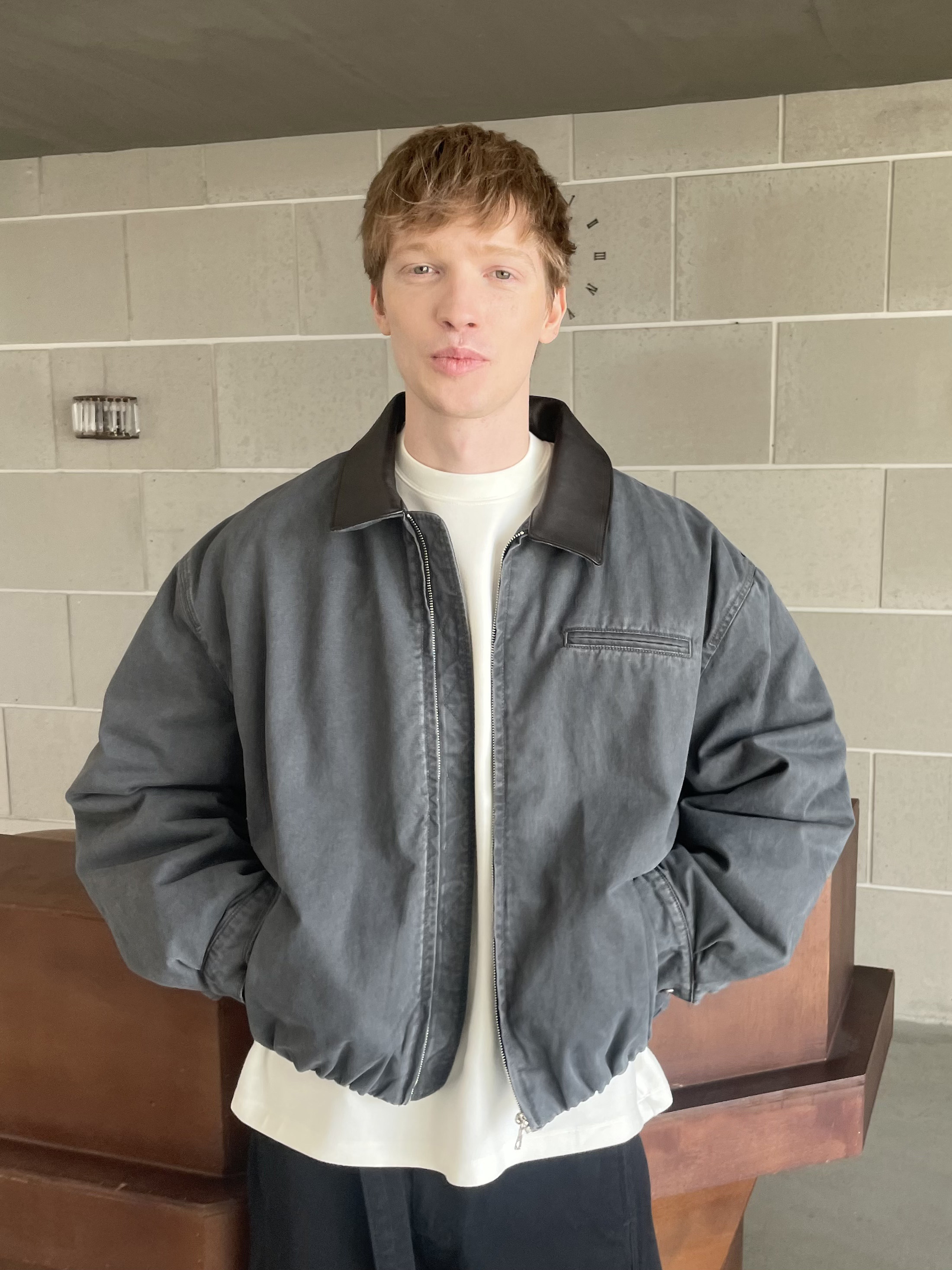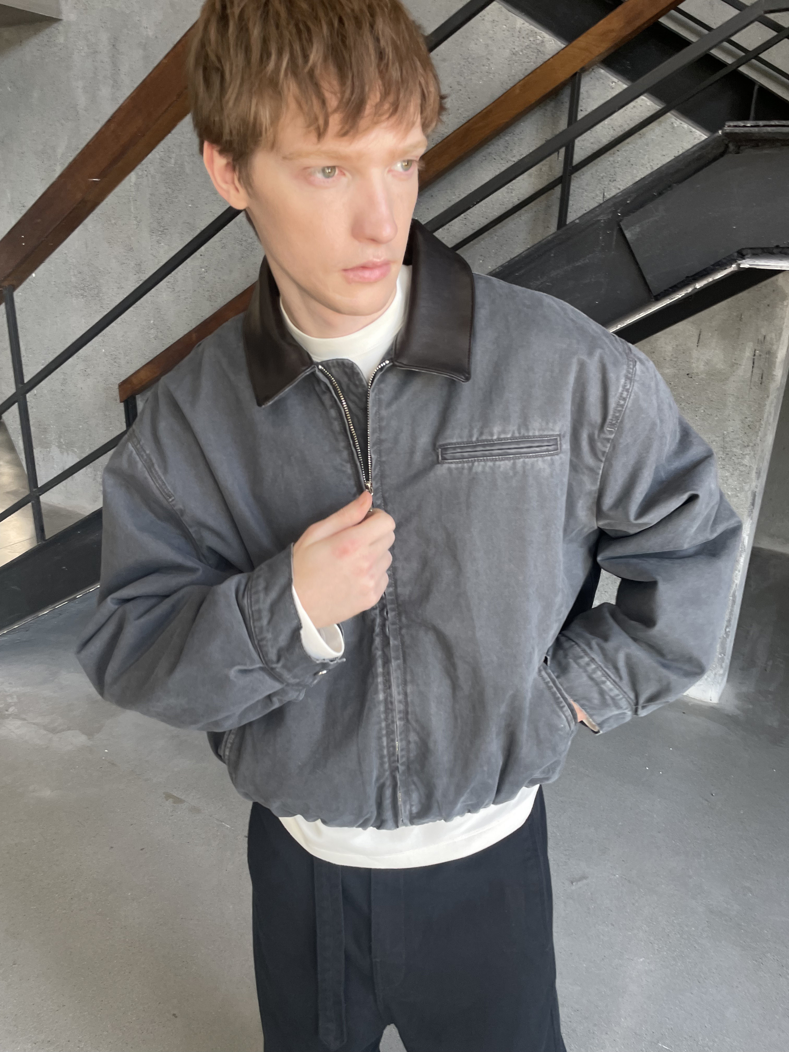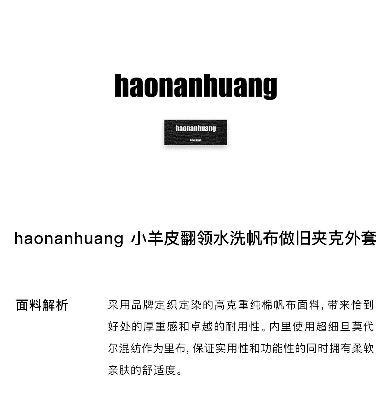 Haonanhuang Sheepskin Lapel Washed Canvas Distressed Short Wide Waist-Cinching Cotton Jacket with Zipper
