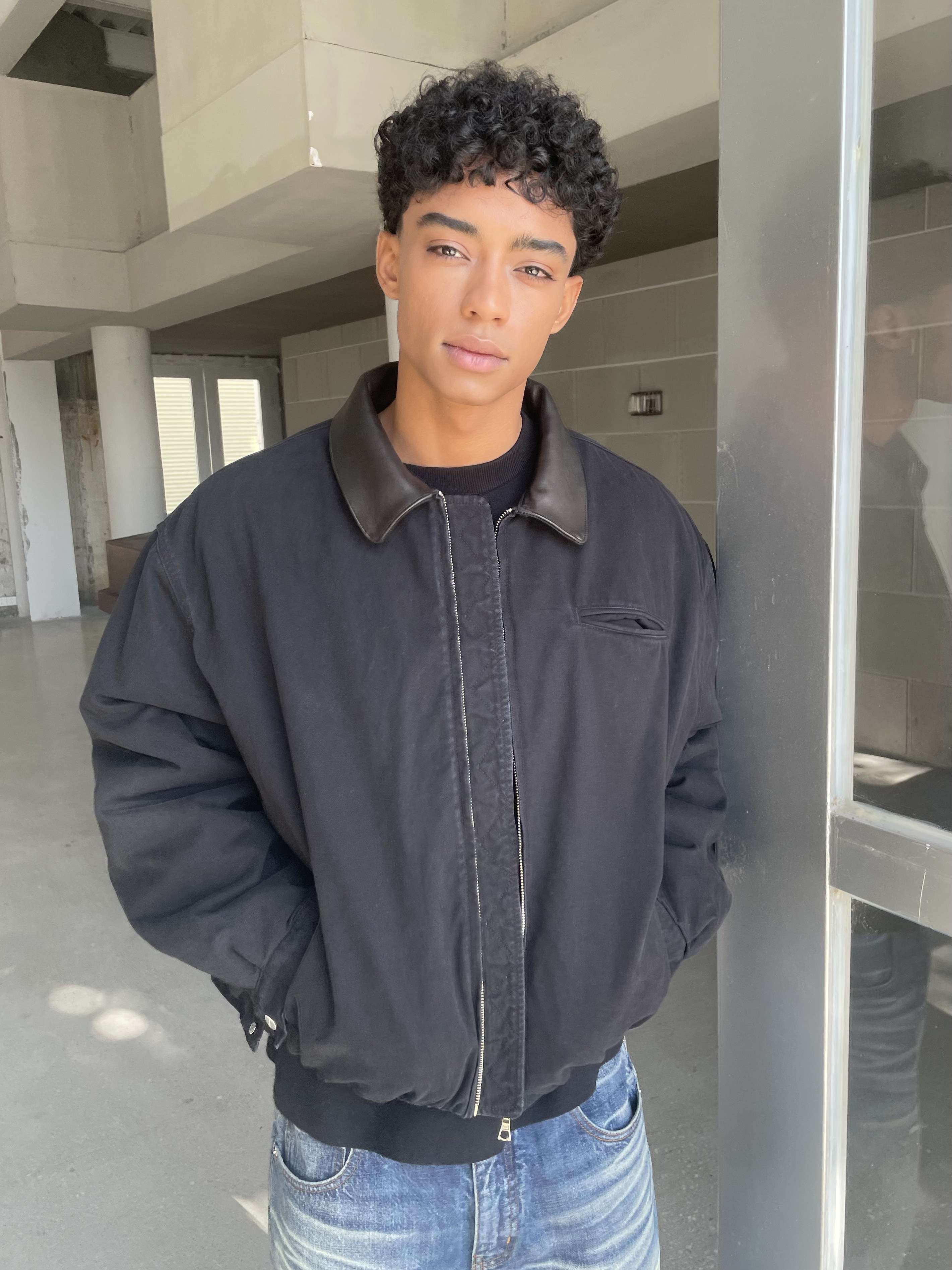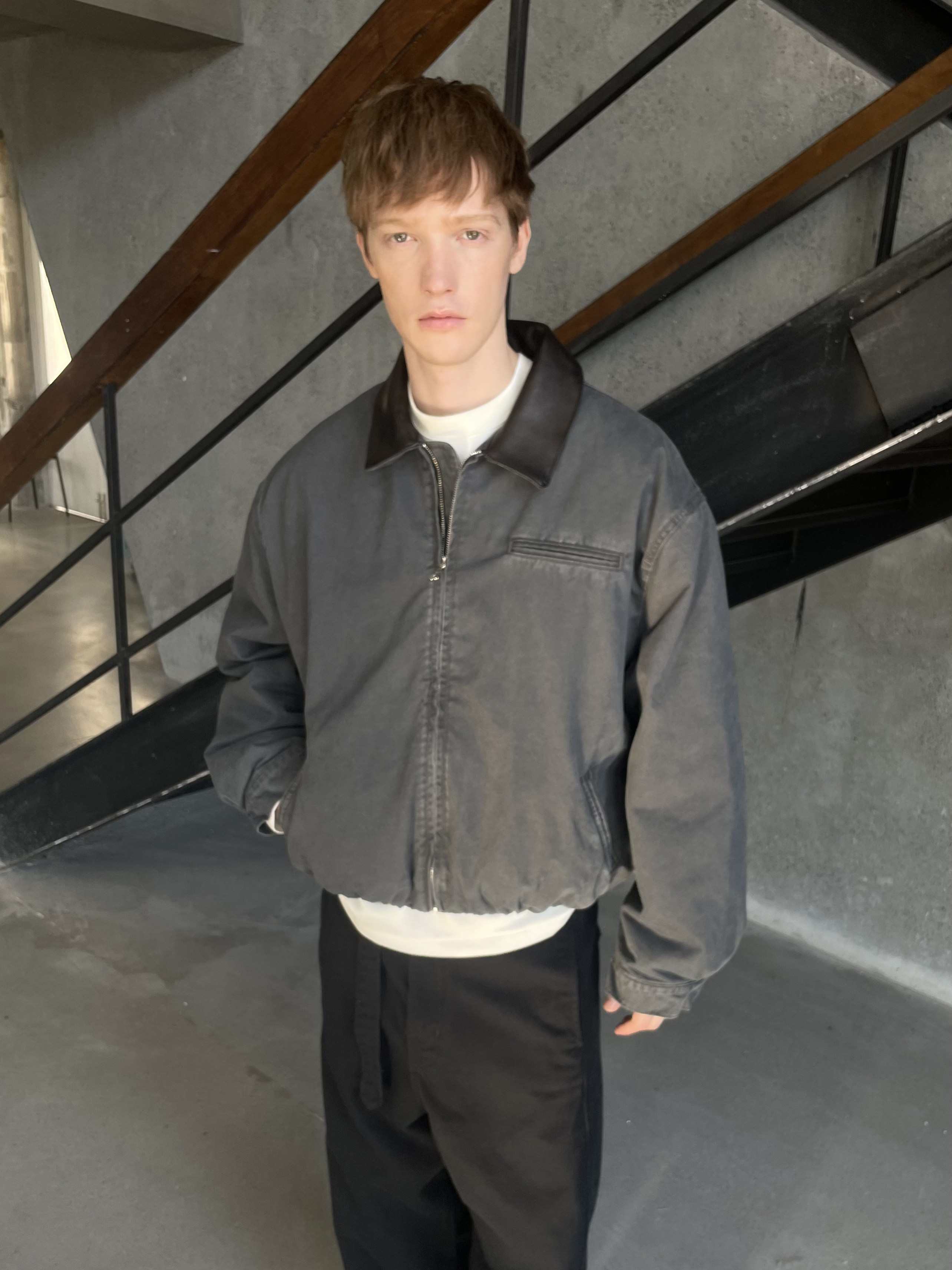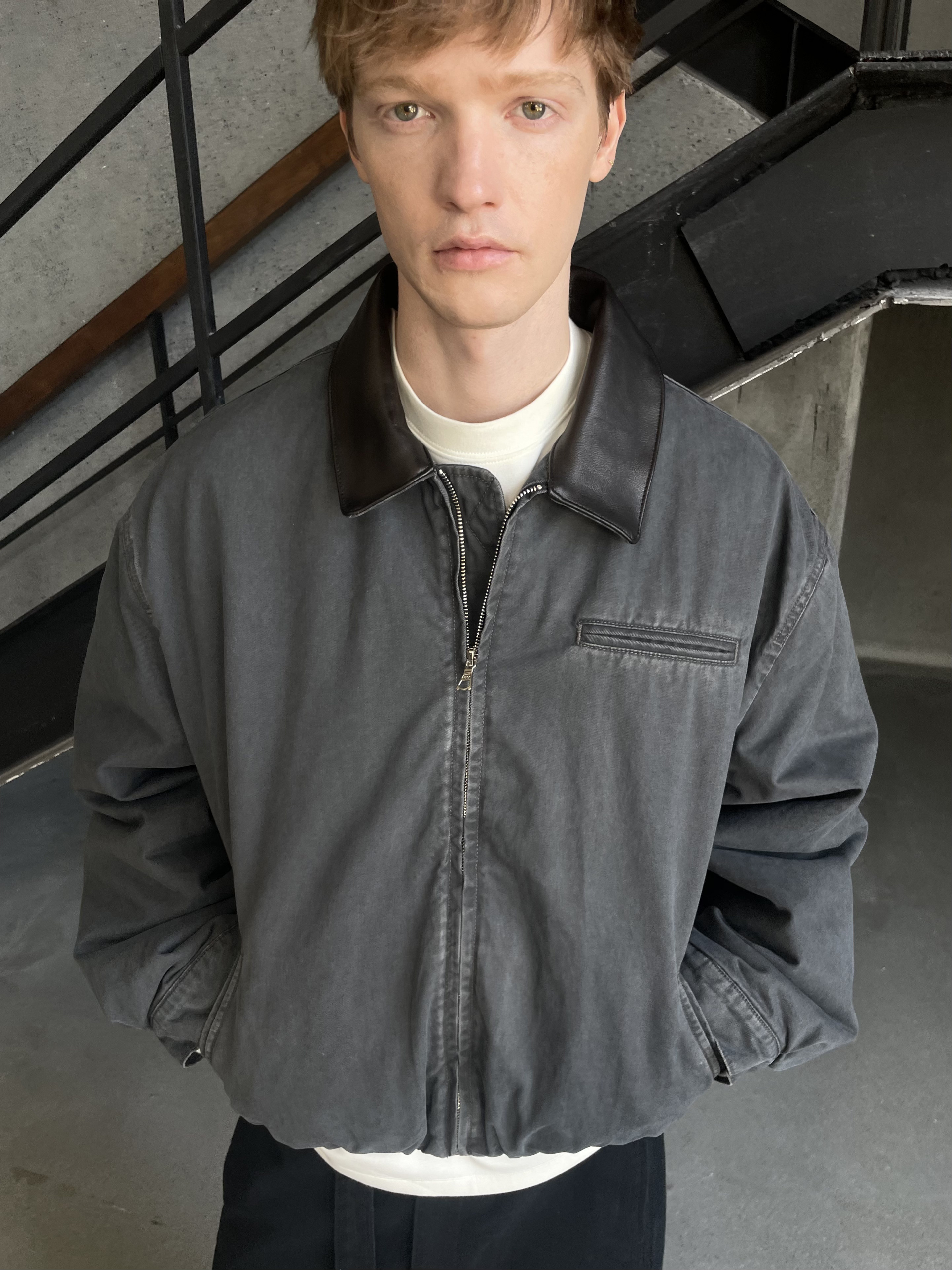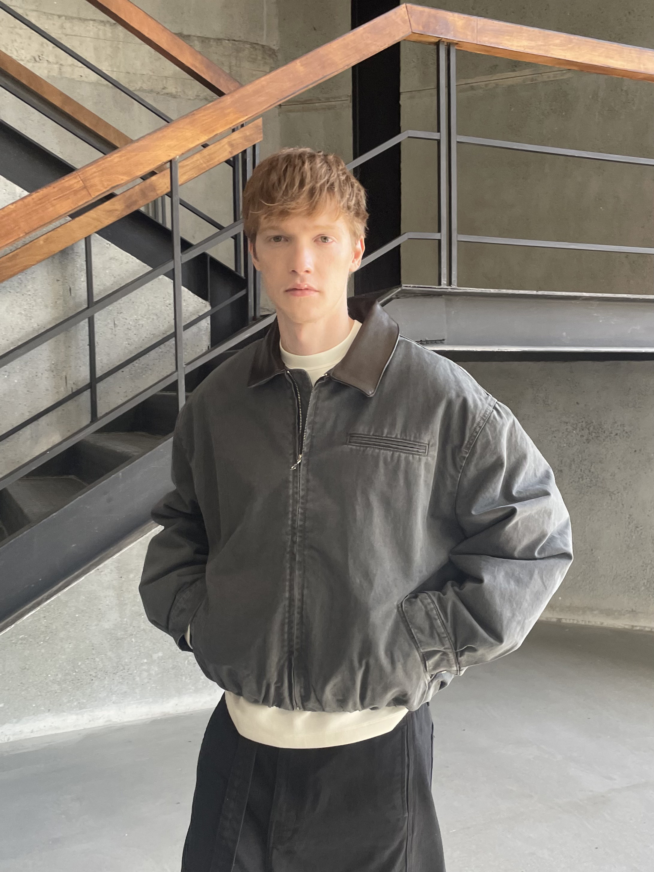 Haonanhuang Sheepskin Lapel Washed Canvas Distressed Short Wide Waist-Cinching Cotton Jacket with Zipper
