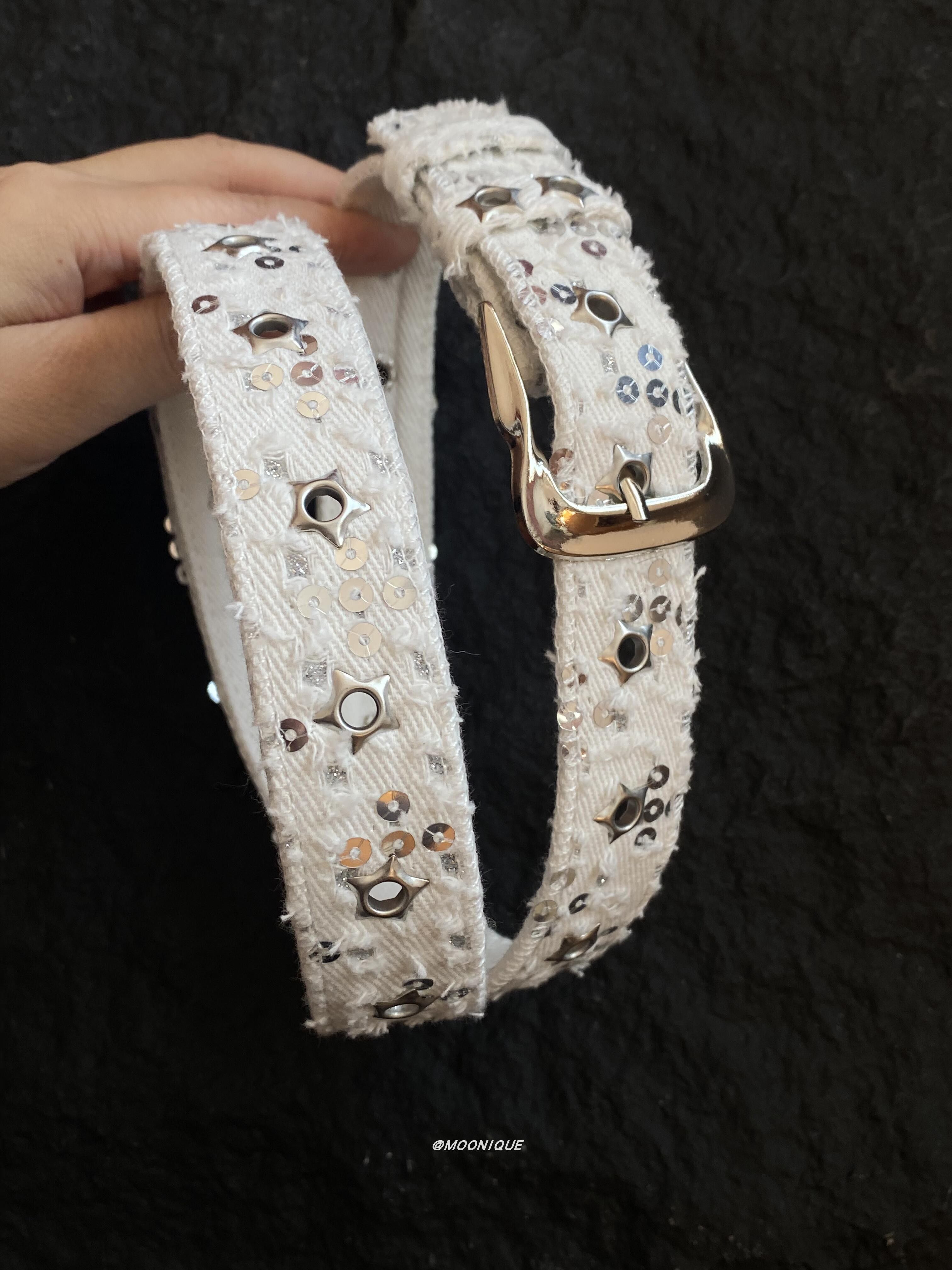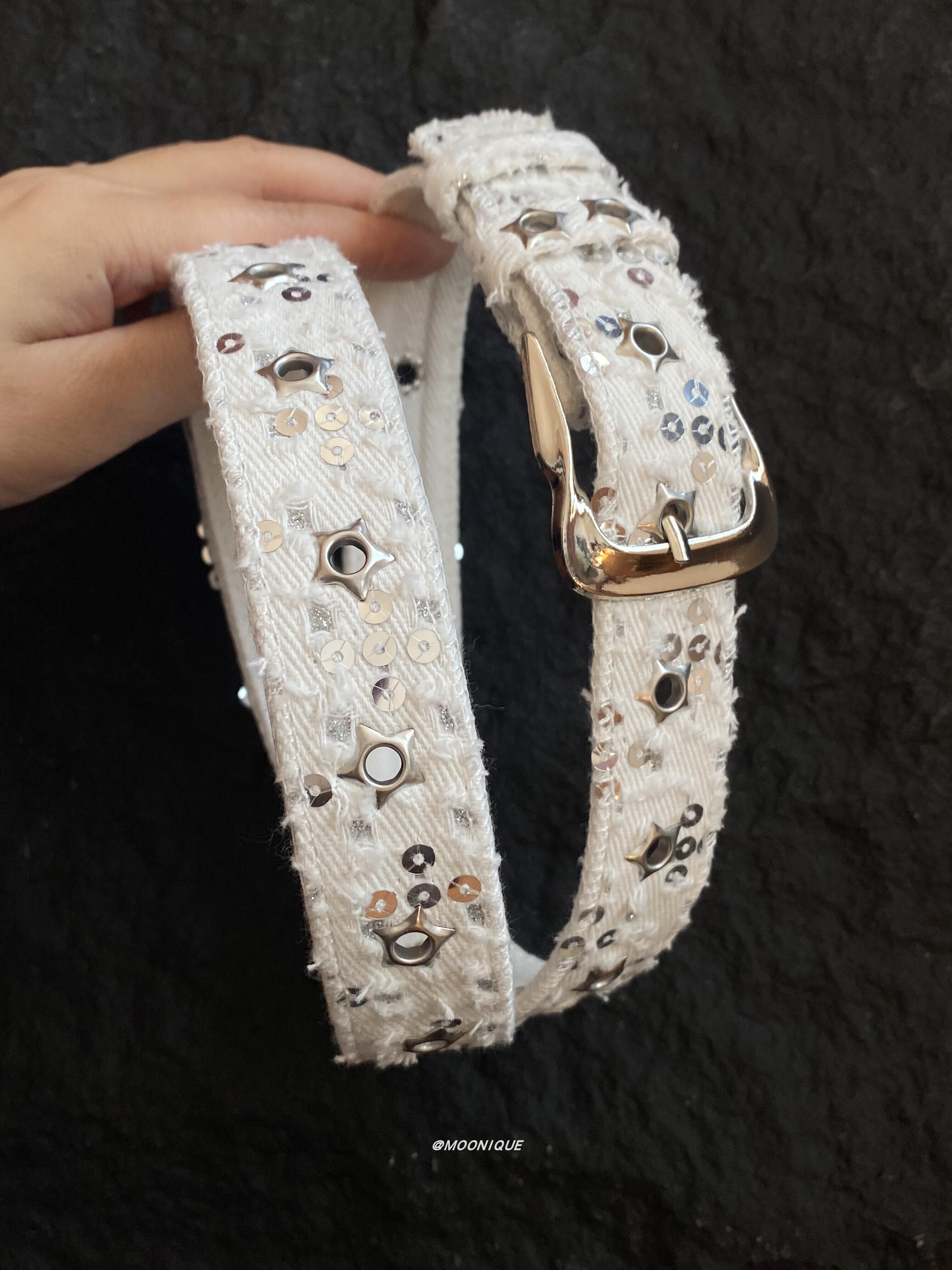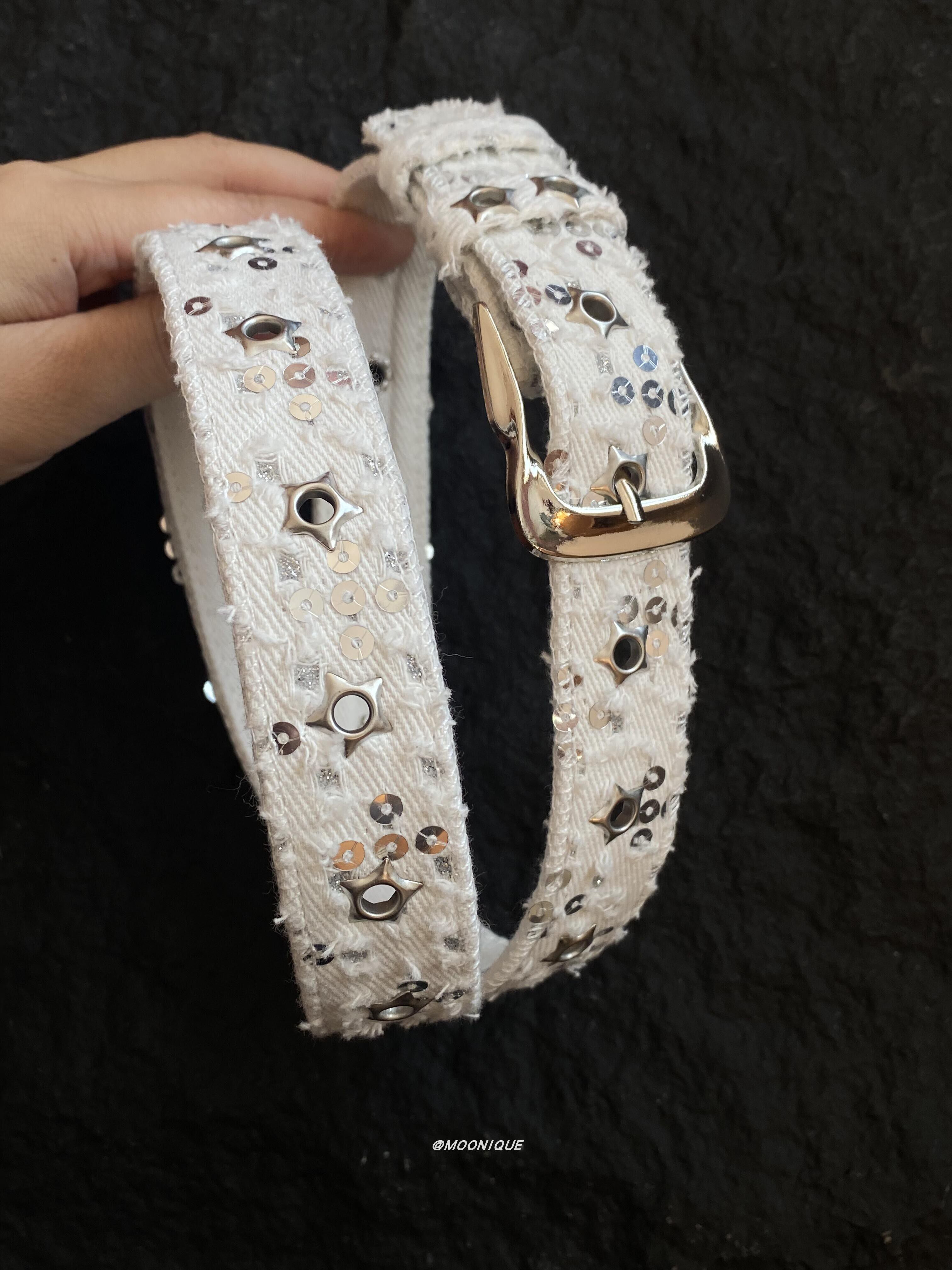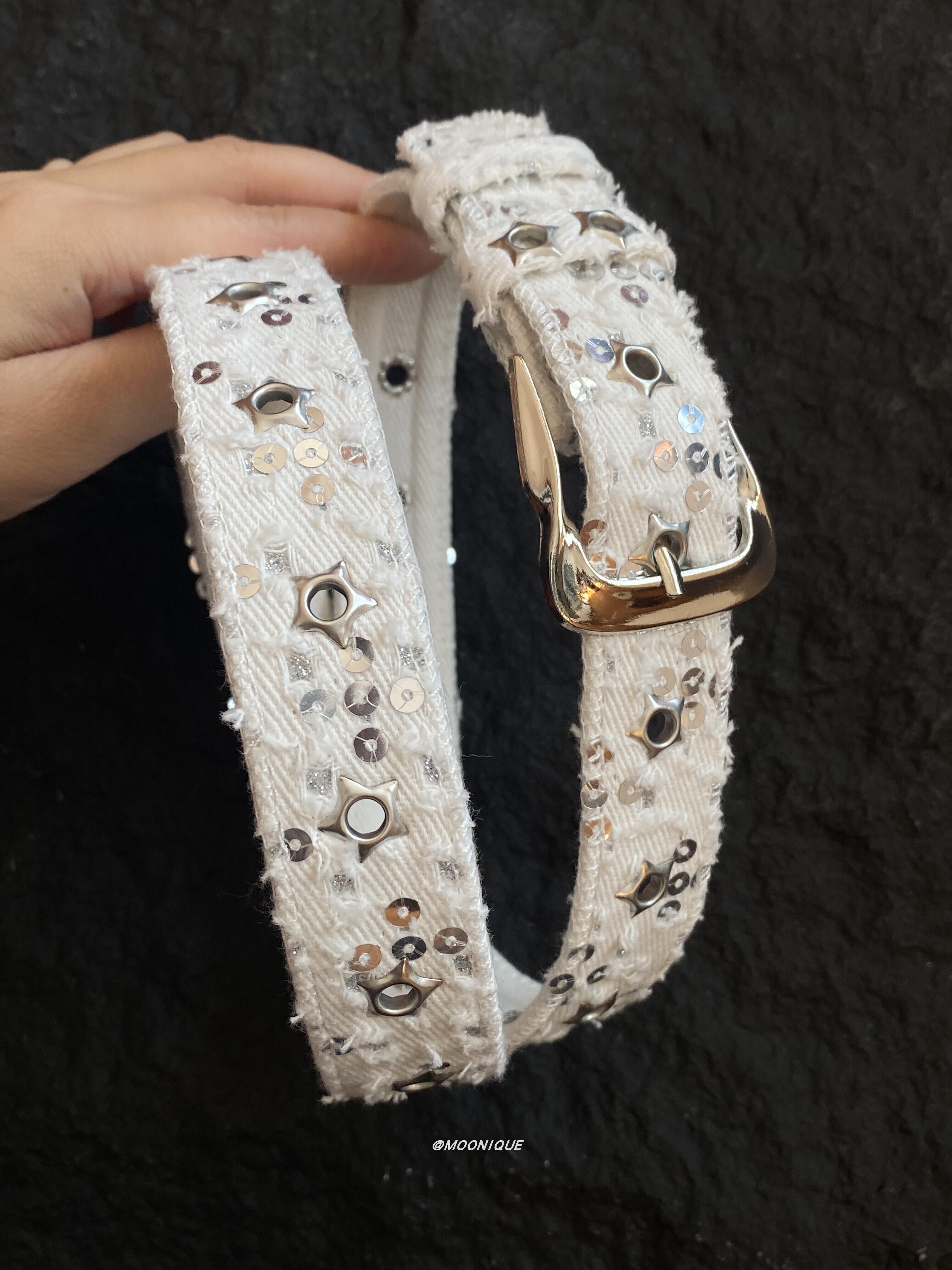 New White Denim Canvas Star Sequin Belt Punk Style Y2K Hot Girl Matching Jeans Short Skirt Belt Trendy